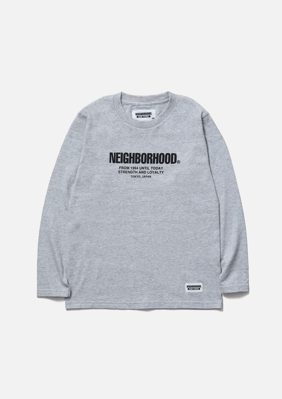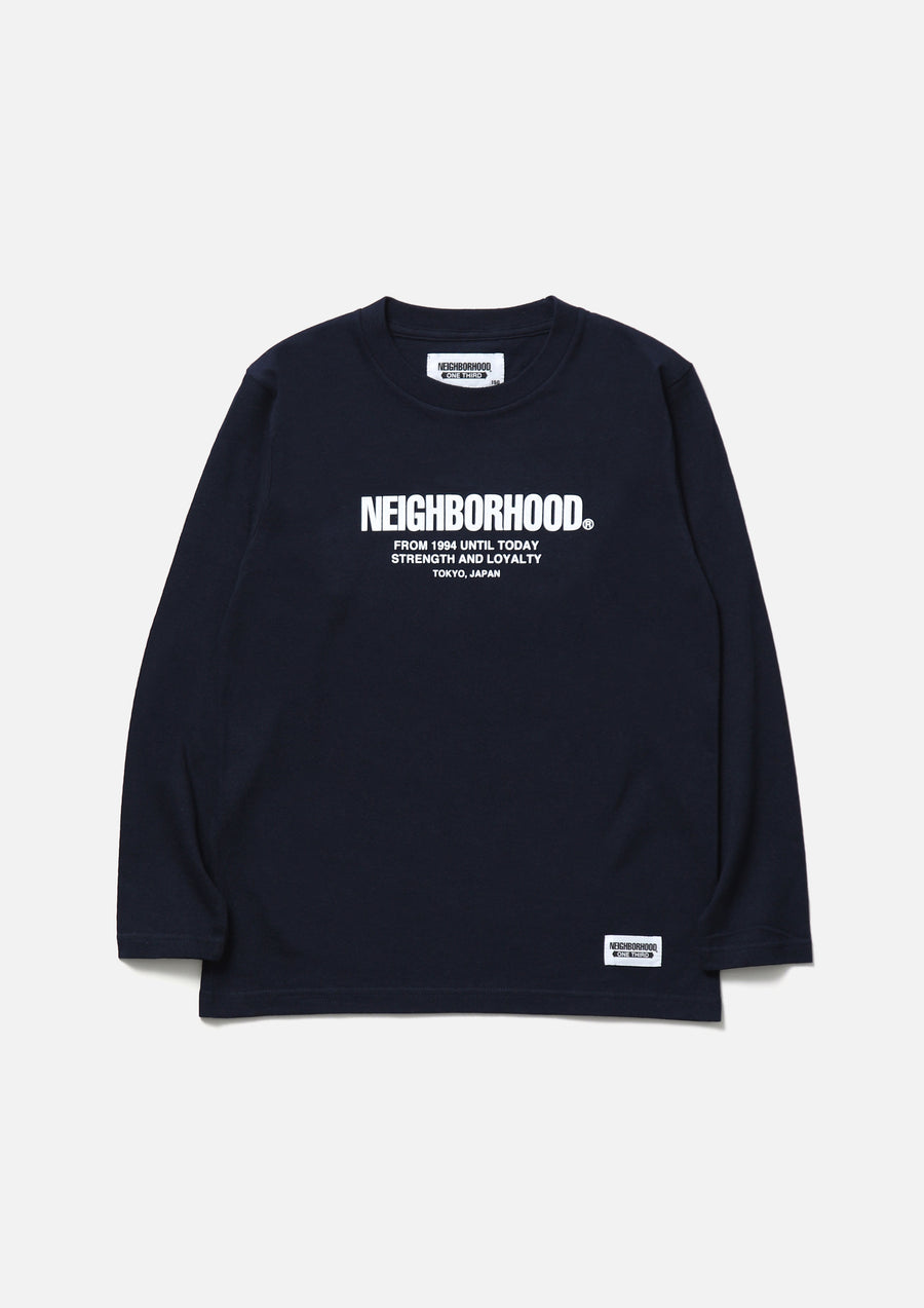 A long-sleeve T-shirt made of a 5.6oz heavyweight body. Printed logo on the front. A name tag is placed on the left hem.