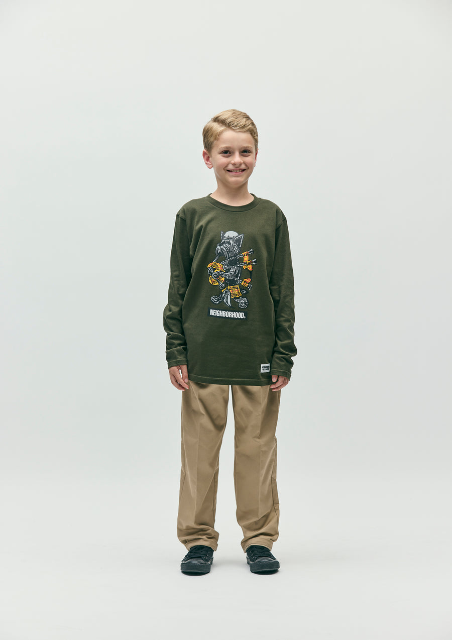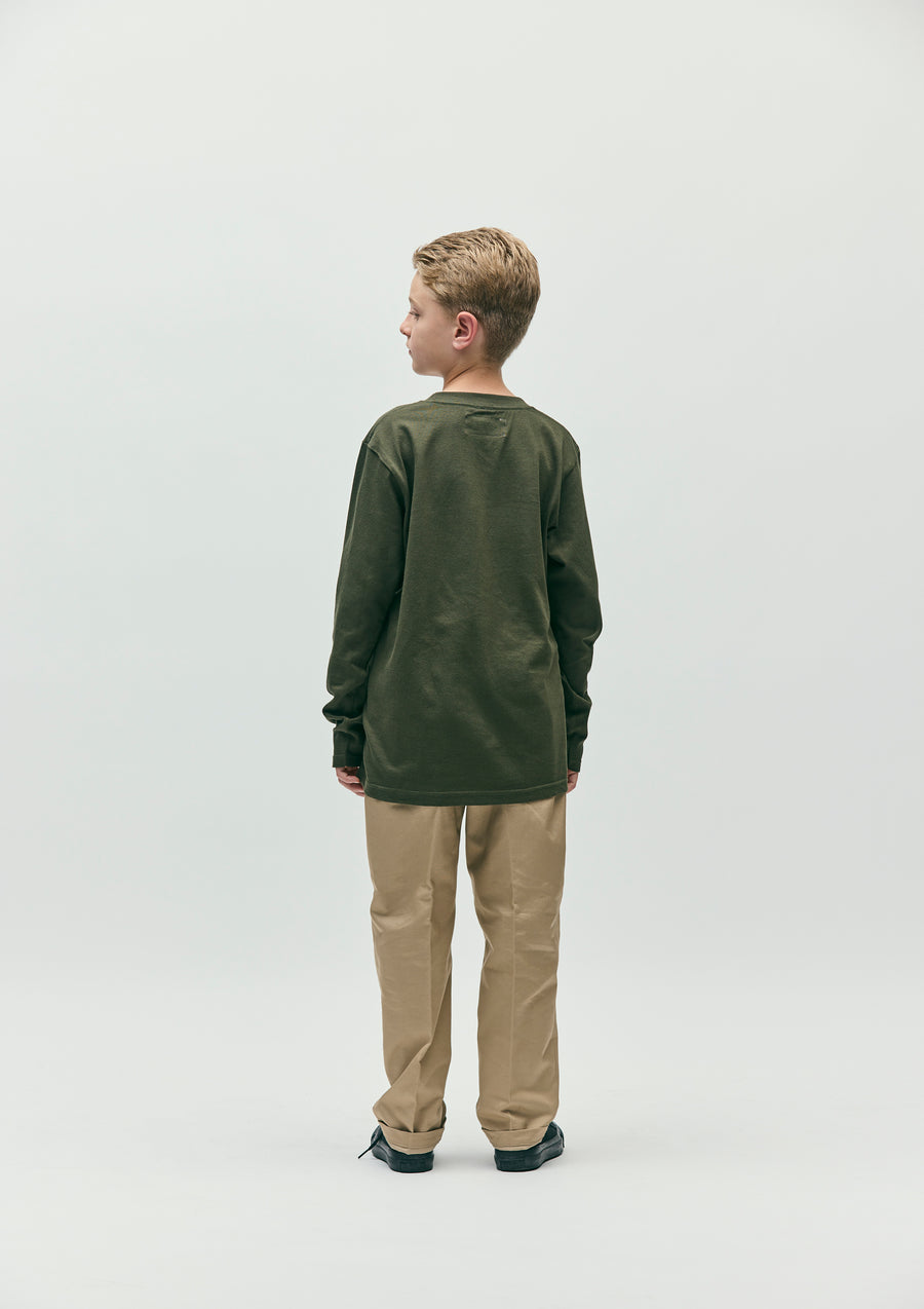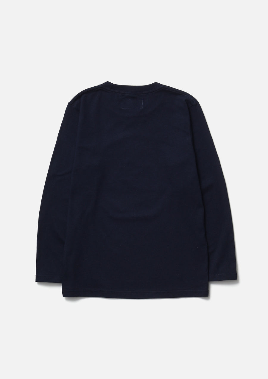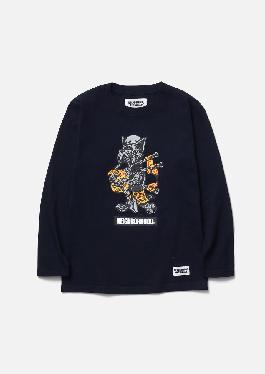 A long-sleeve T-shirt made of a 5.6oz heavyweight body. Graphic print on the front. A name tag is placed on the left hem.