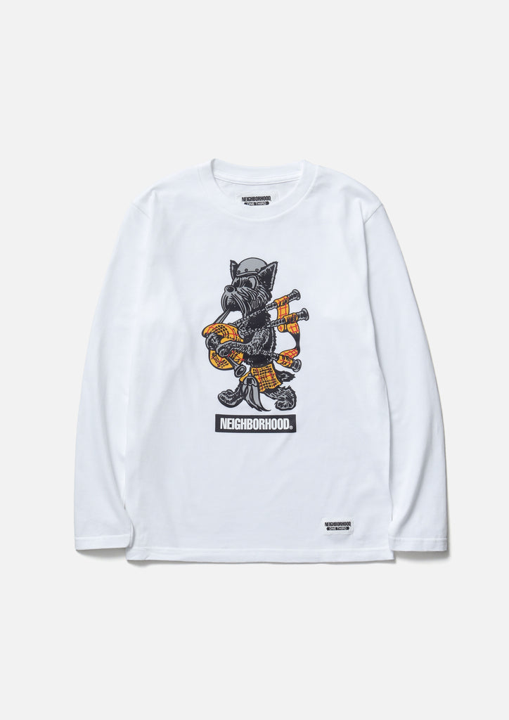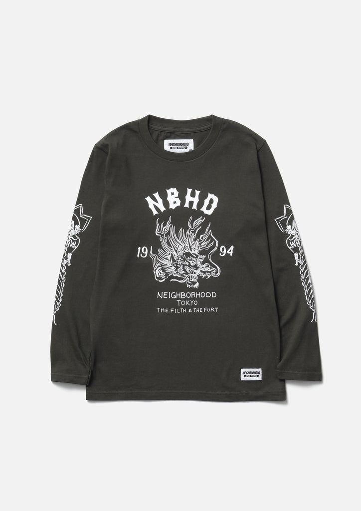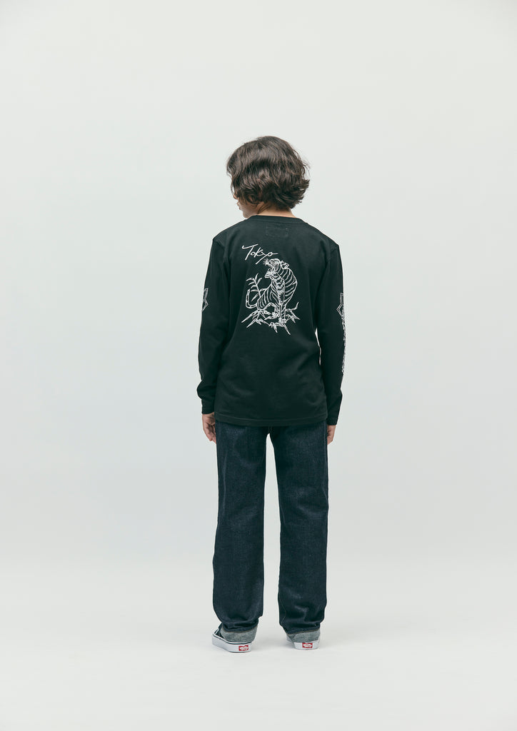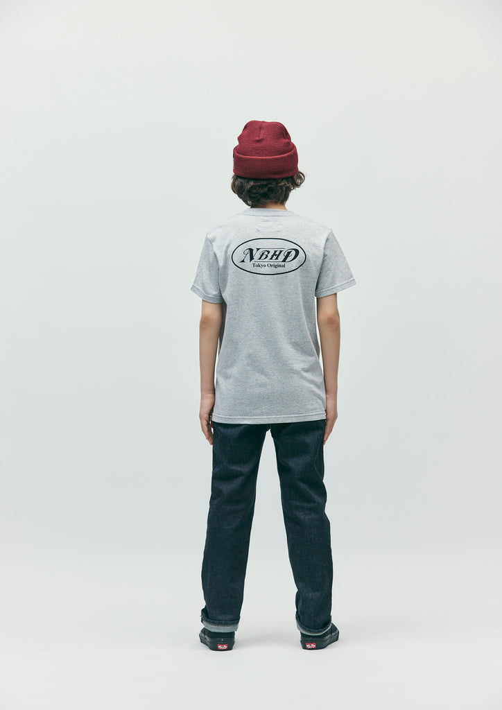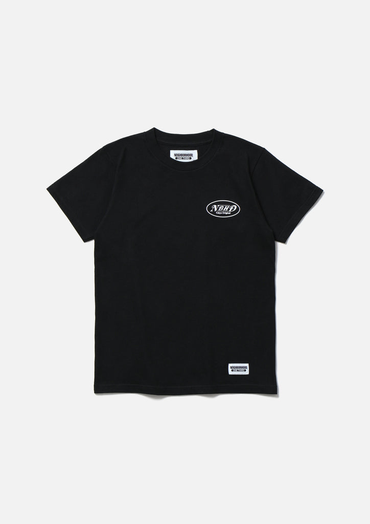 A short-sleeve T-shirt made of a 5.6oz heavyweight body. Graphic prints on the left chest and back. A name tag is placed on the left hem.