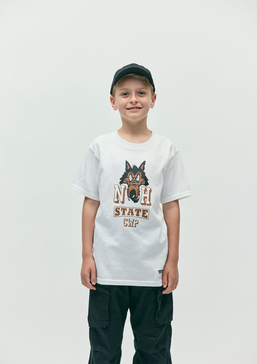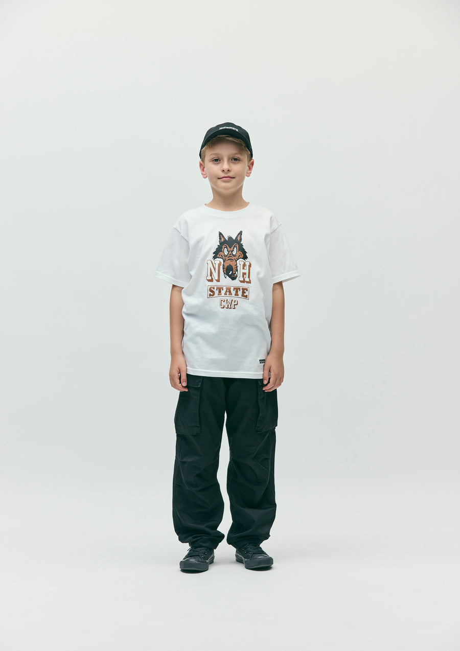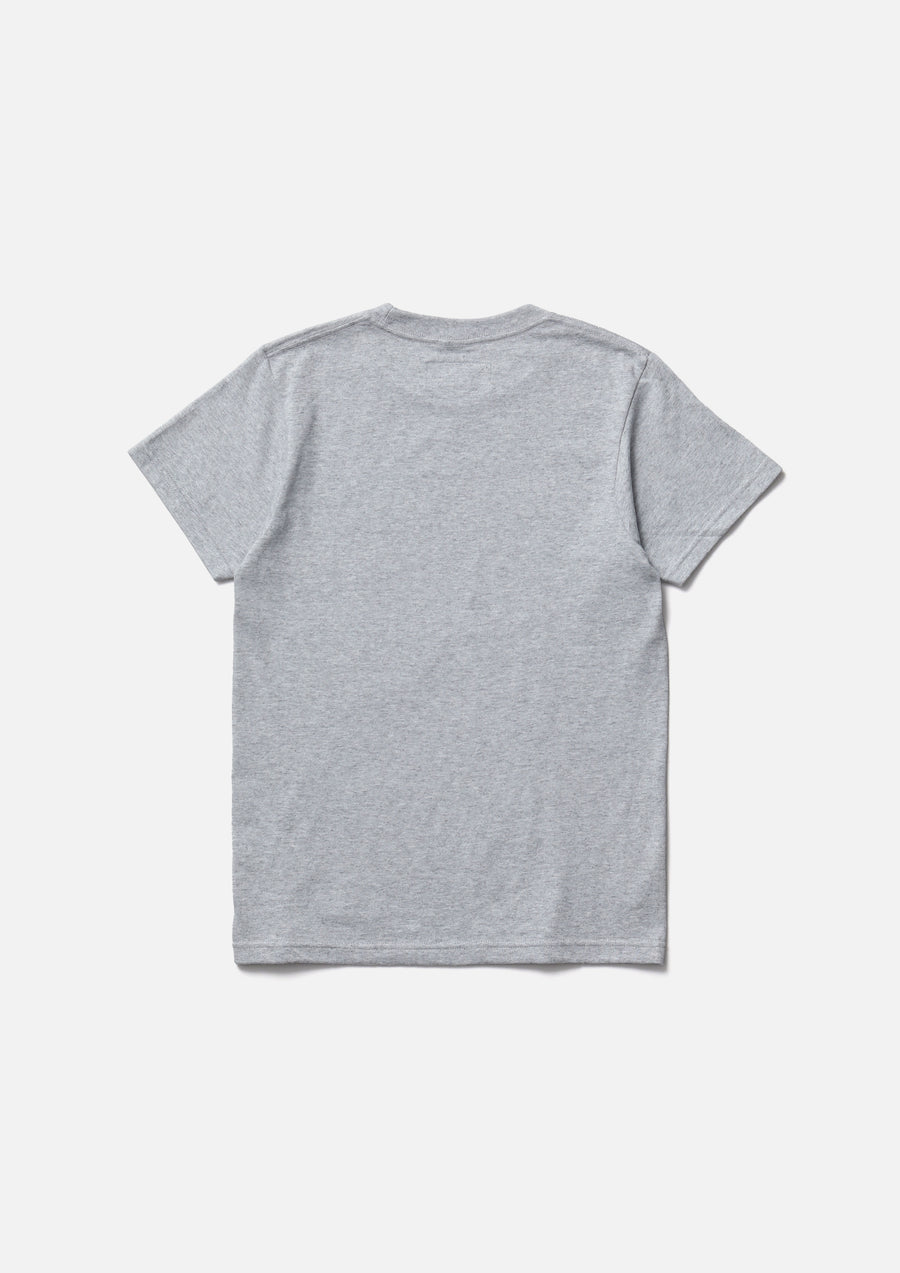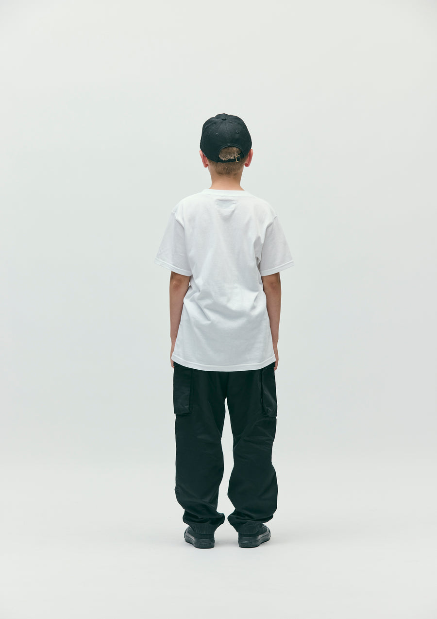 A short-sleeve T-shirt made of a 5.6oz heavyweight body. Graphic print on the front. A name tag is placed on the left hem.