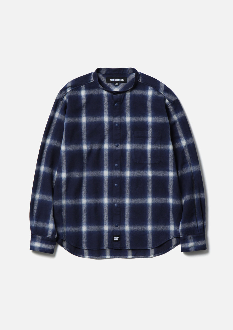 A stand-collar check shirt made from plain-weave ombré check fabric with a shaggy brushed finish. The front features plastic dot buttons. A brand tag is attached to the placket and side seam. One-wash finish.