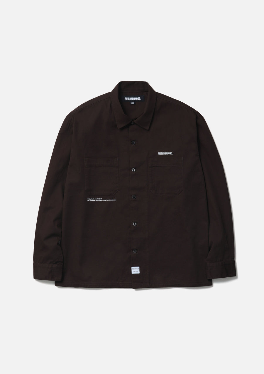 A work shirt made from mid-weight katsuragi fabric with a natural touch. Maintains a classic work shirt design with standard patch pockets. The left pocket includes a pen holder. Embroidered logo on the left chest and printed text below the right pocket. Equipped with original four-hole buttons, a brand tag on the placket and side seam. One-wash finish.