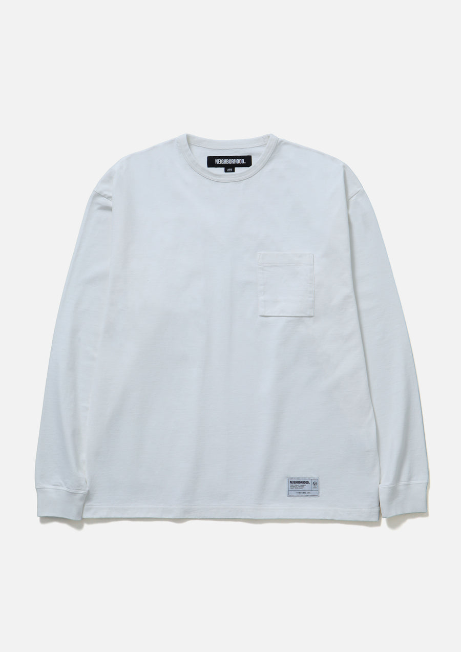 A crew neck cut-and-sew made of high-gauge tightly knit jersey. Features a patch pocket on the left chest and a printed logo on the back. Includes a brand tag on the side seam.