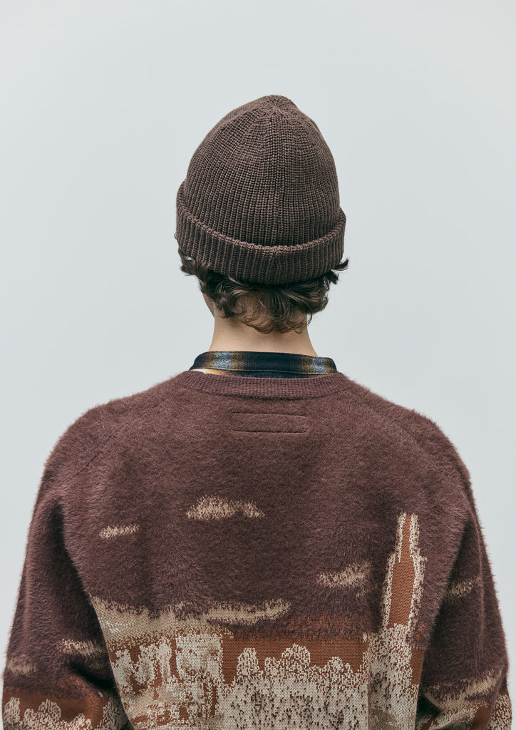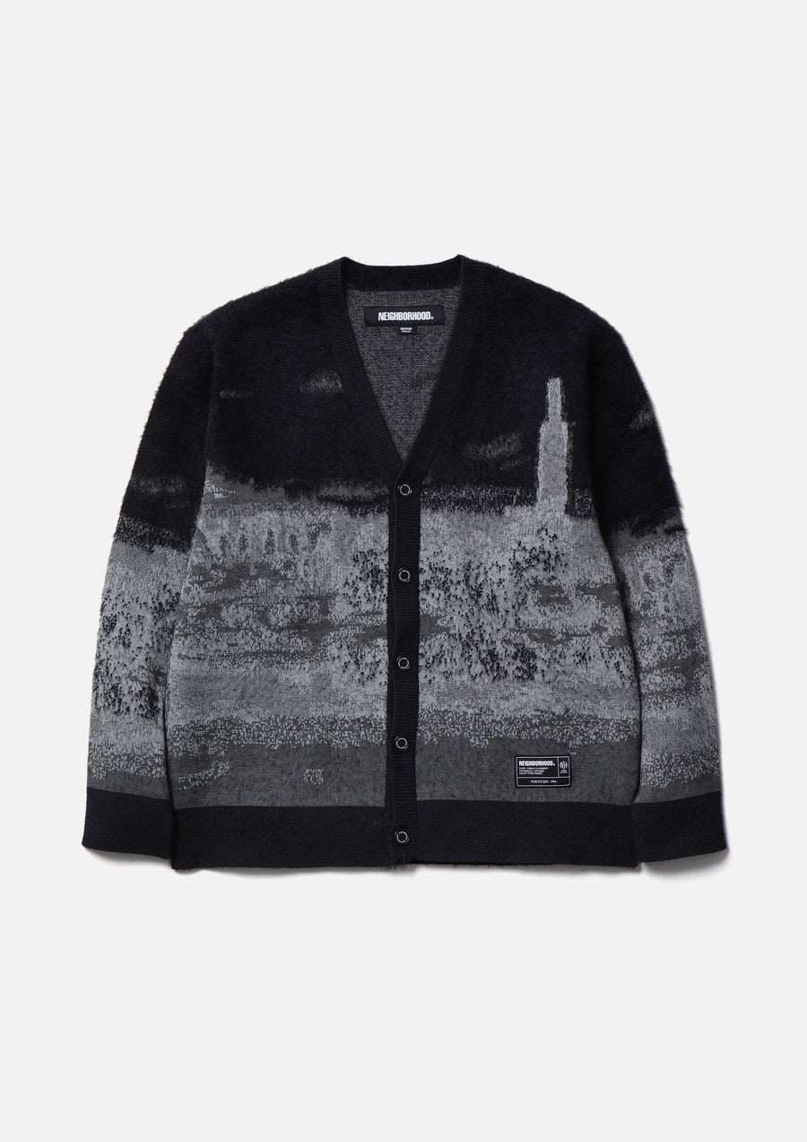 A knit cardigan made from a SOLOTEX® blend, featuring a jacquard-knit landscape pattern. Designed with original buttons and finished with a brand tag on the left hem.