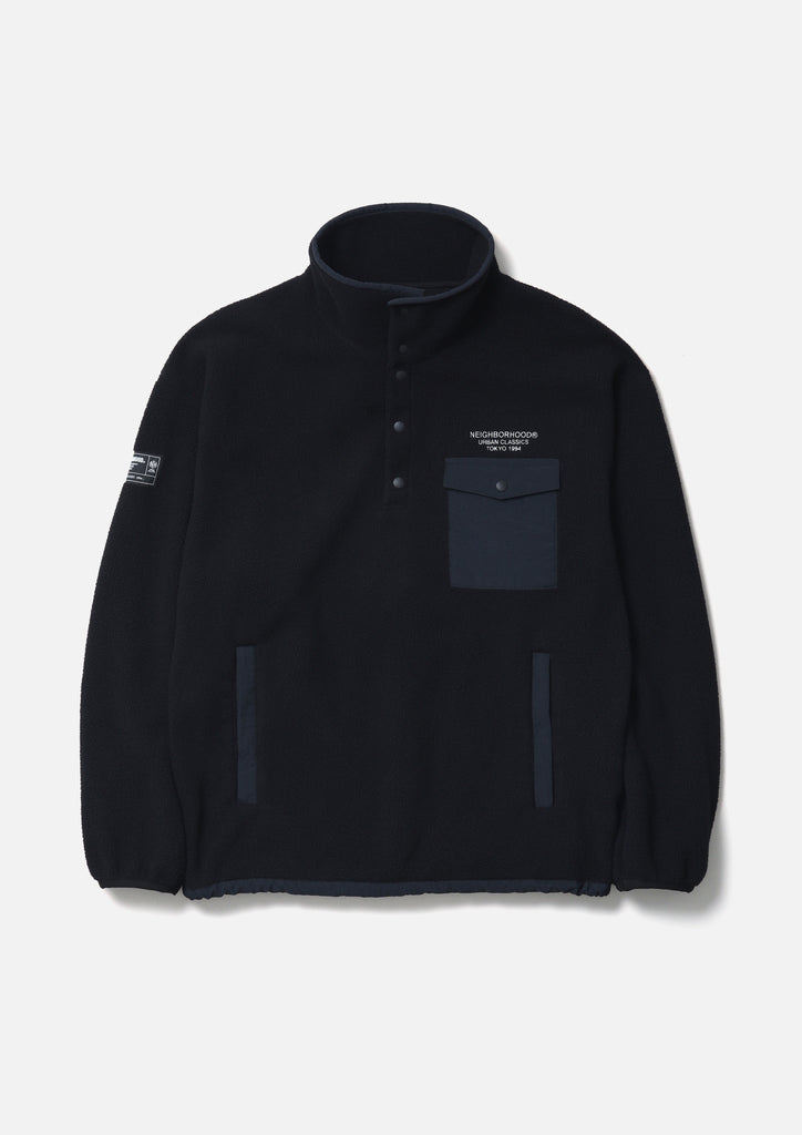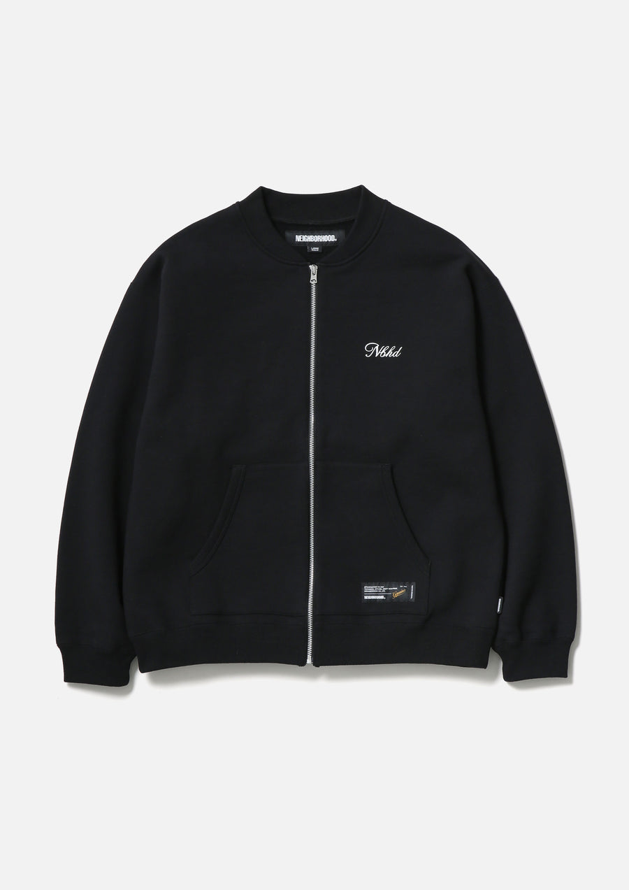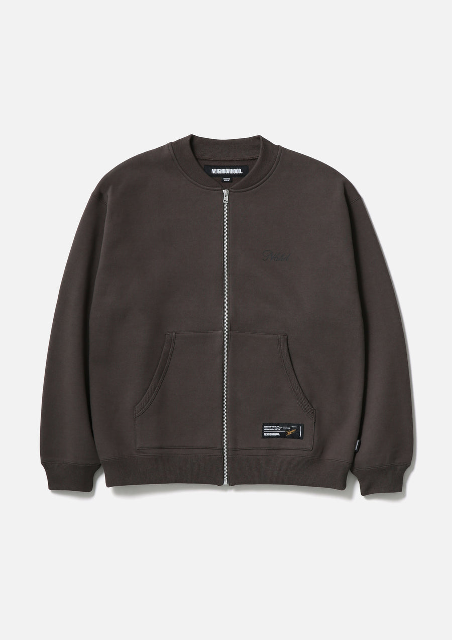 A blouson made of fleece-backed fabric, brushed before dyeing to minimize lint shedding. Printed logos on the left chest and back. Features an original zipper pull and a brand tag on the side seam.