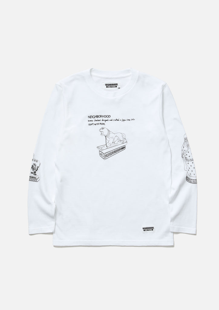 Long sleeve T-shirt made of 5.6oz heavyweight body. Logo printed on the front. Brand tag at the left hem.