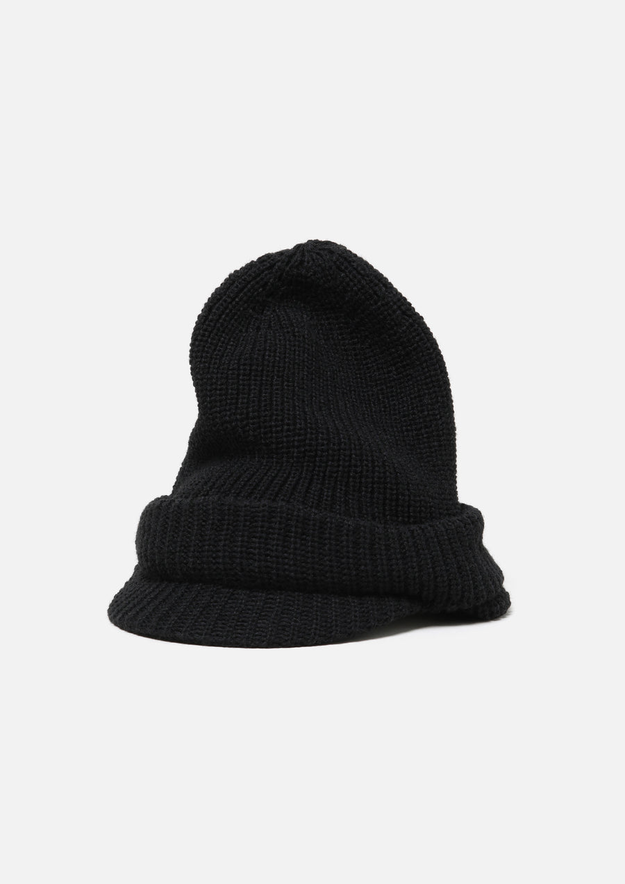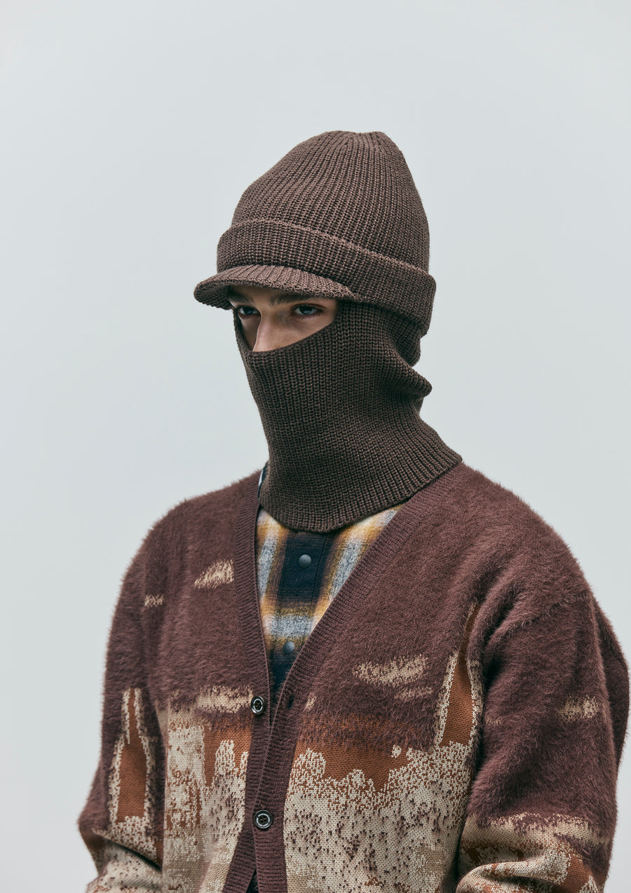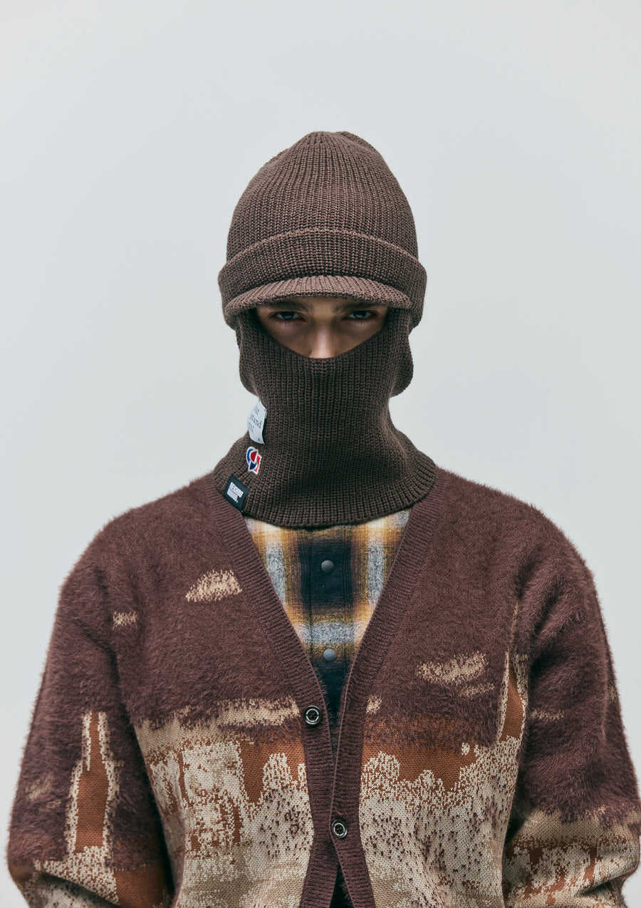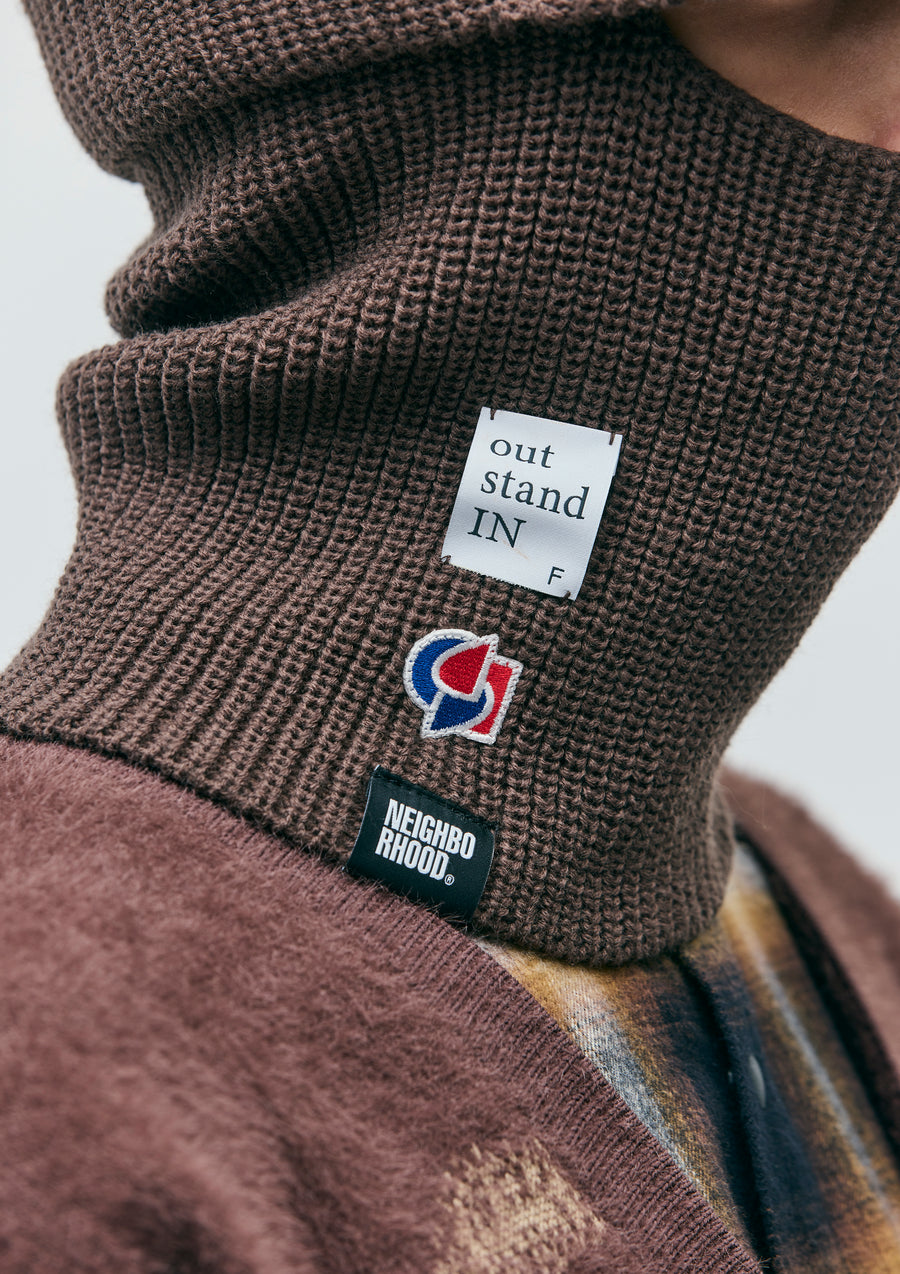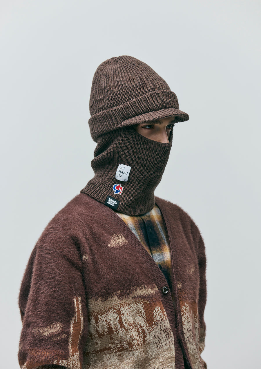 A collaborative item with out stand IN, a brand led by art director Tetsuya Nagato and designer/creative director Kazuki Kuraishi. A brimmed balaclava that can also be worn as a knit cap by storing the mask section. Made from acrylic yarn. Features a logo patch on the right hem.
