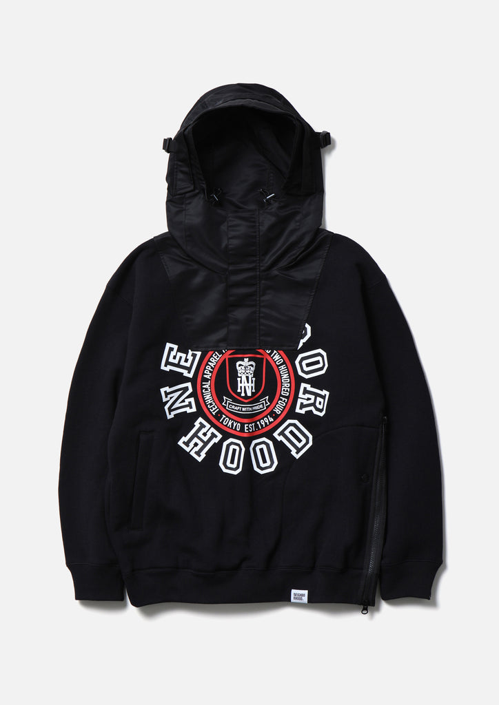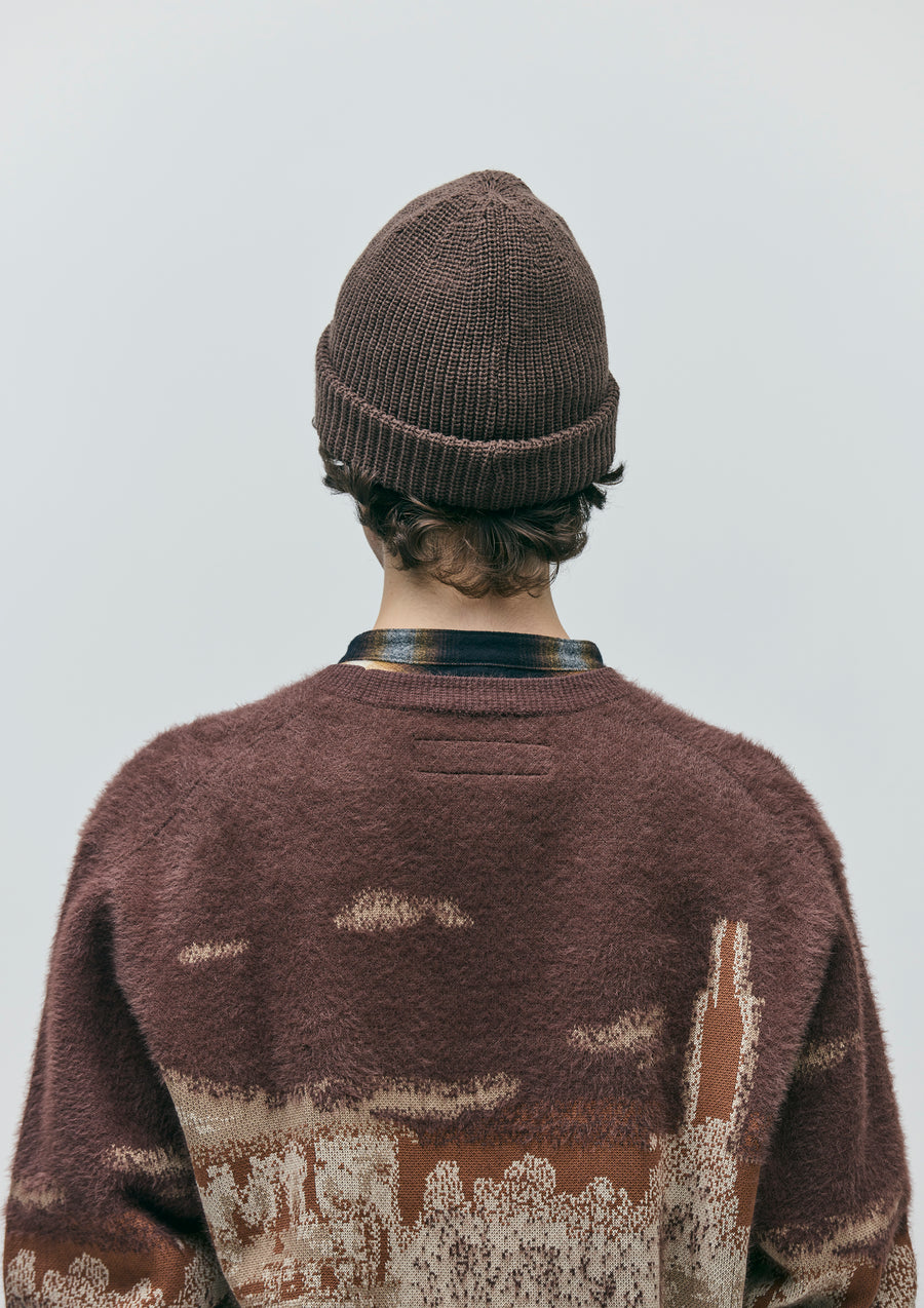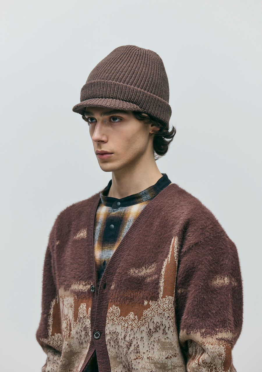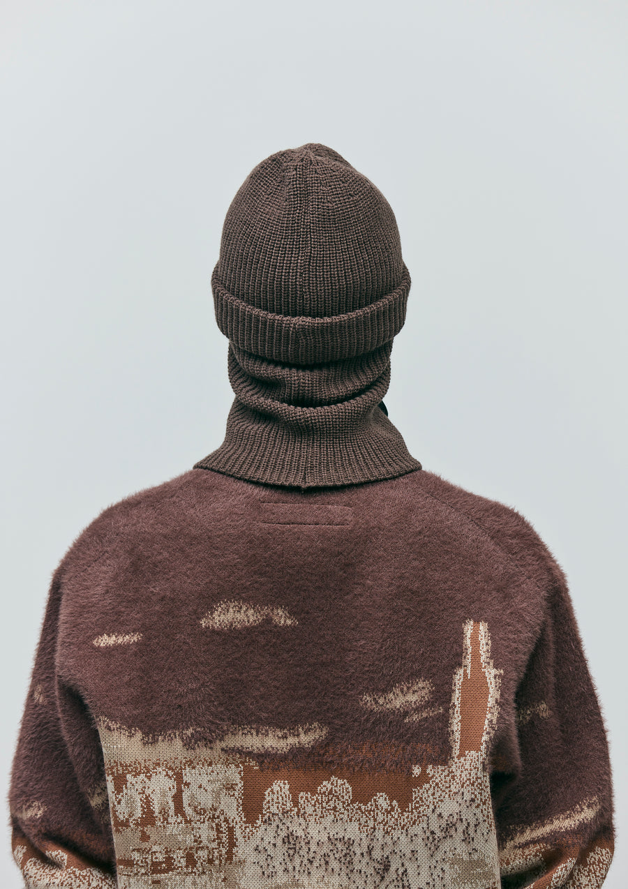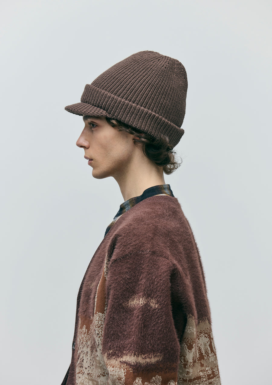 A collaborative item with out stand IN, a brand led by art director Tetsuya Nagato and designer/creative director Kazuki Kuraishi. A brimmed balaclava that can also be worn as a knit cap by storing the mask section. Made from acrylic yarn. Features a logo patch on the right hem.
