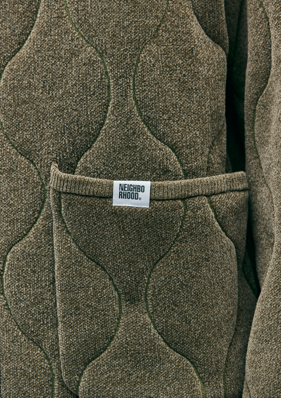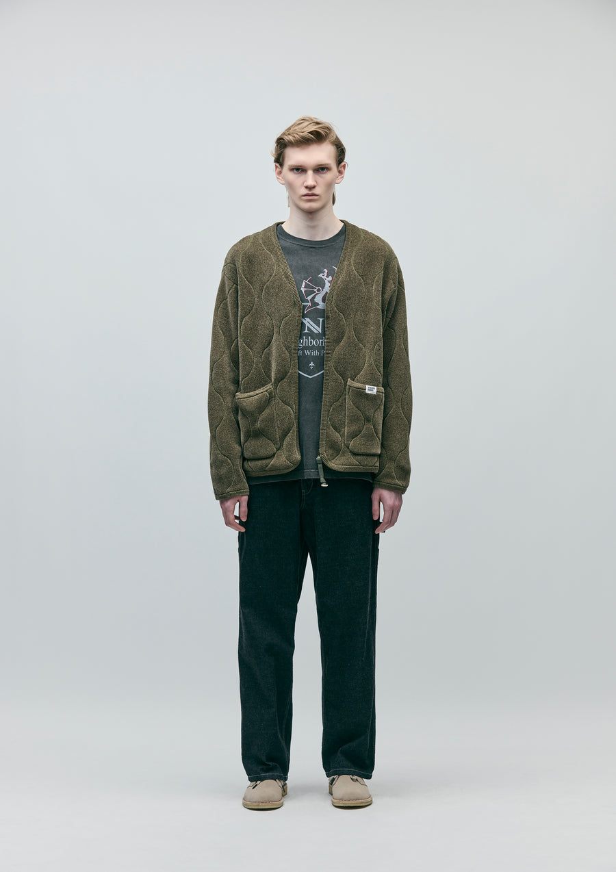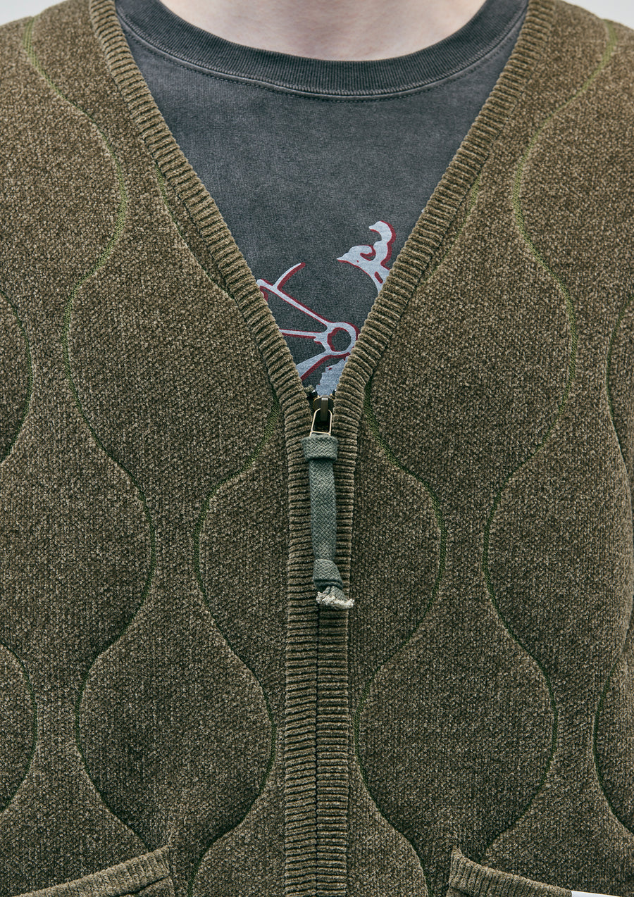 A knit cardigan made of 7-gauge jersey knit, featuring a gourd shape quilted pattern created using a drop needle stitch. Made with polyester chenille yarn. The front closure uses a metal zipper. A brand tag is placed at the pocket opening.