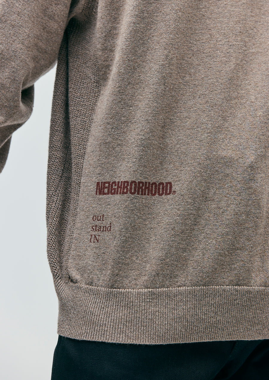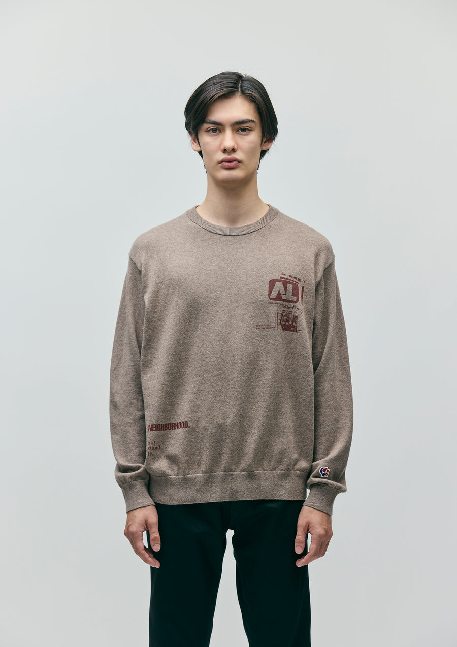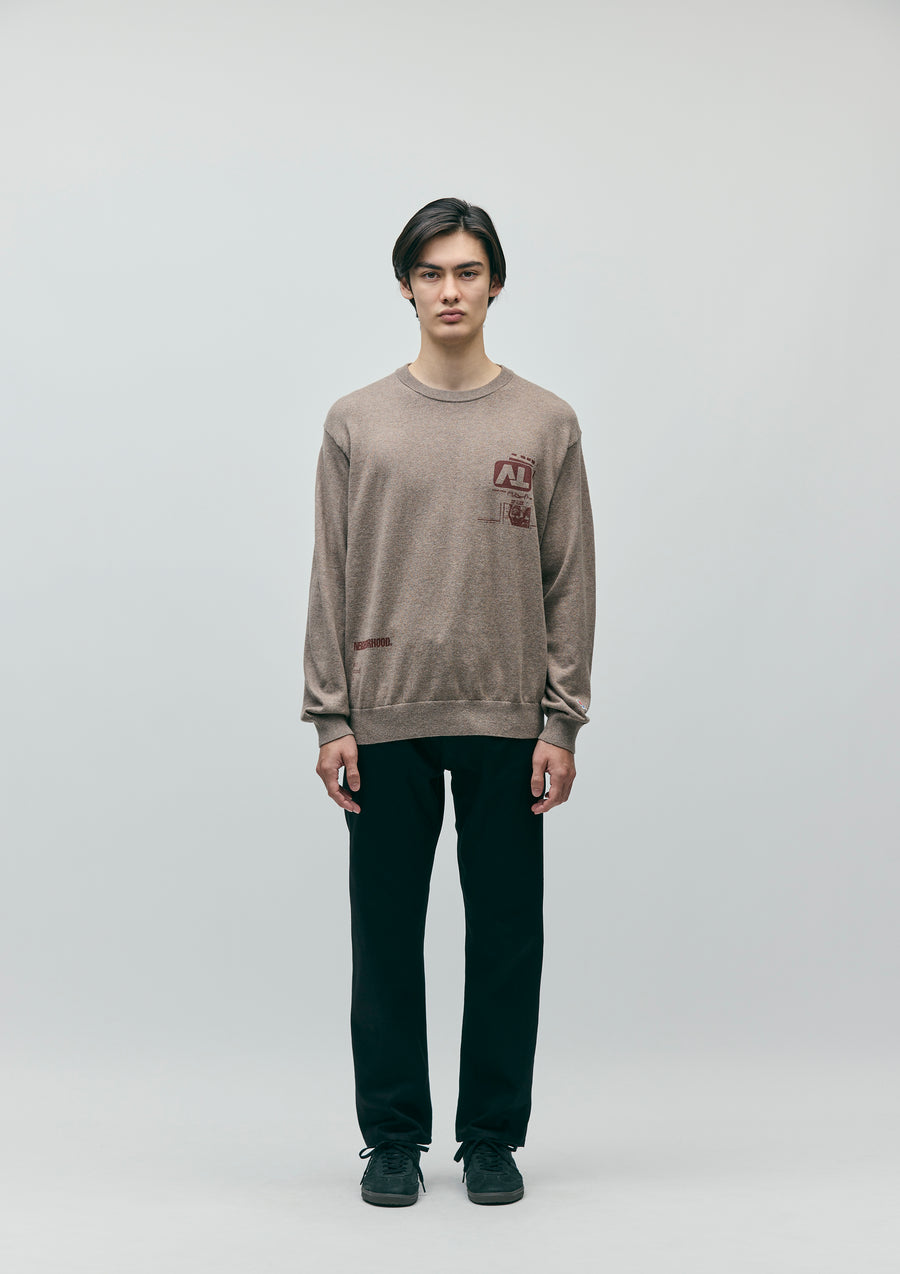 A collaborative item with out stand IN, a brand led by art director Tetsuya Nagato and designer/creative director Kazuki Kuraishi. A crewneck knit sweater crafted using a 12-gauge knitting machine with a seamless linking construction. Inspired by vintage sweatshirts, the side panels feature half-cardigan ribbing for enhanced lateral stretch. Designed to incorporate as many fashion marks (reductions) as possible, utilizing the natural drop of the shoulder in knitwear. Graphic print on the front, with a logo patch on the left sleeve.