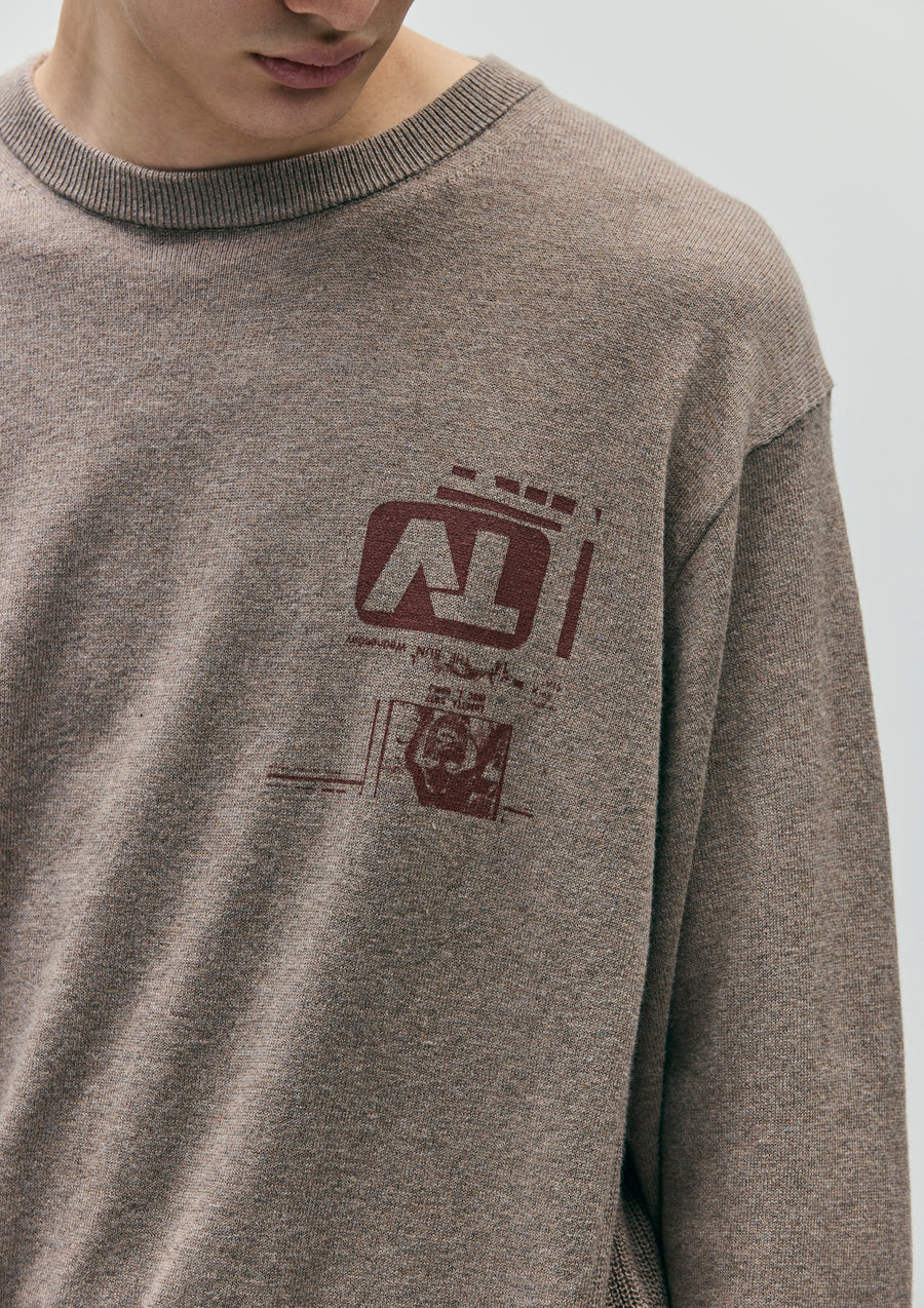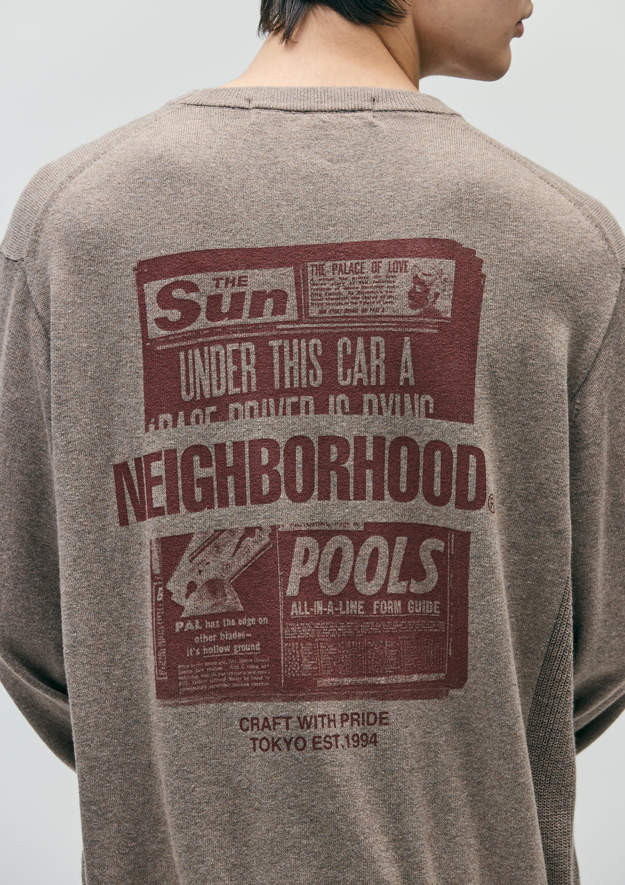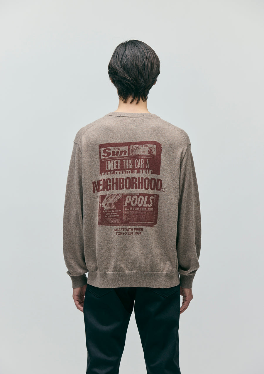 A collaborative item with out stand IN, a brand led by art director Tetsuya Nagato and designer/creative director Kazuki Kuraishi. A crewneck knit sweater crafted using a 12-gauge knitting machine with a seamless linking construction. Inspired by vintage sweatshirts, the side panels feature half-cardigan ribbing for enhanced lateral stretch. Designed to incorporate as many fashion marks (reductions) as possible, utilizing the natural drop of the shoulder in knitwear. Graphic print on the front, with a logo patch on the left sleeve.