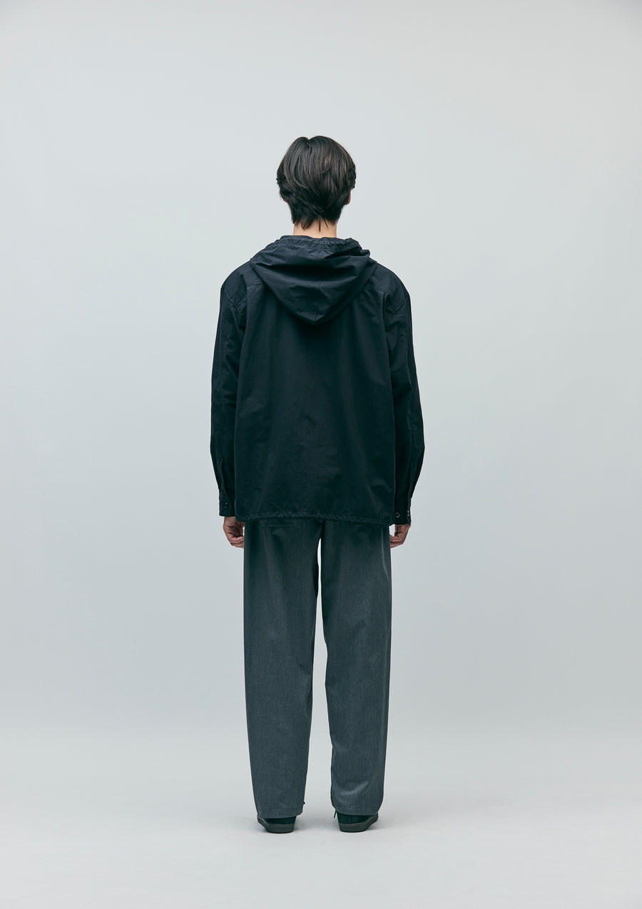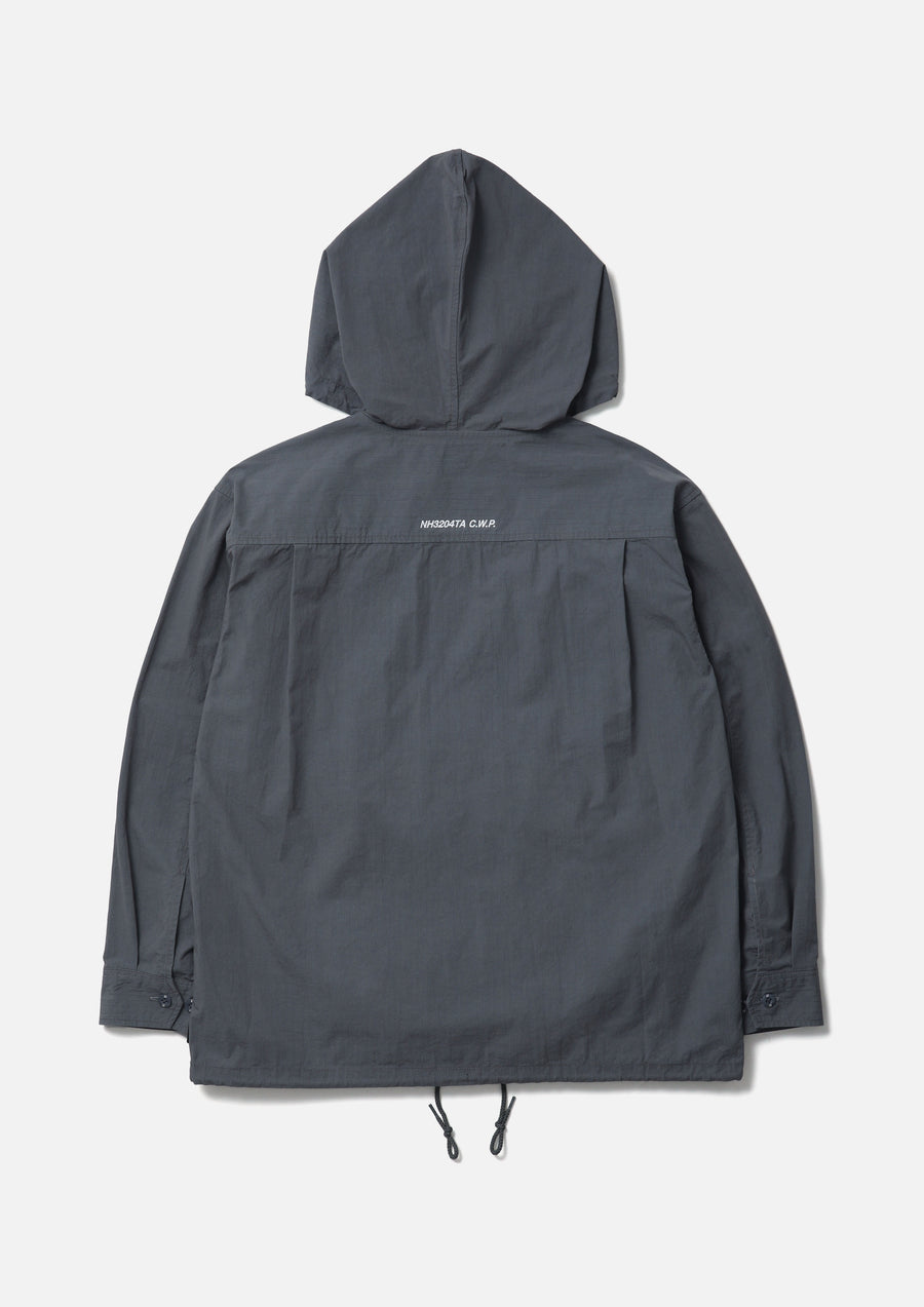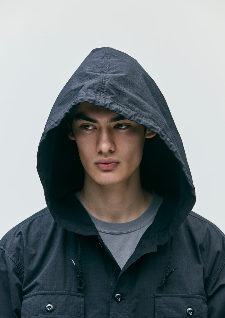 A hooded shirt made from a high-density cotton/nylon blend fabric with a distinctive textured surface. The hem includes a spindle for size adjustment. Embroidered logo on the back yoke. Equipped with original four-hole buttons, a dedicated name tag on the left hem, and a brand tag on the side seam. One-wash finish.