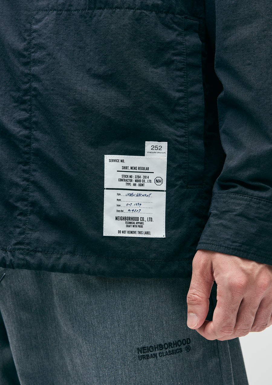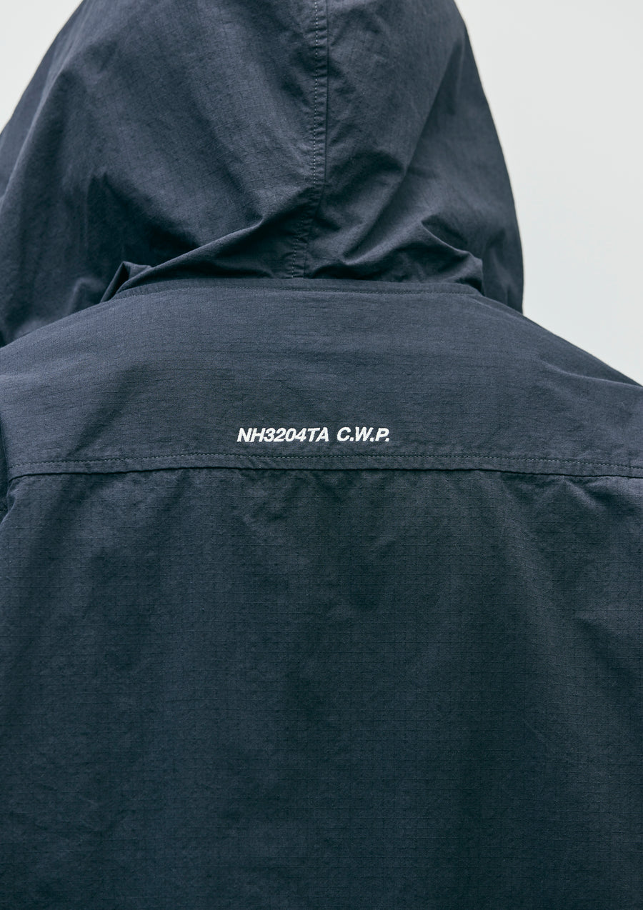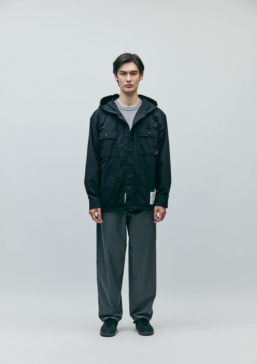 A hooded shirt made from a high-density cotton/nylon blend fabric with a distinctive textured surface. The hem includes a spindle for size adjustment. Embroidered logo on the back yoke. Equipped with original four-hole buttons, a dedicated name tag on the left hem, and a brand tag on the side seam. One-wash finish.