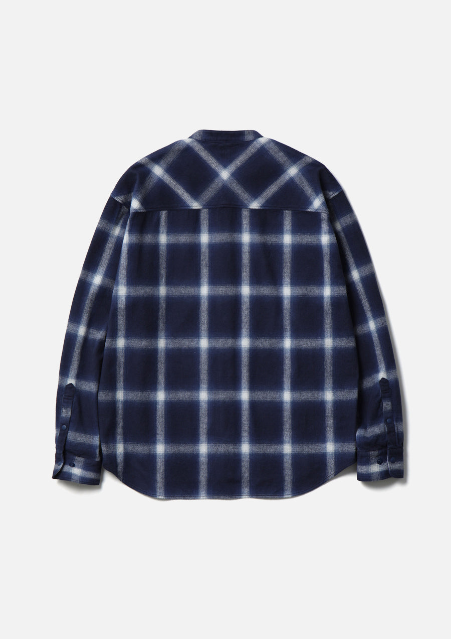 A stand-collar check shirt made from plain-weave ombré check fabric with a shaggy brushed finish. The front features plastic dot buttons. A brand tag is attached to the placket and side seam. One-wash finish.