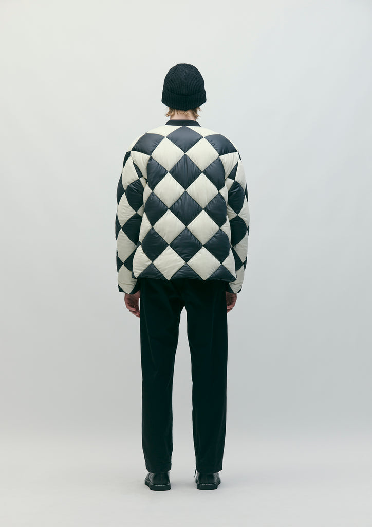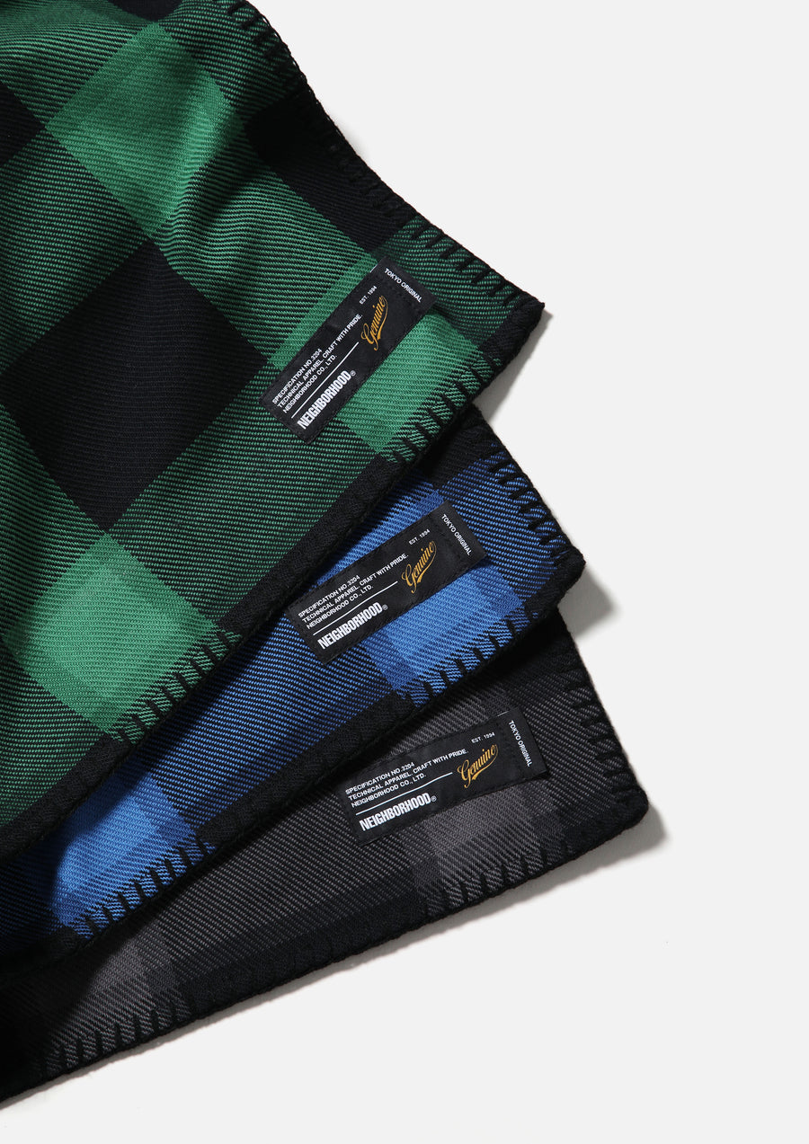 A blanket made from original check-patterned fabric, using thick yarn with a brushed finish on the reverse side. Finished with blanket stitching on all four edges. Brand tag on the hem.