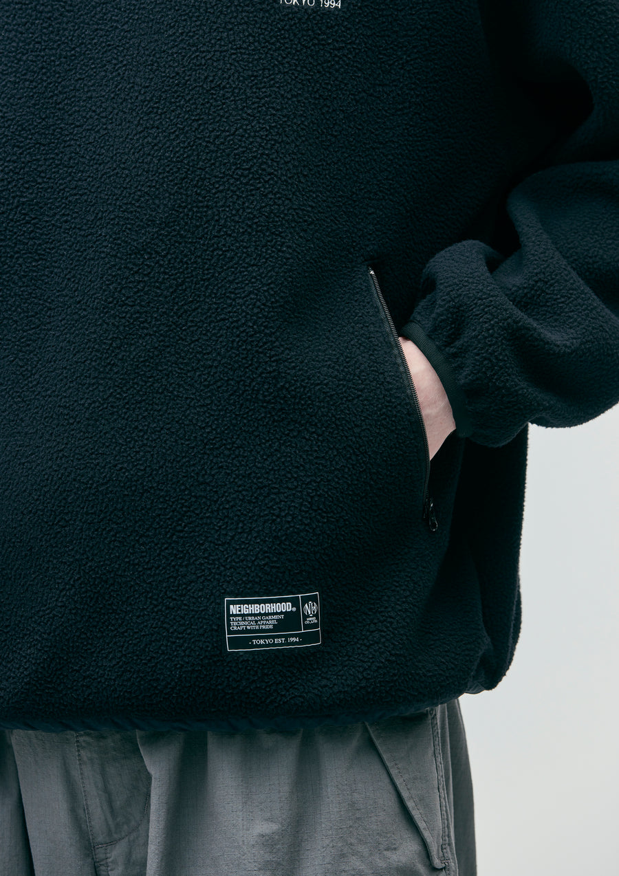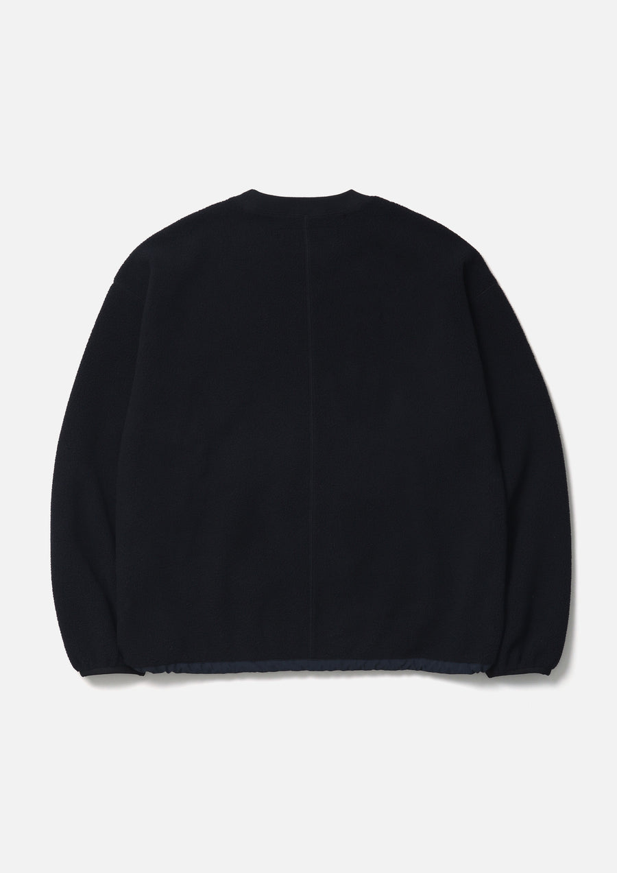 A crew neck pullover made of lightweight boa fabric with excellent heat retention, using POLARTEC Thermal Pro® (100% recycled polyester). Equipped with zippered pockets on both sides. An adjustable elastic spindle is built into the hem. Features an embroidered logo on the left chest and a brand tag on the side seam.