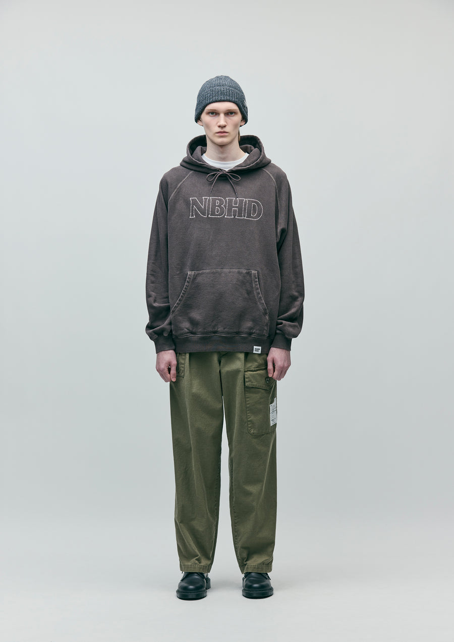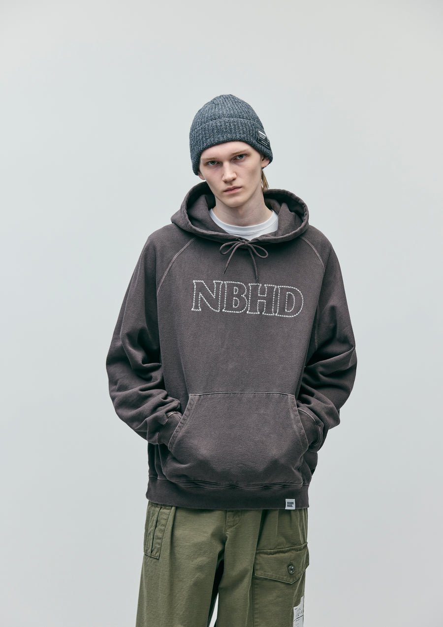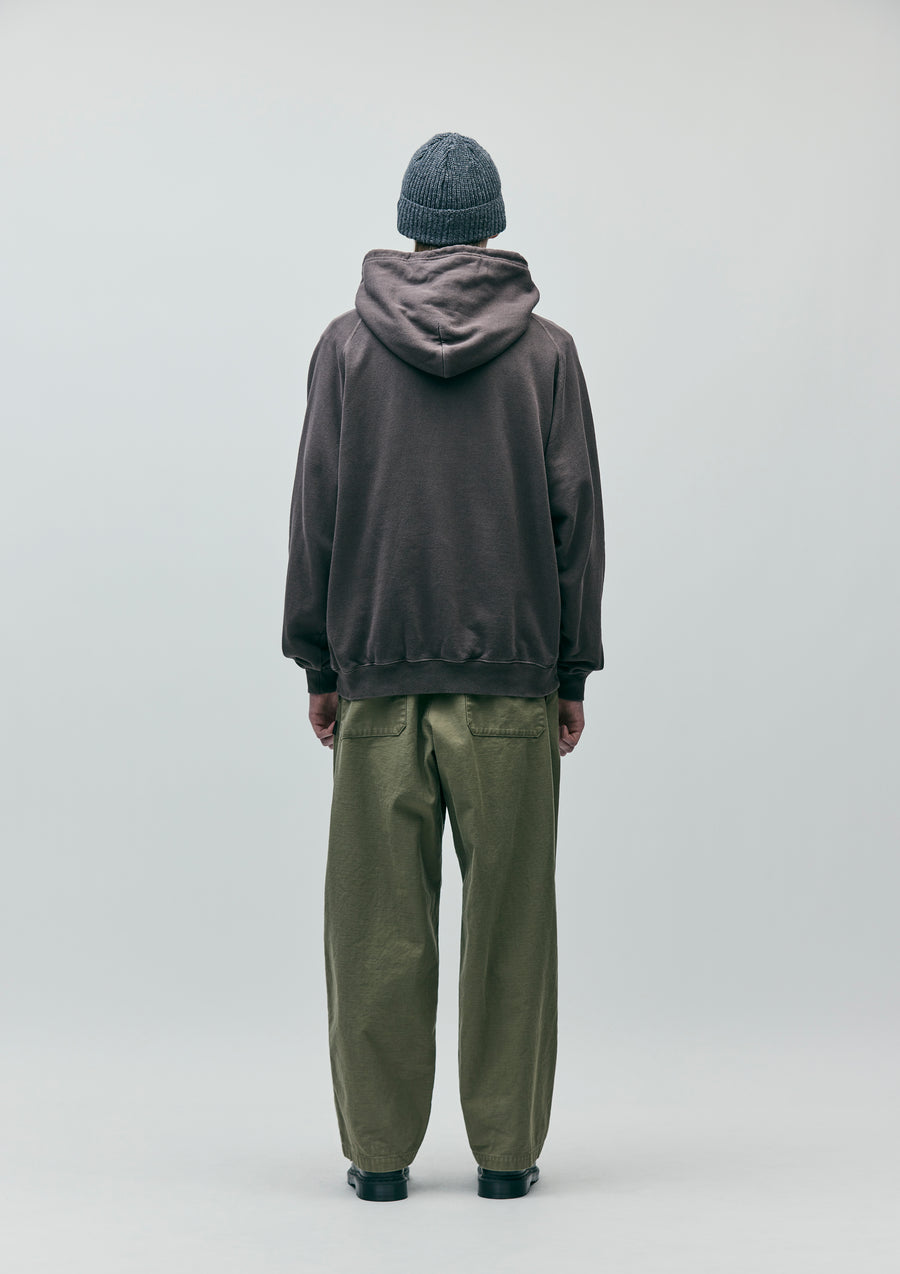 A pullover hoodie made from loopback fabric, pigment-dyed in its finished state. Designed with raglan sleeves, it features bonded stitch embroidery logo on the front. A brand tag is attached to the side seam.