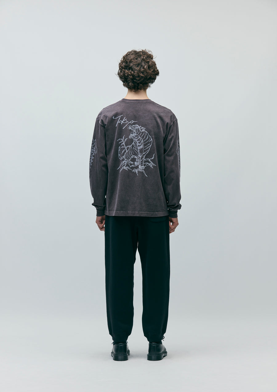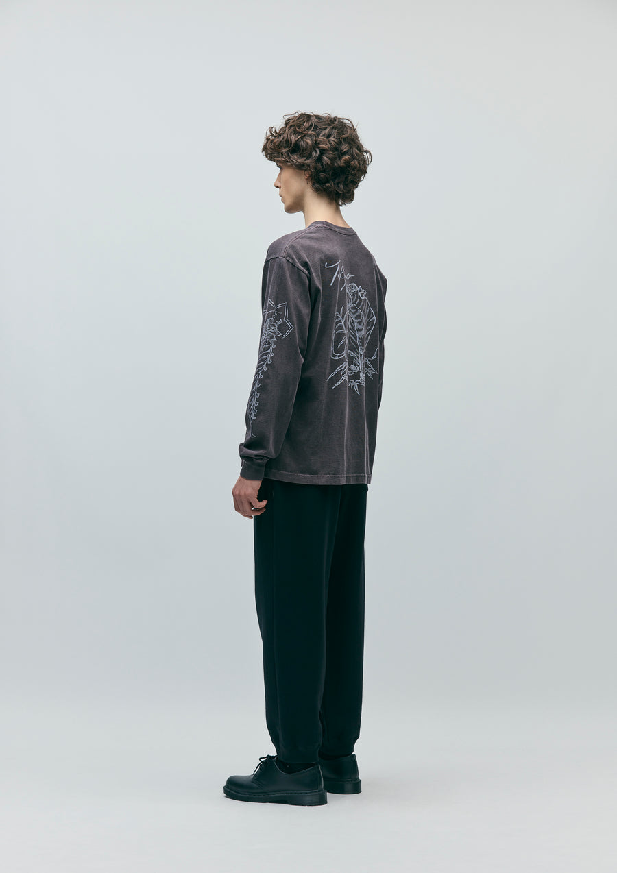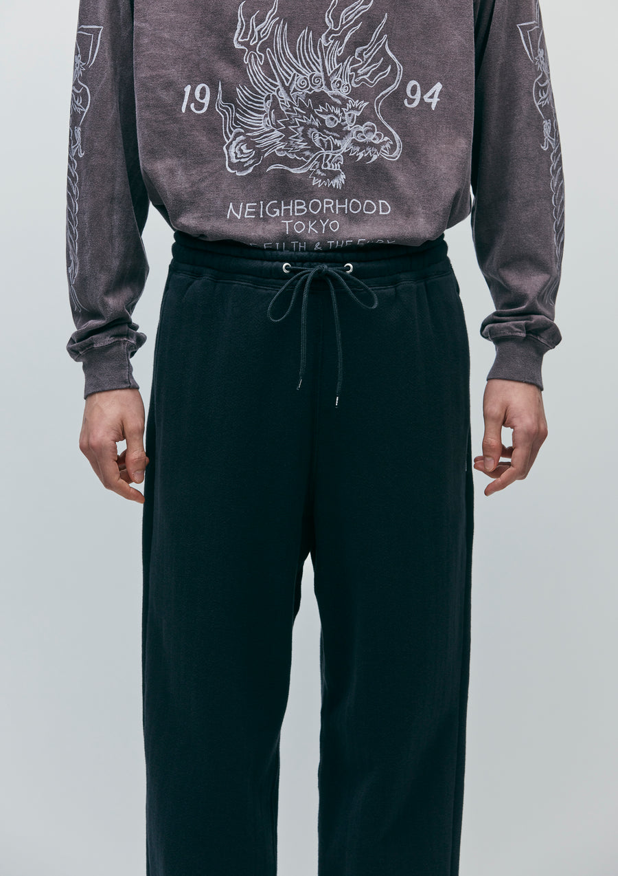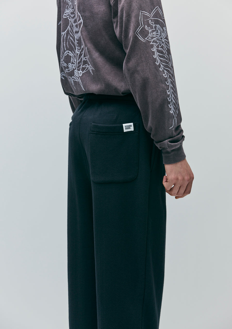 Easy pants made from medium-weight loopback fabric, knitted with a herringbone pattern on the reverse side using a specialized jacquard machine. Designed with a gusseted crotch for enhanced mobility and ribbed hems. Finished with a brand tag on the side seam.