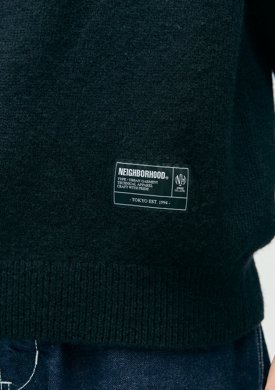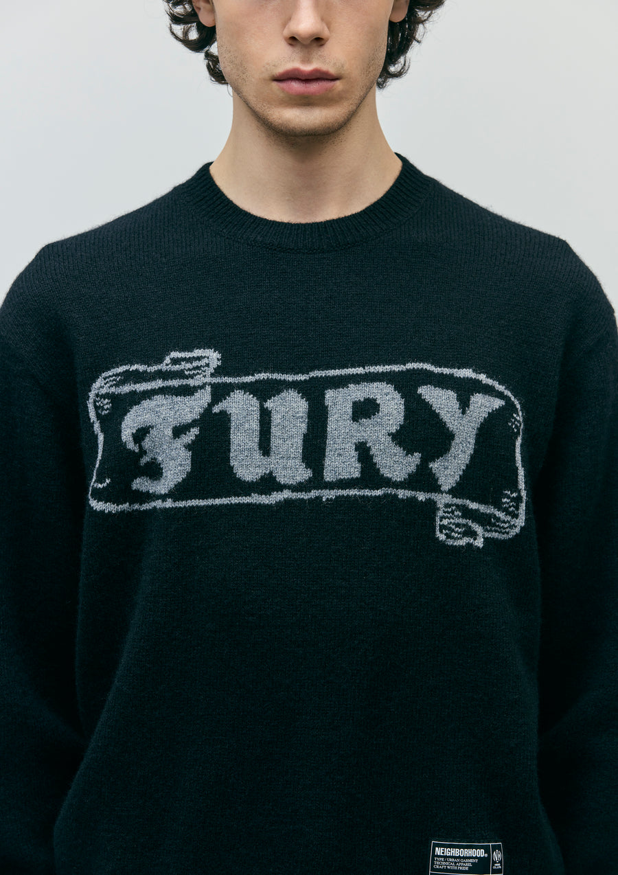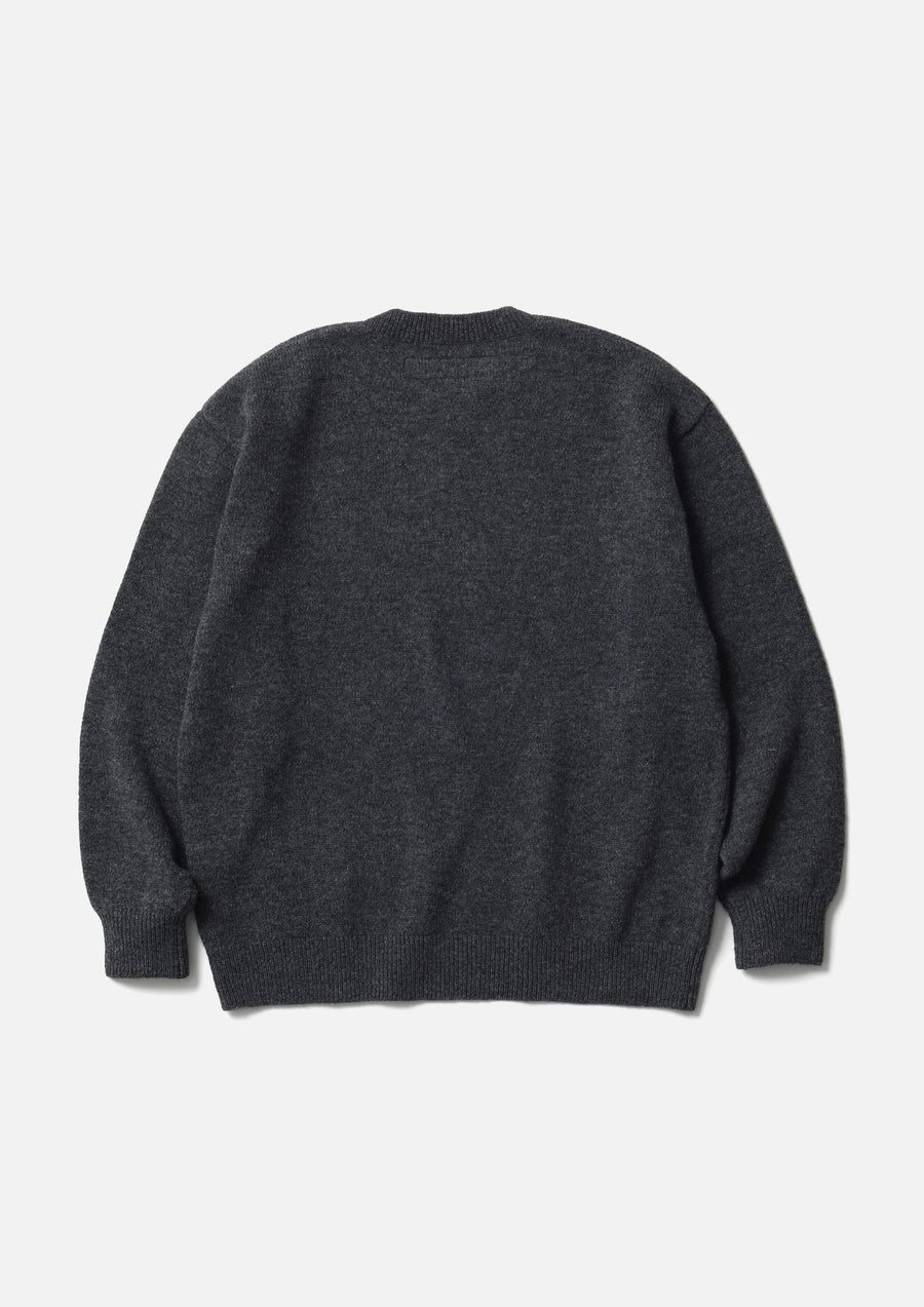 A crewneck knit featuring an intarsia-knit pattern, made from merino wool in 5-gauge jersey knitting. Brand tag on the left hem.