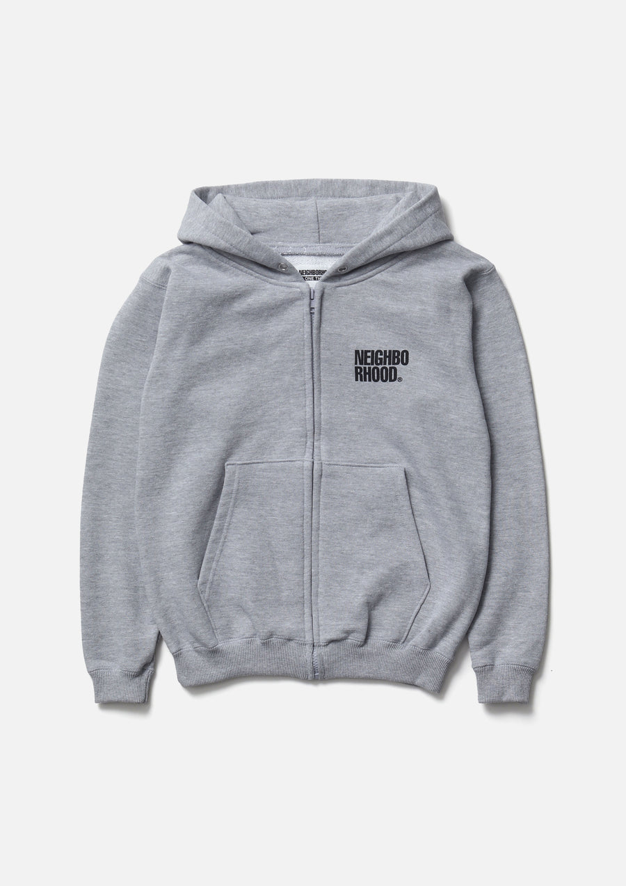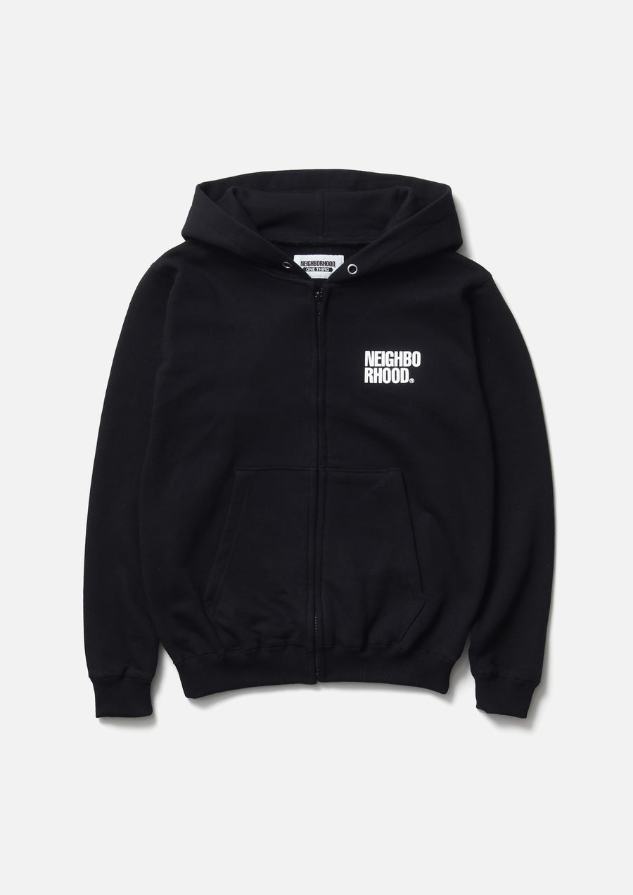A zip-up hoodie made of mid-weight cotton fleece fabric. Printed logo on the left chest and back. A name tag is placed on the hood.