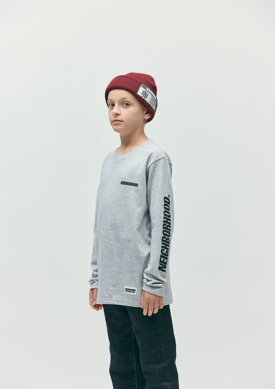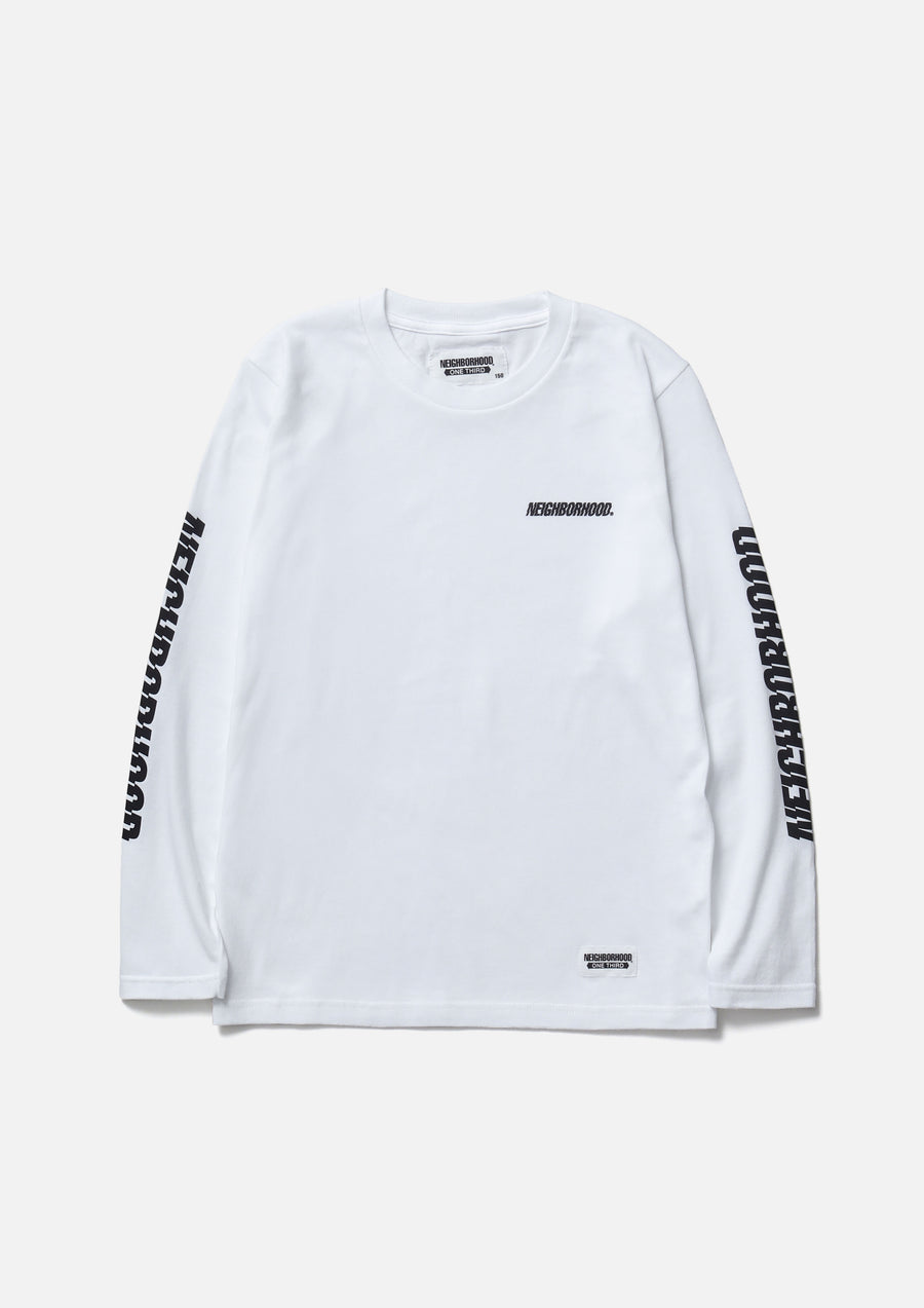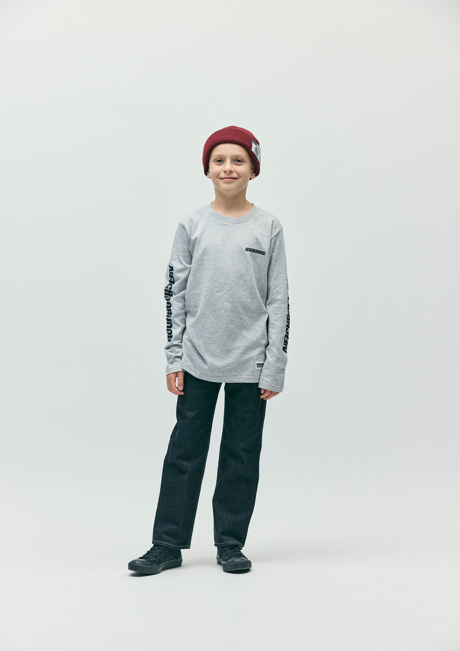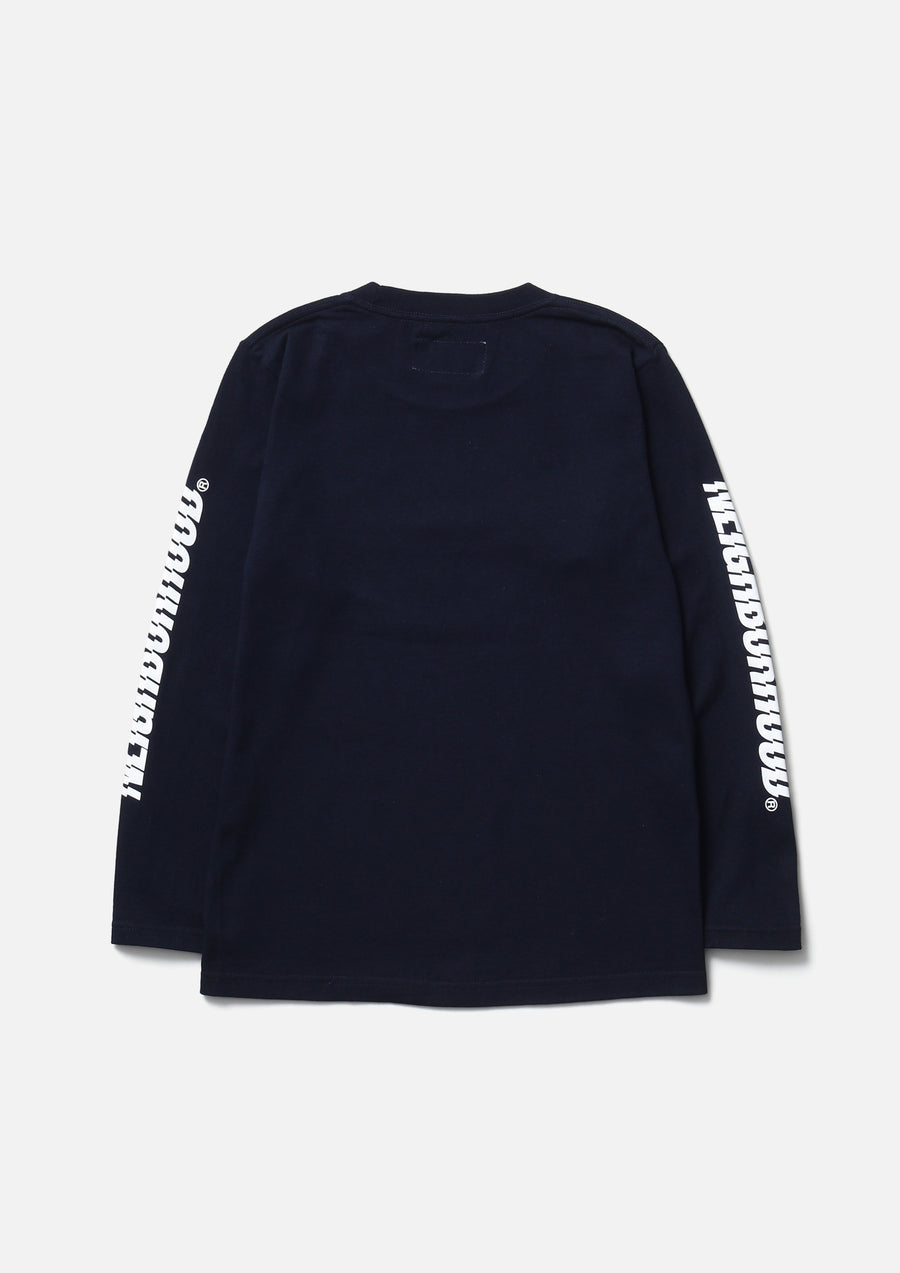 A long-sleeve T-shirt made of a 5.6oz heavyweight body. Printed logo on the left chest and sleeve. A name tag is placed on the left hem.