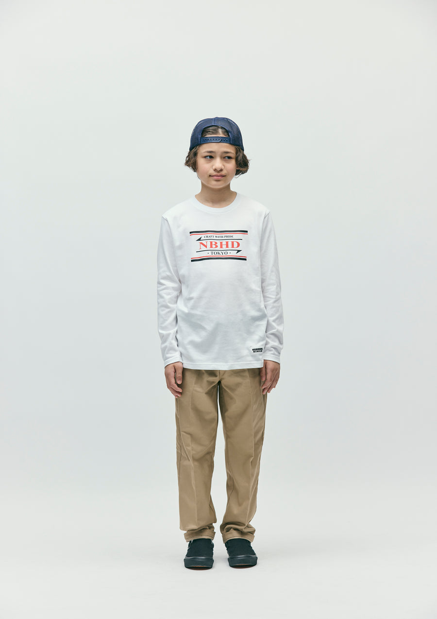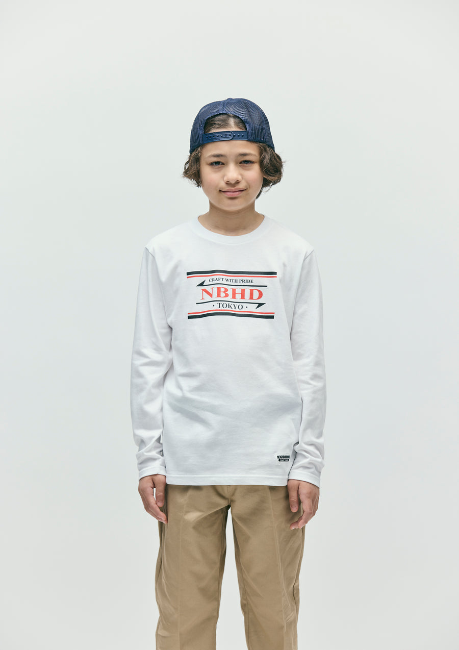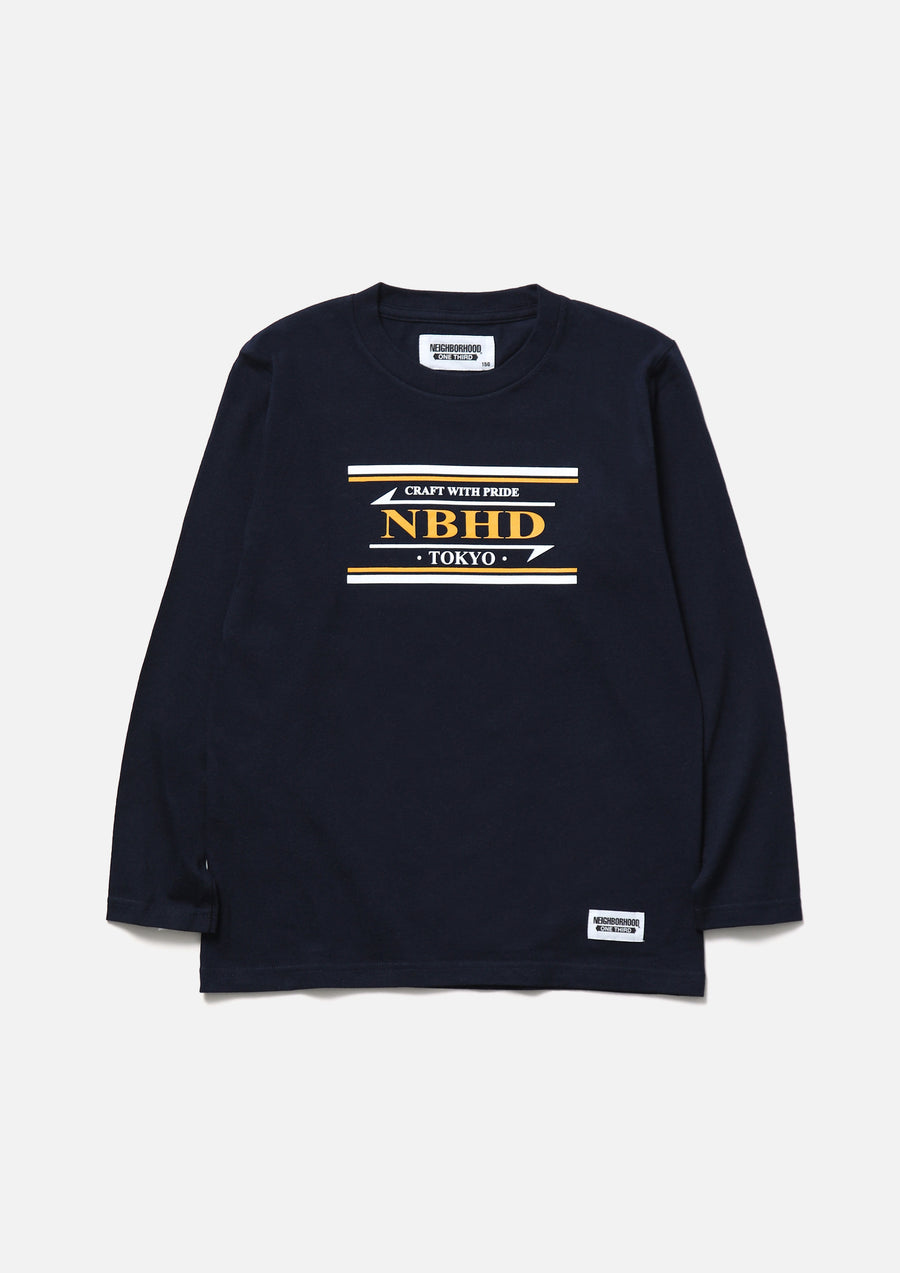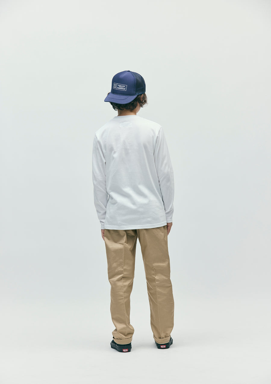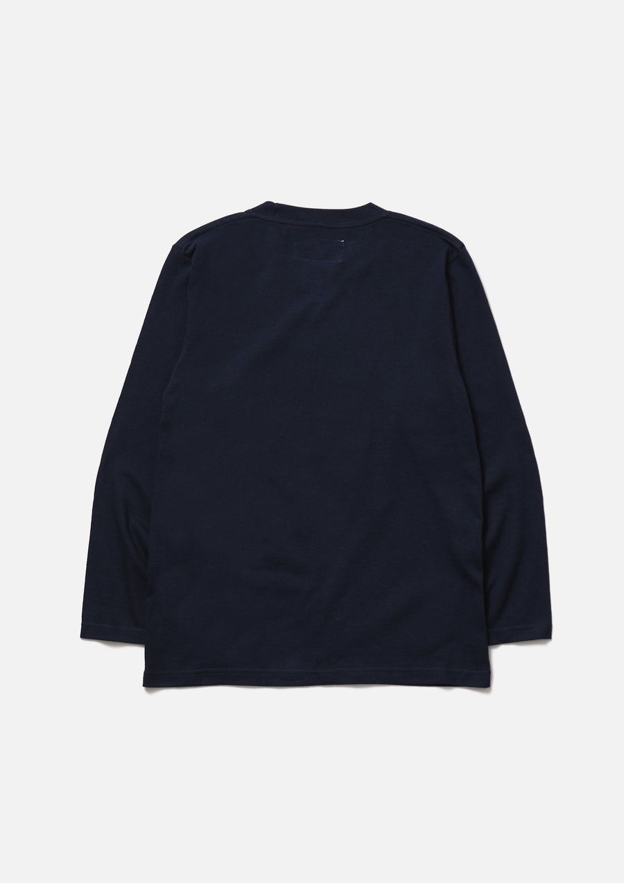 A long-sleeve T-shirt made of a 5.6oz heavyweight body. Graphic print on the front. A name tag is placed on the left hem.