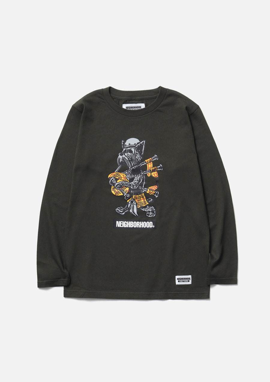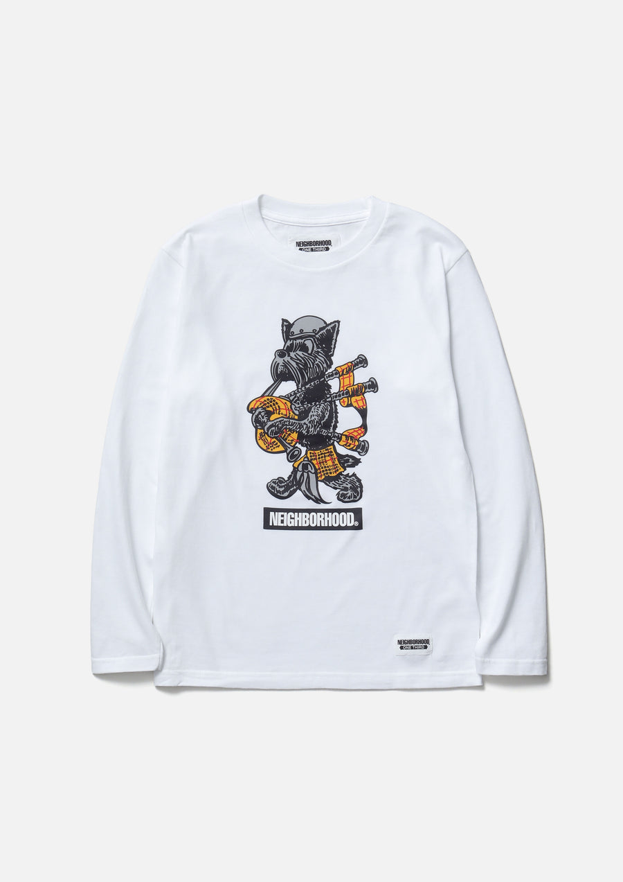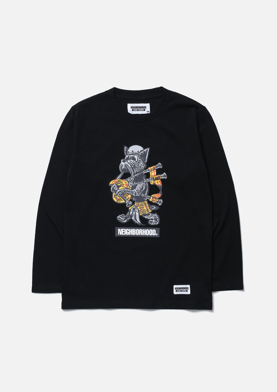 A long-sleeve T-shirt made of a 5.6oz heavyweight body. Graphic print on the front. A name tag is placed on the left hem.