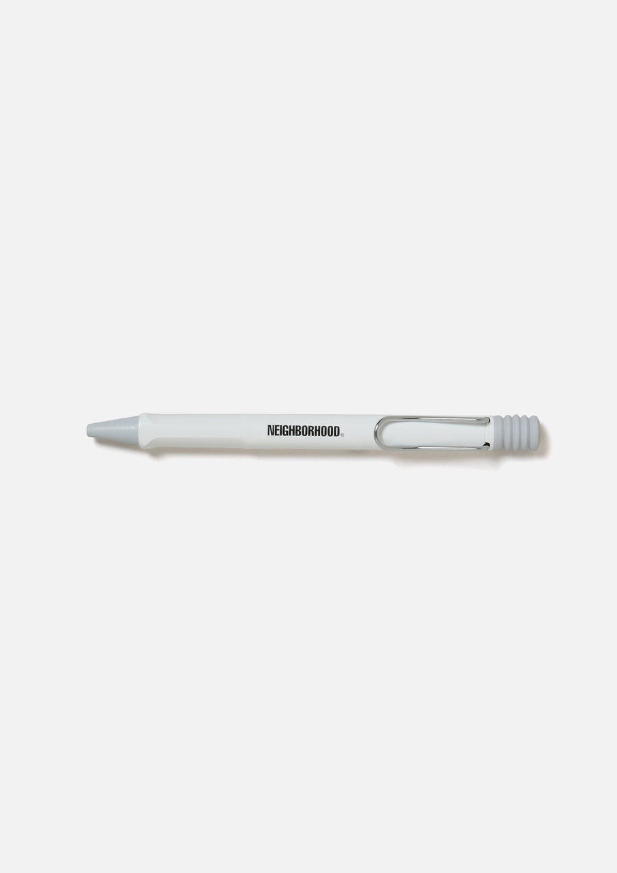 A collaborative item with LAMY. Based on the "Safari Ballpoint Pen," featuring a distinctive spring-loaded clip. The grip section features a printed logo. Designed with an ergonomic grip and a highly durable shock-resistant plastic body.