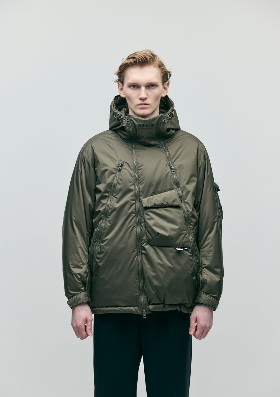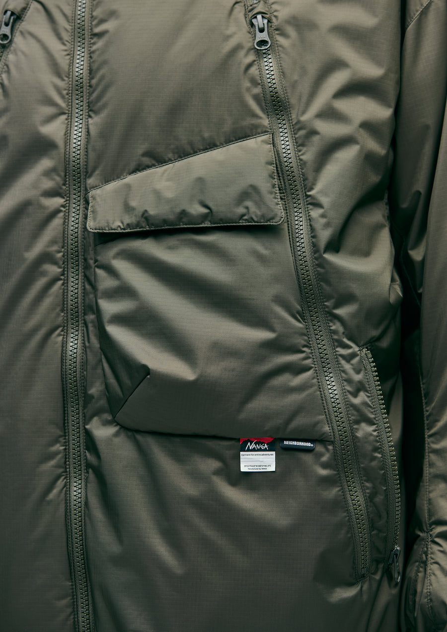 A collaborative item with NANGA, featuring a down jacket made from its original "Aurora-Tex®" fabric, offering both weather resistance and insulation. Filled with 180g of 700FP down. Equipped with utility pockets on the front, sides, and sleeves. Features a full-zip closure and a half-zip ventilation system. Logos from both brands are printed. Updated for the 242 season with refined sizing and pocket details.