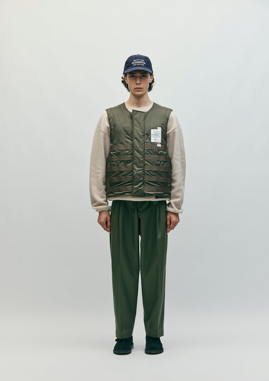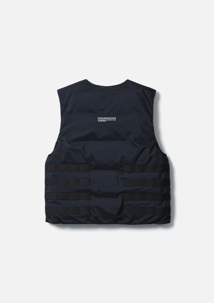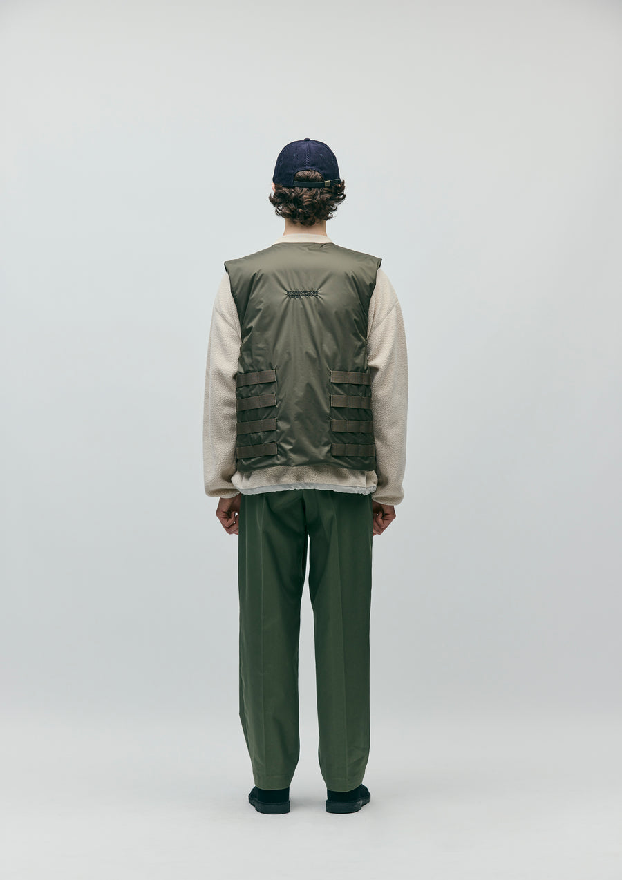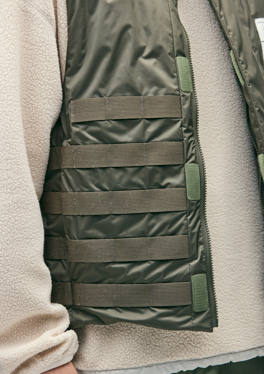 A down vest using NANGA's proprietary fabric "Aurora-Tex®". Filled with 700FP down (80g) for excellent insulation. The multiple tapes on the body function like a daisy chain, allowing carabiners and small items to be attached. The logo is embroidered on the back.