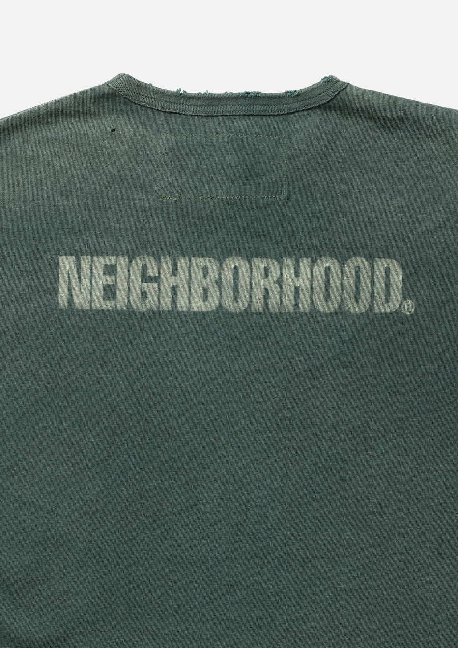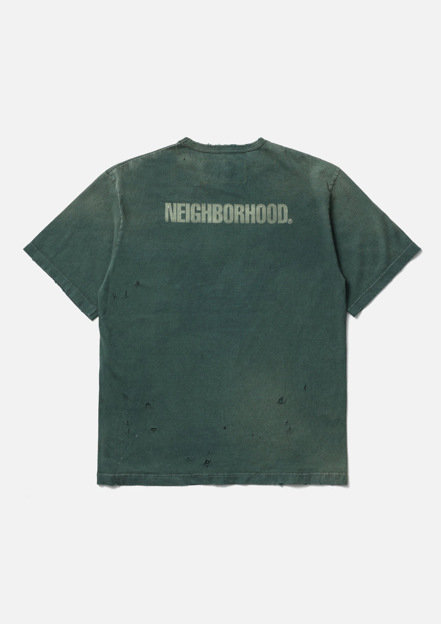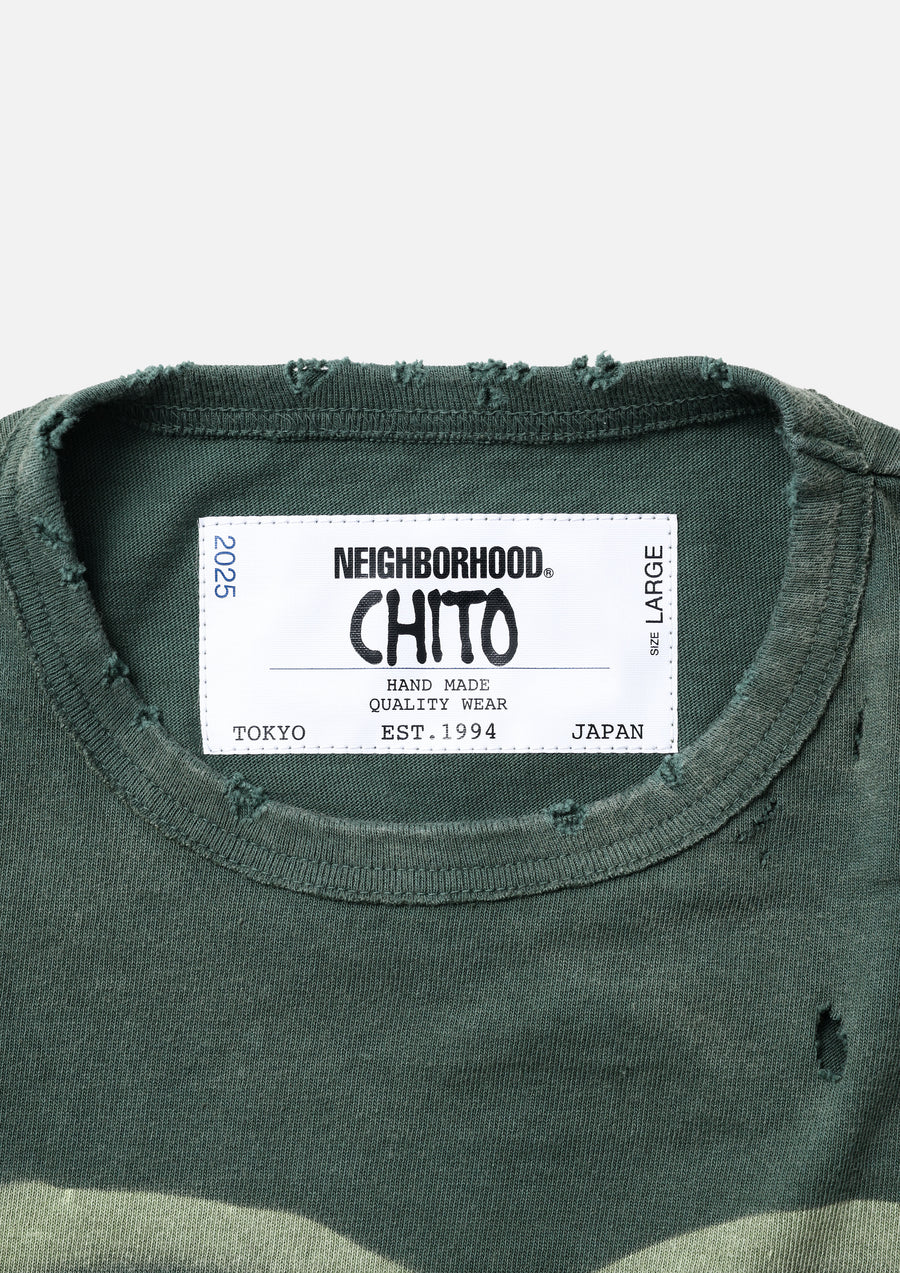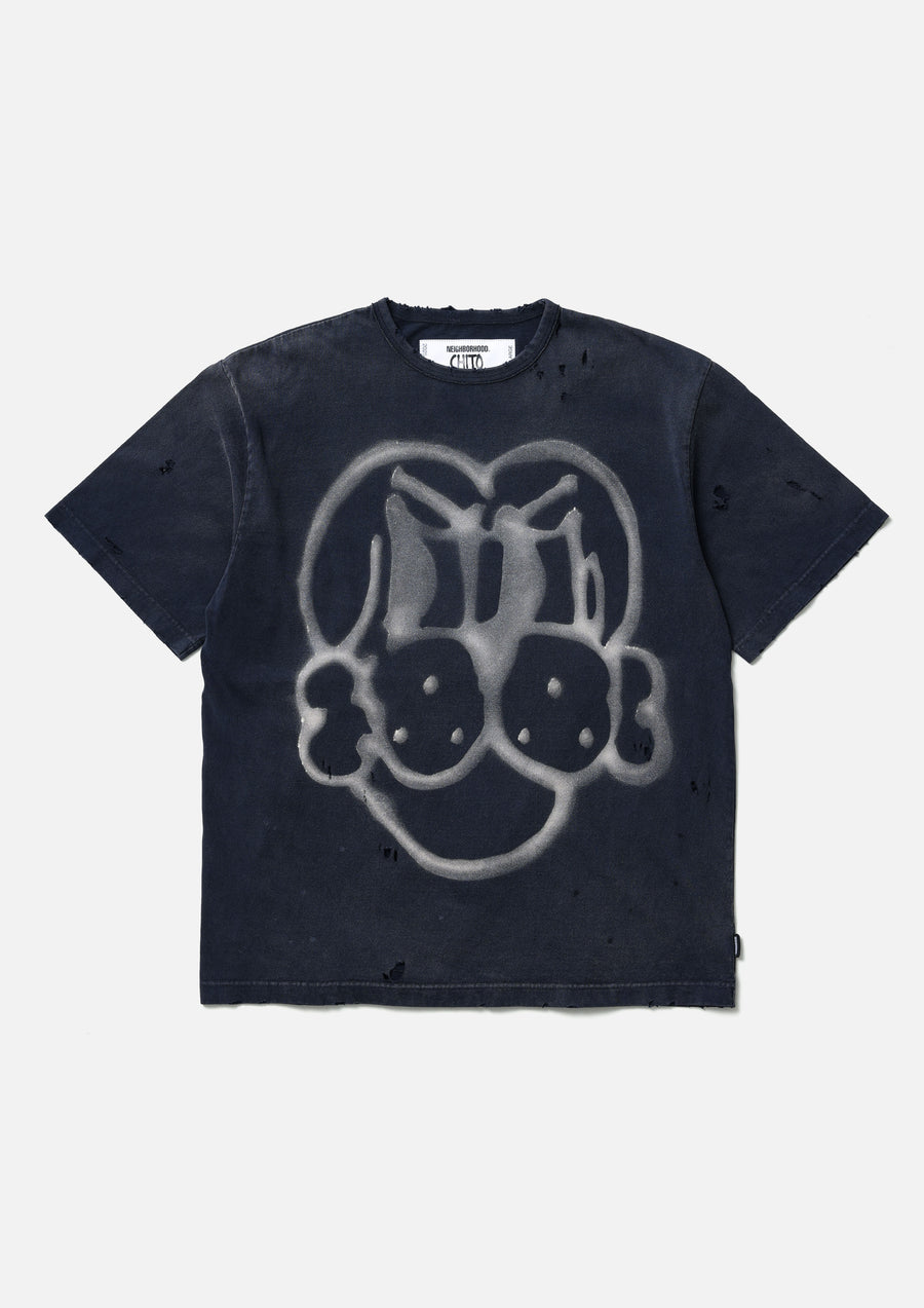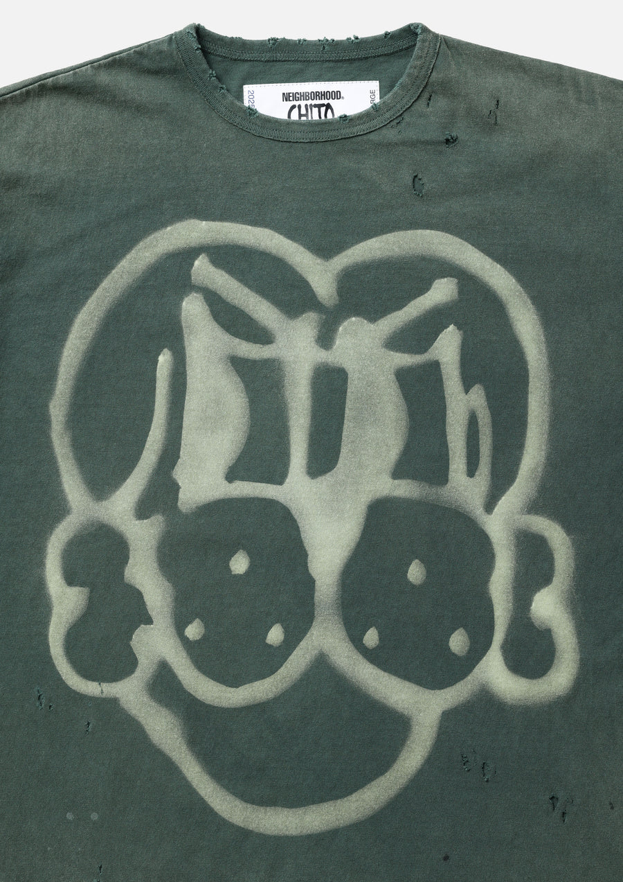 Short-sleeve crewneck cut-and-sewn with savage processing, based on cotton jersey material. Authentic aging is expressed through combined processes including garment washing, distressed holes, and bleaching. Finesse Pup and logo placed in bleach discharge. Includes clip tag at the side seam. Collaboration with CHITO.