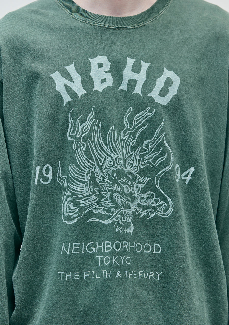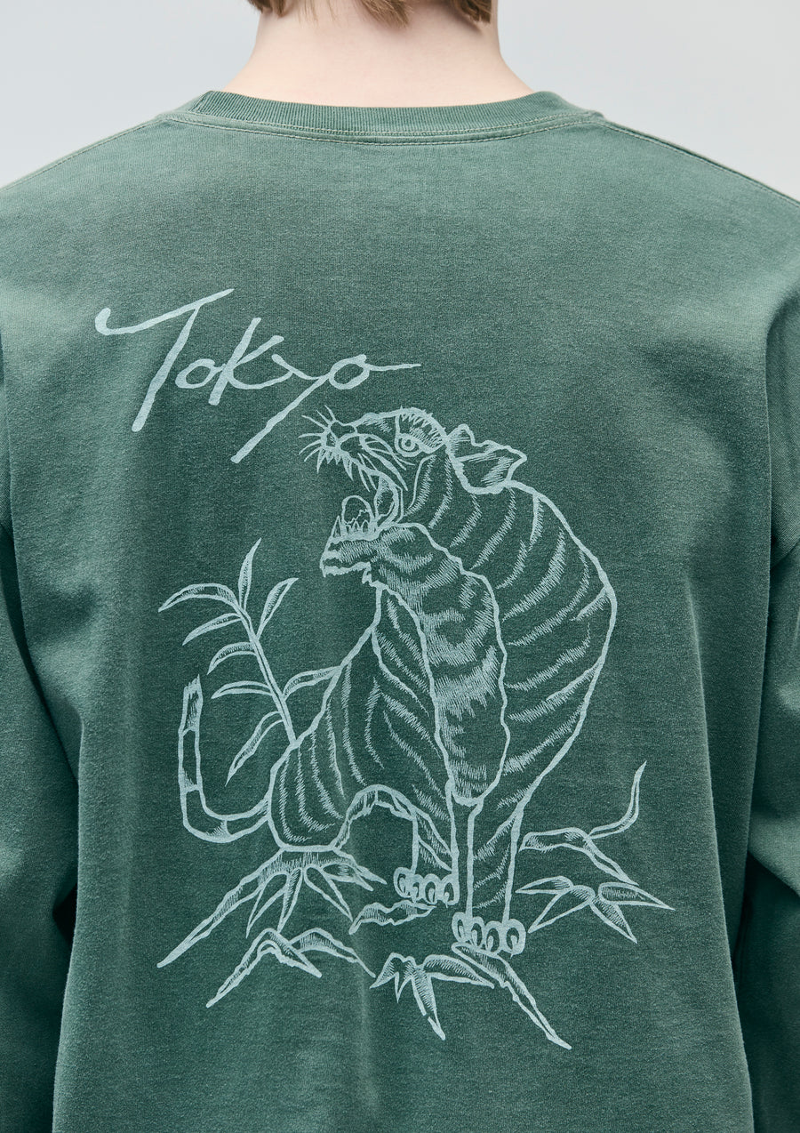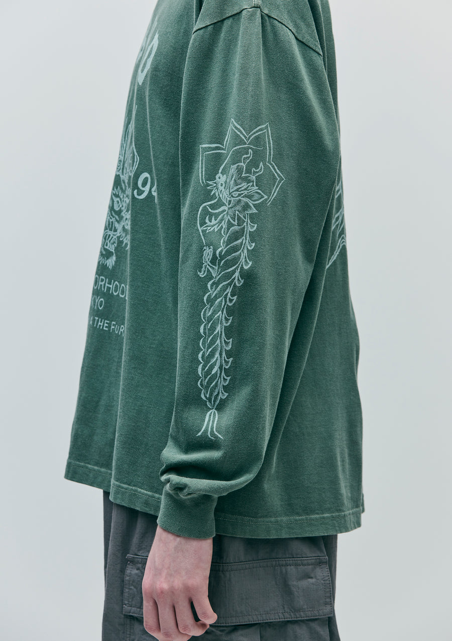 A long-sleeve T-shirt made of an original cotton jersey body, pigment-dyed for a unique finish. Printed graphics on the front, back, and sleeves. One-wash finish.