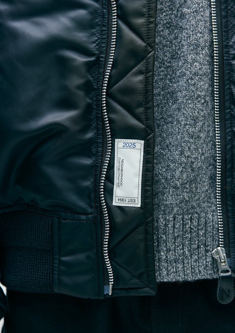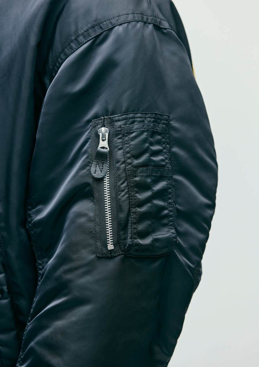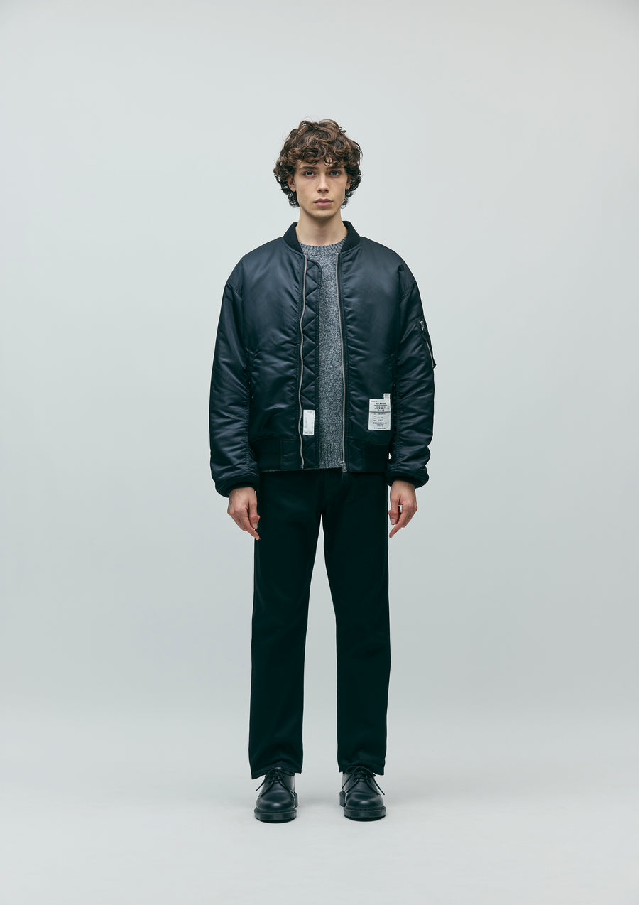 An MA-1 flight jacket made from nylon twill fabric, balancing softness and toughness. The right sleeve and back feature a pub towel and print patch, while the left sleeve has a cigarette pocket. Equipped with original leather zipper pulls and snap buttons. Brand tag on the side seam. The lining is rescue-orange with padding.
