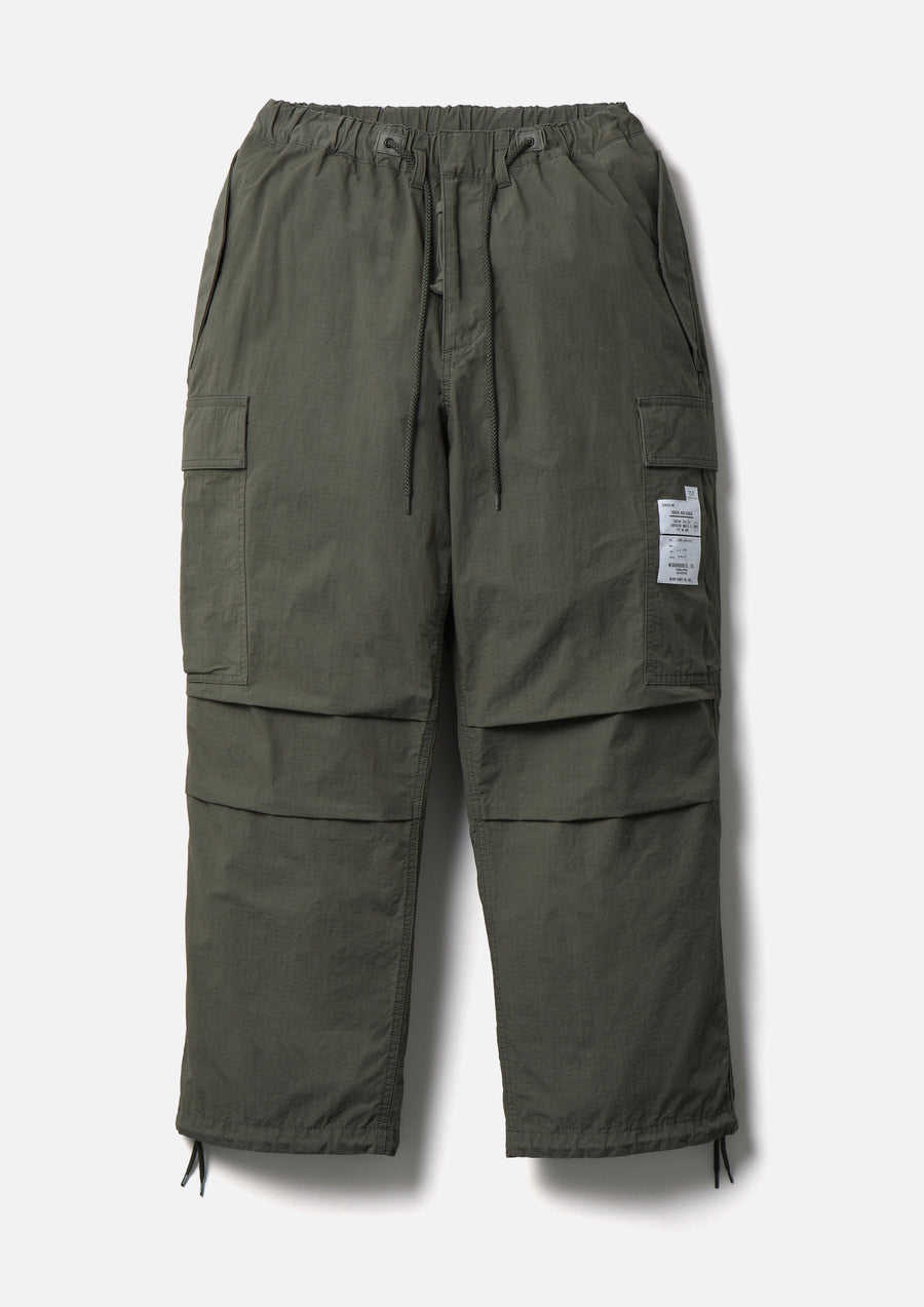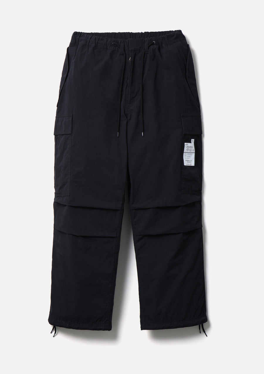 A pair of wide cargo pants made from high-density cotton-nylon ripstop fabric with a washer finish for a natural texture. Features an elastic waistband with an internal drawstring for an easy fit. Flap cargo pockets and hip pockets with hidden snap closures. Adjustable drawstring at the hem. Equipped with an original front zipper, and signature tape. Includes a brand tag on the pocket side. Relaxed silhouette with pleats at the knees.