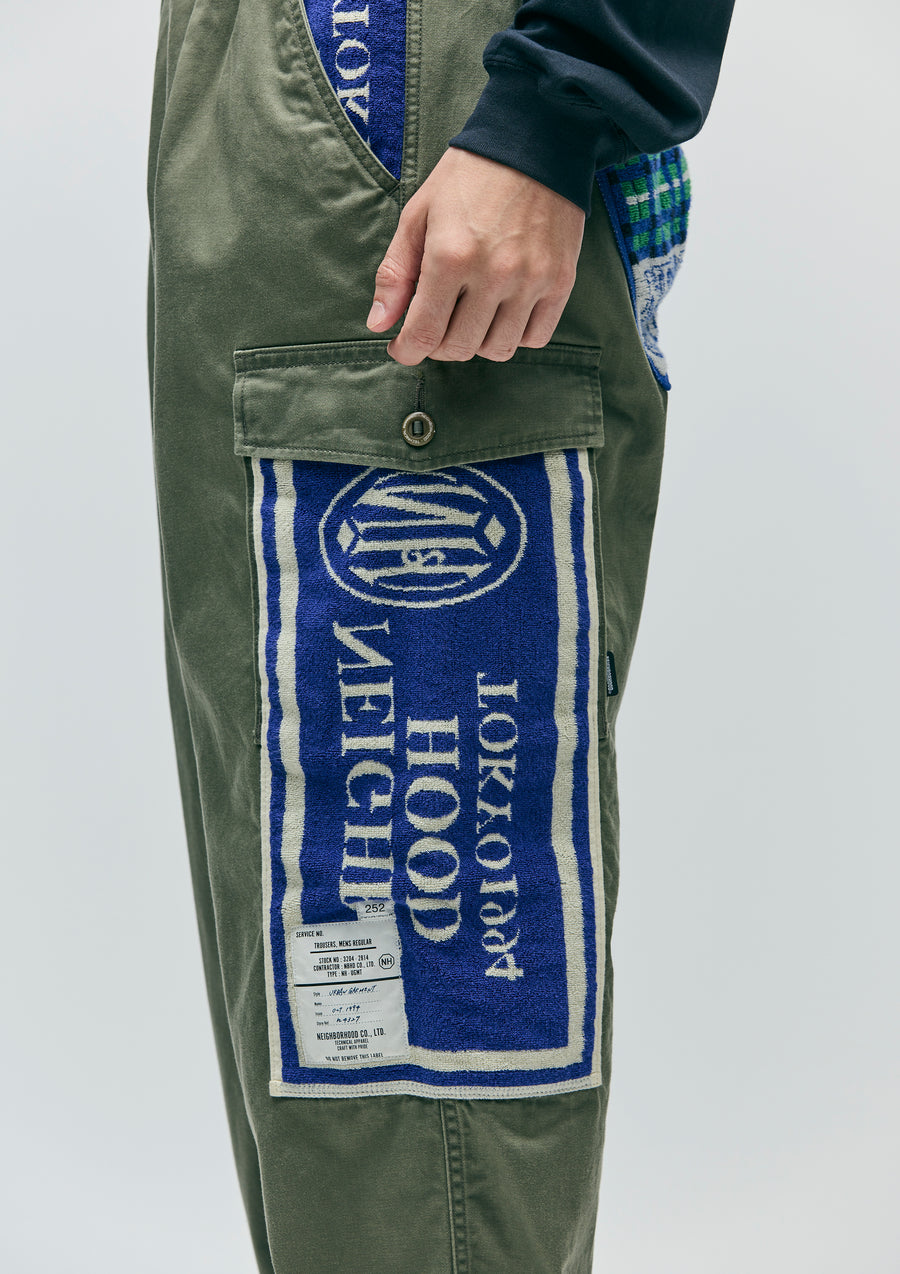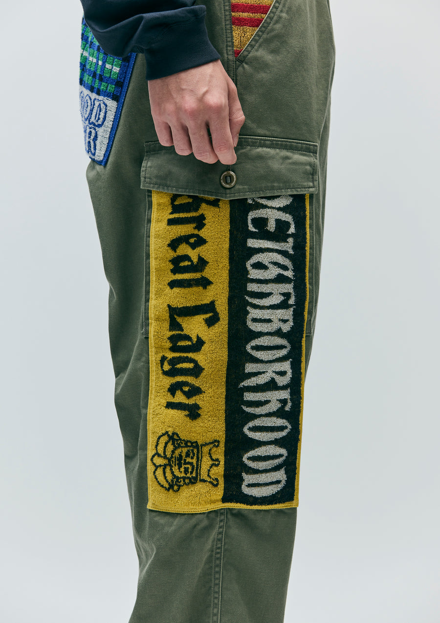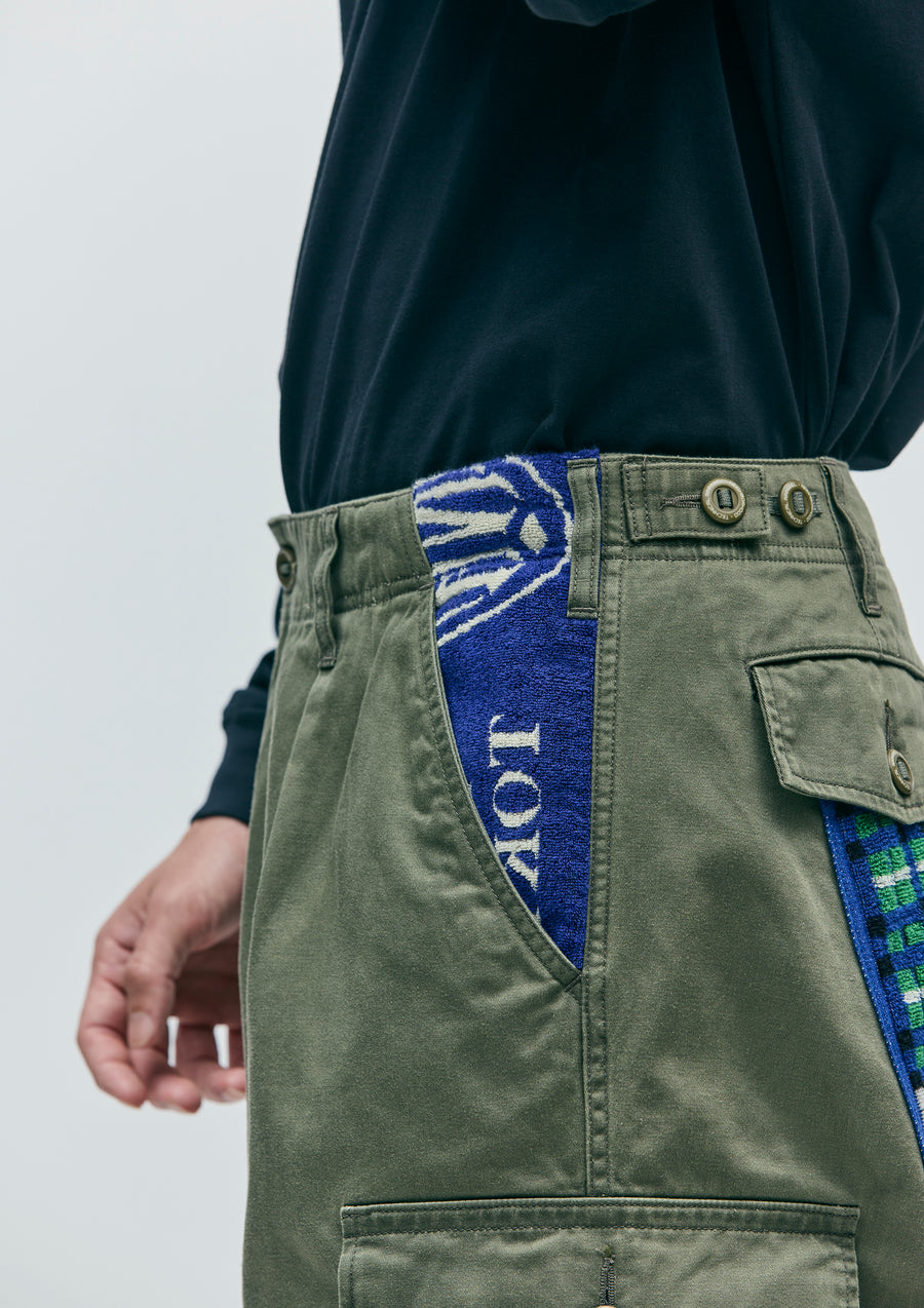 Cargo pants featuring original pub towel detailing on both side pockets and the back. Made from slub-yarn back satin fabric, dyed using both reactive and pigment dyeing techniques. Designed with an original front zipper, signature tape, and parachute buttons. Finished with a brand tag on the pocket. Relaxed silhouette.