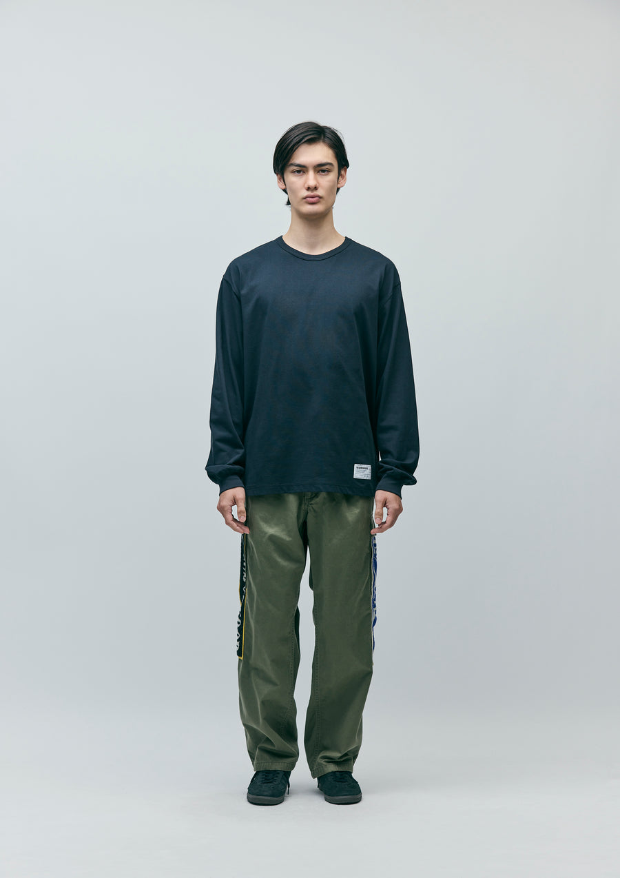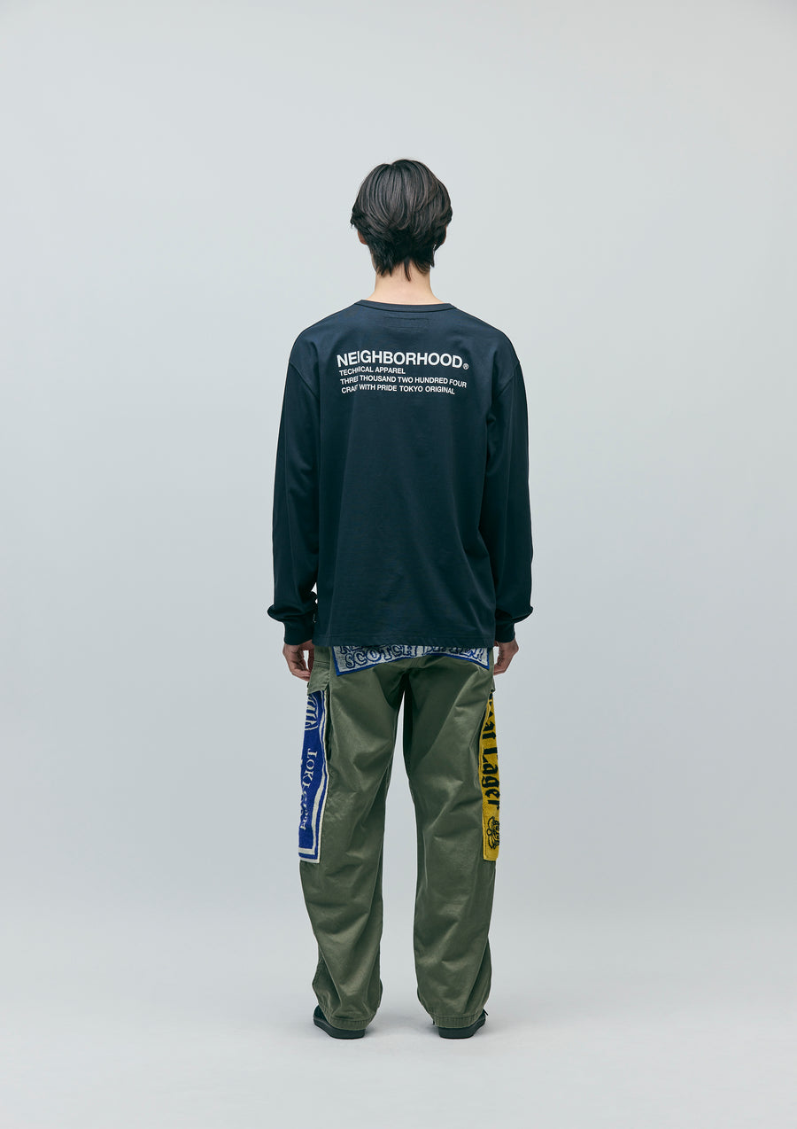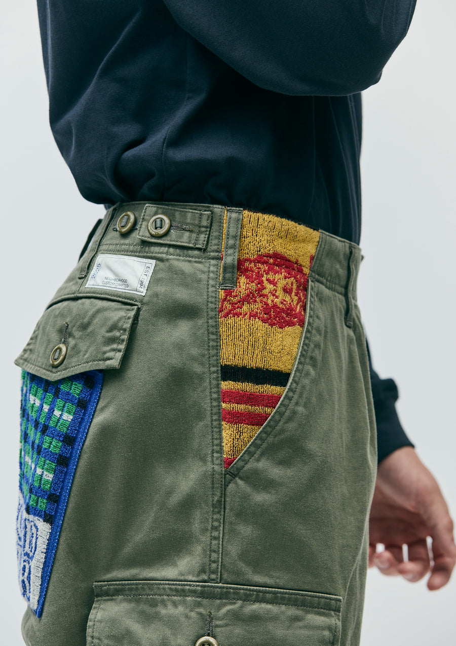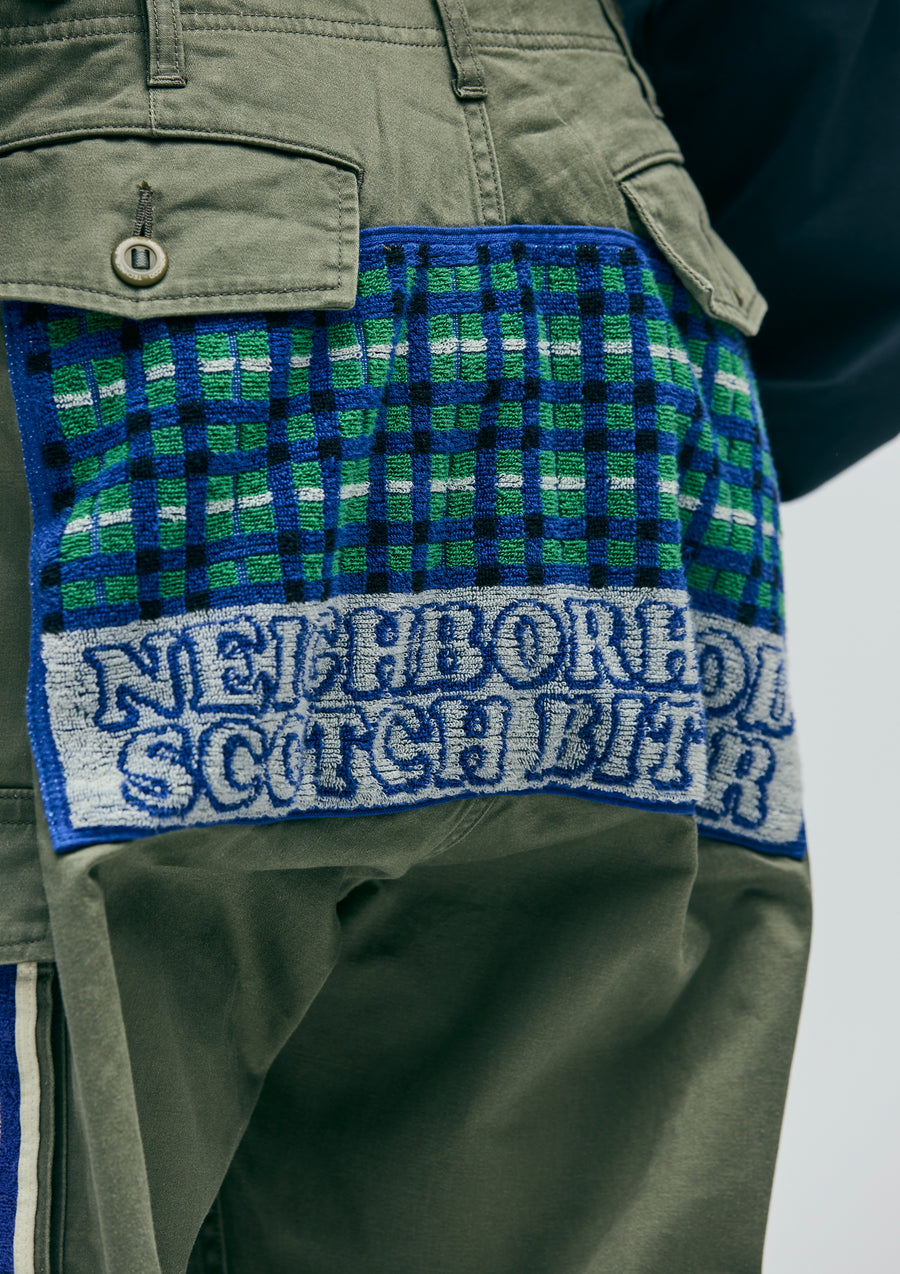 Cargo pants featuring original pub towel detailing on both side pockets and the back. Made from slub-yarn back satin fabric, dyed using both reactive and pigment dyeing techniques. Designed with an original front zipper, signature tape, and parachute buttons. Finished with a brand tag on the pocket. Relaxed silhouette.