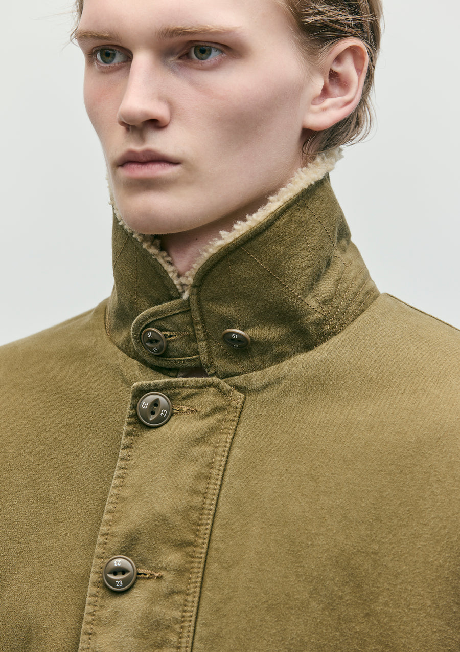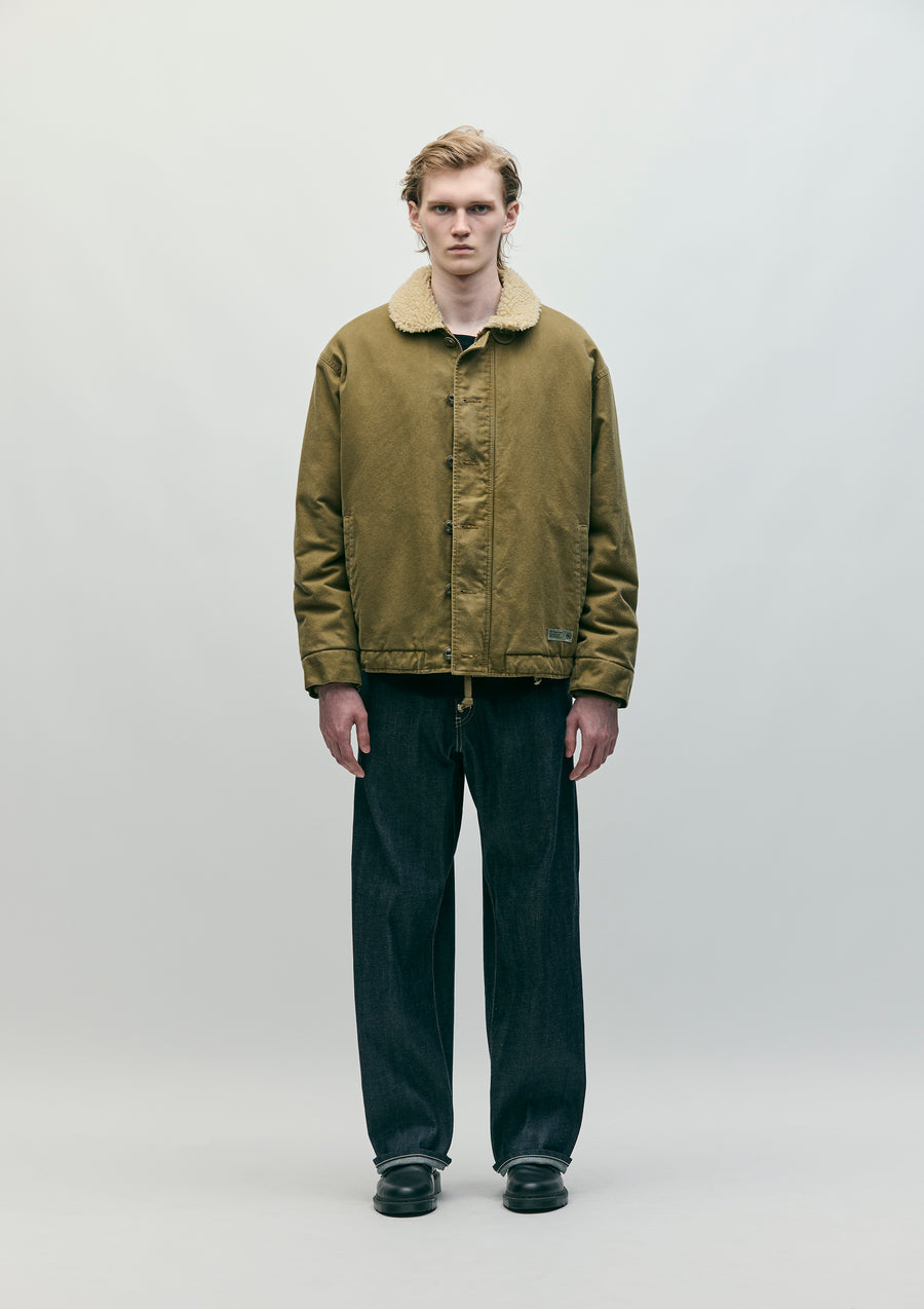 A deck jacket made from sulfur-dyed German cord cloth, featuring a natural fading effect over time. The collar is combined with a boa material. The fabric is durable yet moderately soft. The front closure includes an original buttoned placket and a zipper, while the cuffs have inner ribbed detailing. The hem features an adjustable drawcord. The back is printed with a distressed-style logo. A brand tag is attached to the side seam.