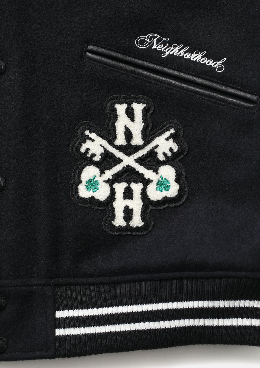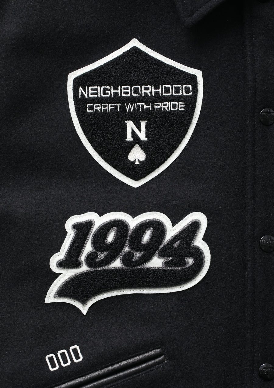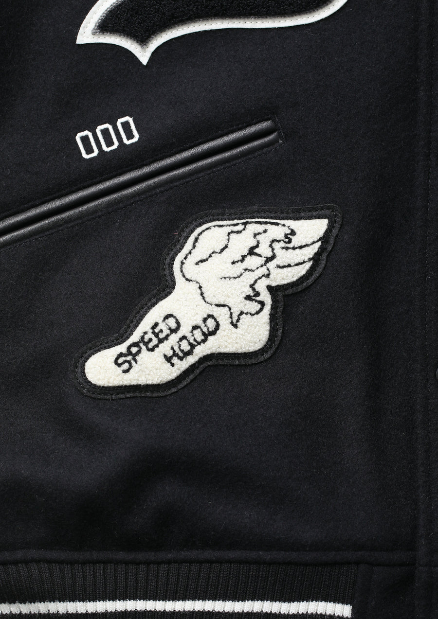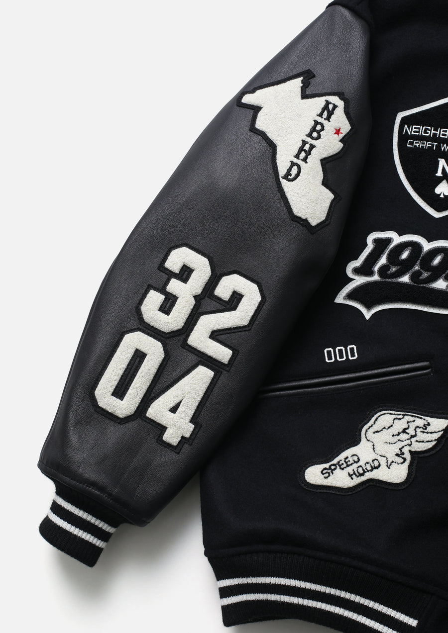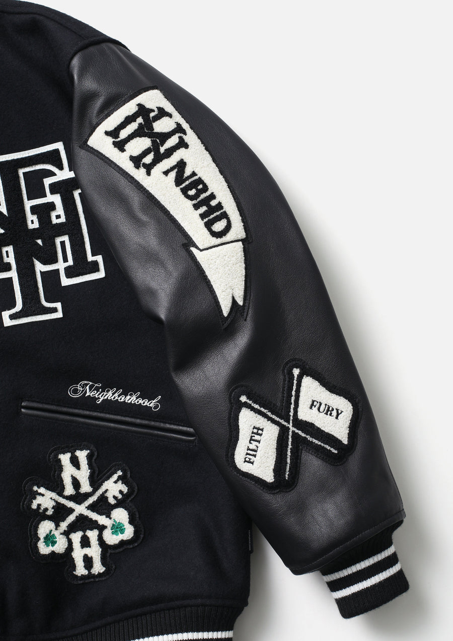 A stadium jacket featuring a heavy Melton wool body paired with cow leather sleeves. Logos and motifs are expressed through embroidered details and patches throughout. Finished with original snap buttons, clip tag at the side seam and a diamond-quilted lining made from custom jacquard fabric. Limited-edition piece, with individual numbering embroidered above both welt pockets.