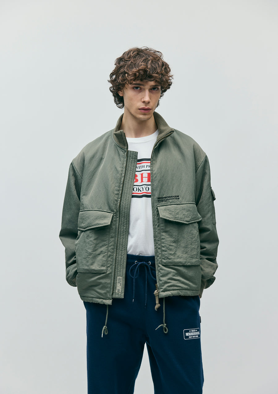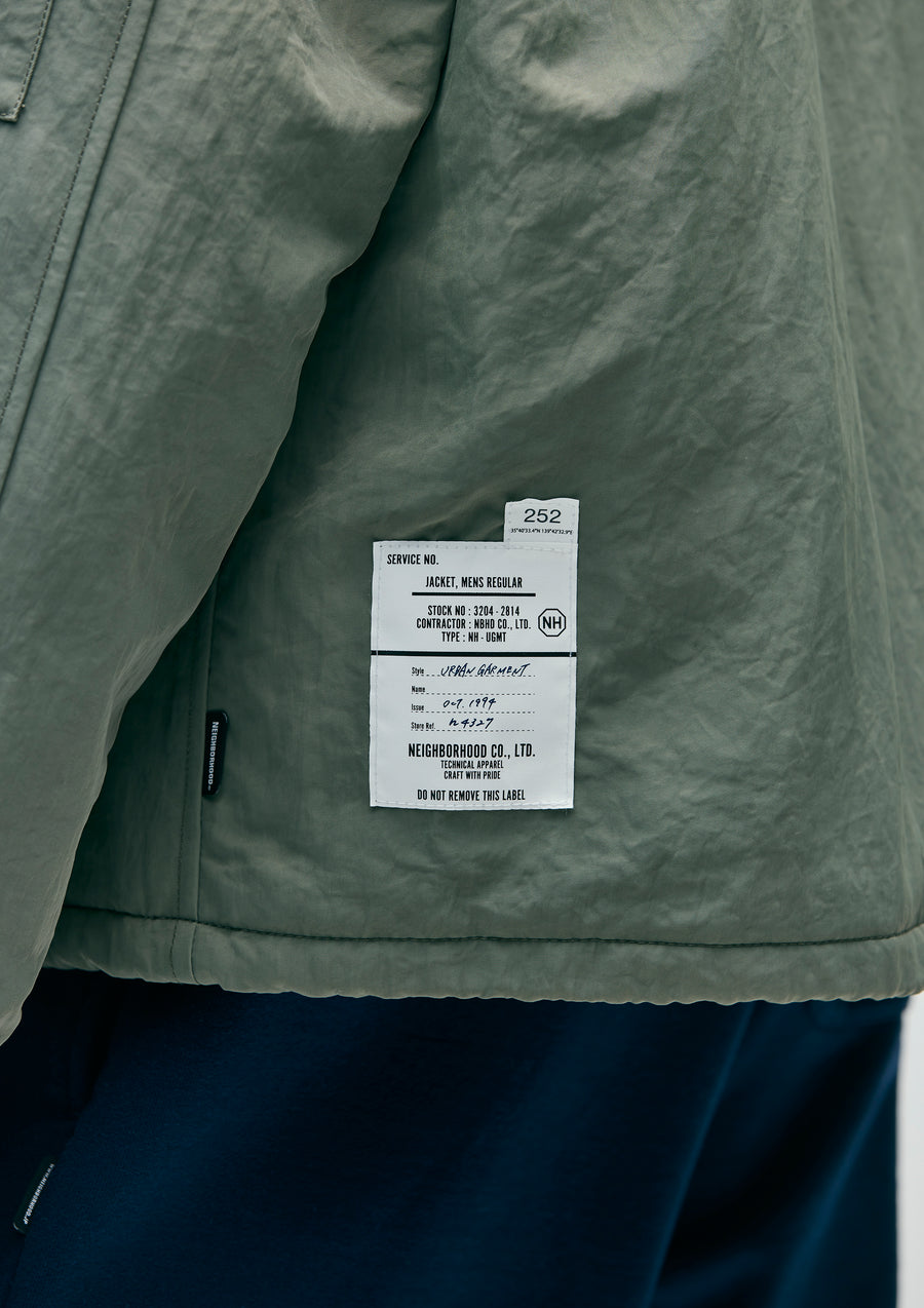 A G-8 style jacket made from water-repellent, cotton-like nylon twill fabric (using recycled nylon materials). Features flap pockets, accessible from both the top and the sides. The hem includes an adjustable drawcord. The logo is embroidered above the pockets. A brand tag is placed under the storm flap, and attached to the side seam.