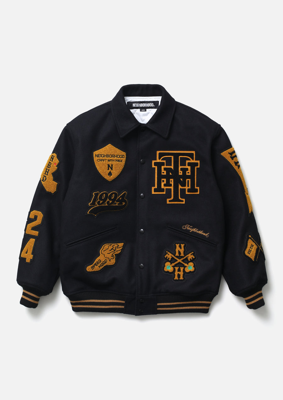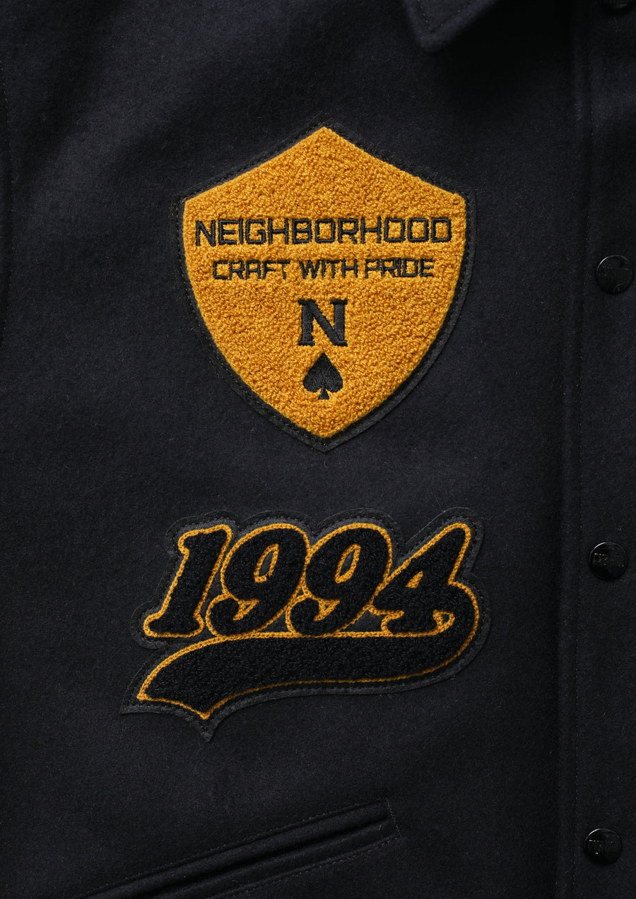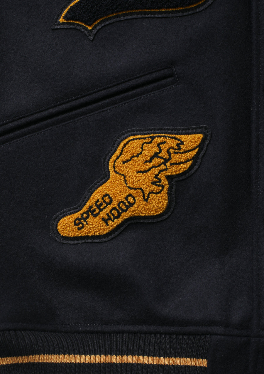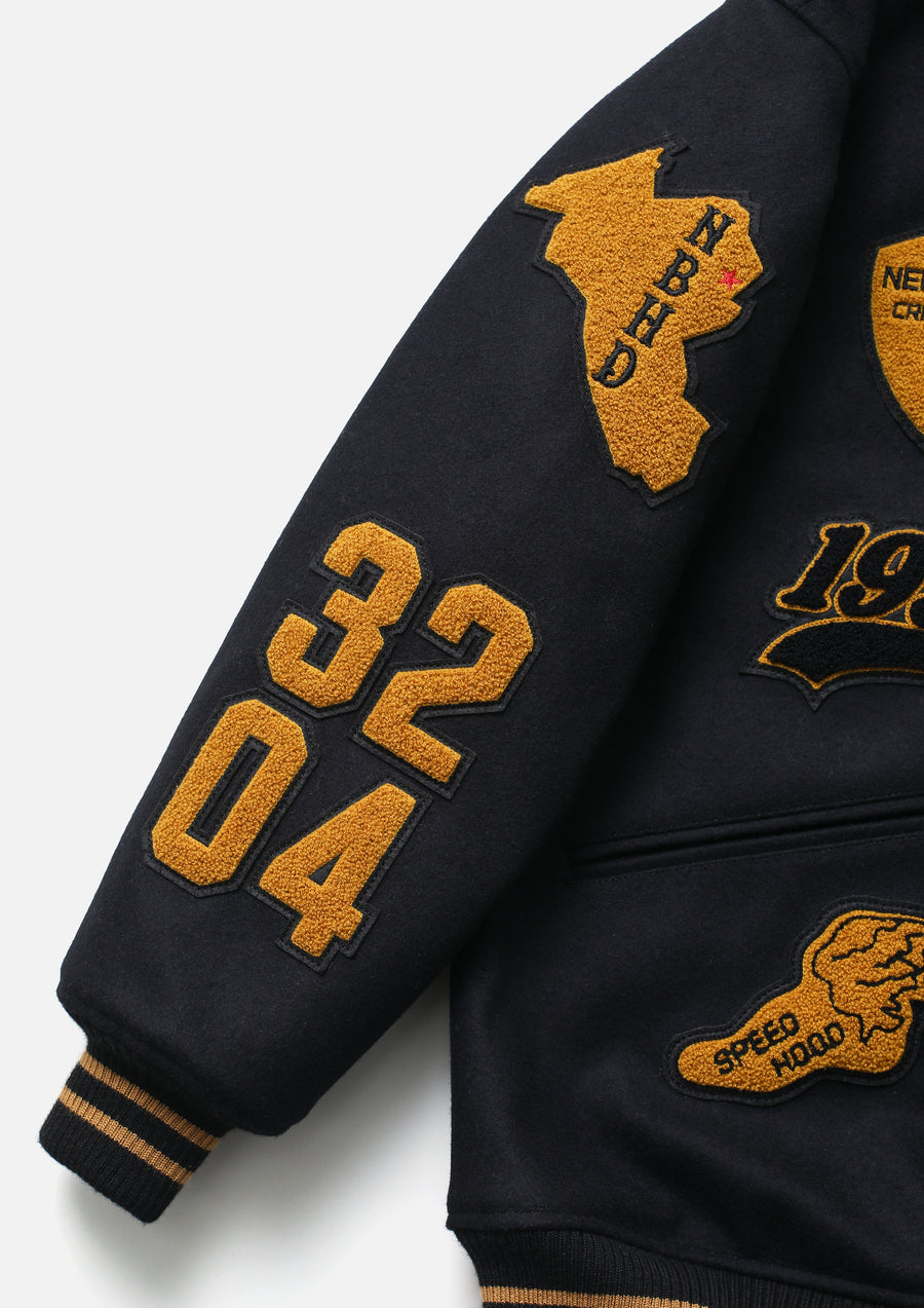 A stadium jacket featuring a heavy Melton wool body and sleeves. Logos and motifs are expressed through embroidered details and patches throughout. Finished with original snap buttons, clip tag at the side seam and a diamond-quilted lining made from custom jacquard fabric.
