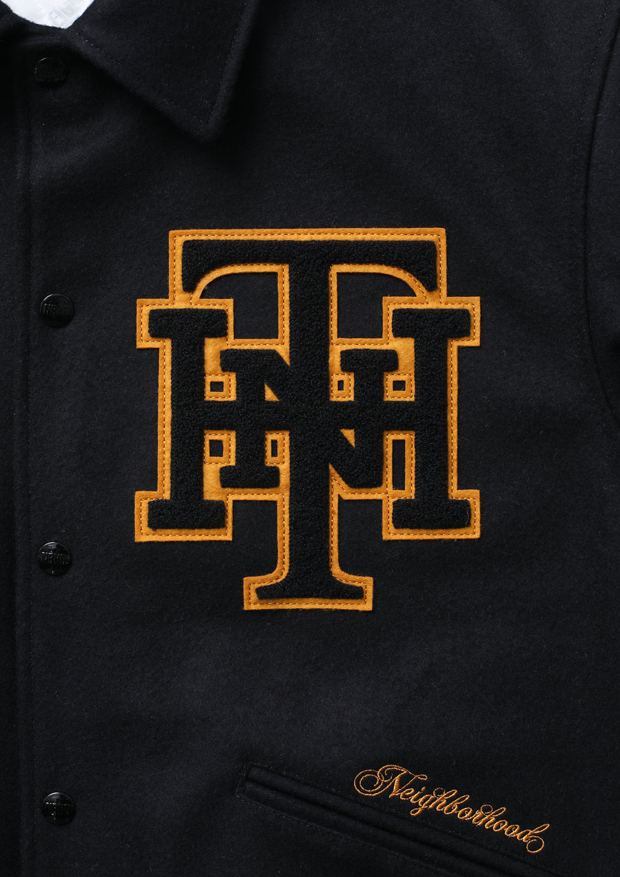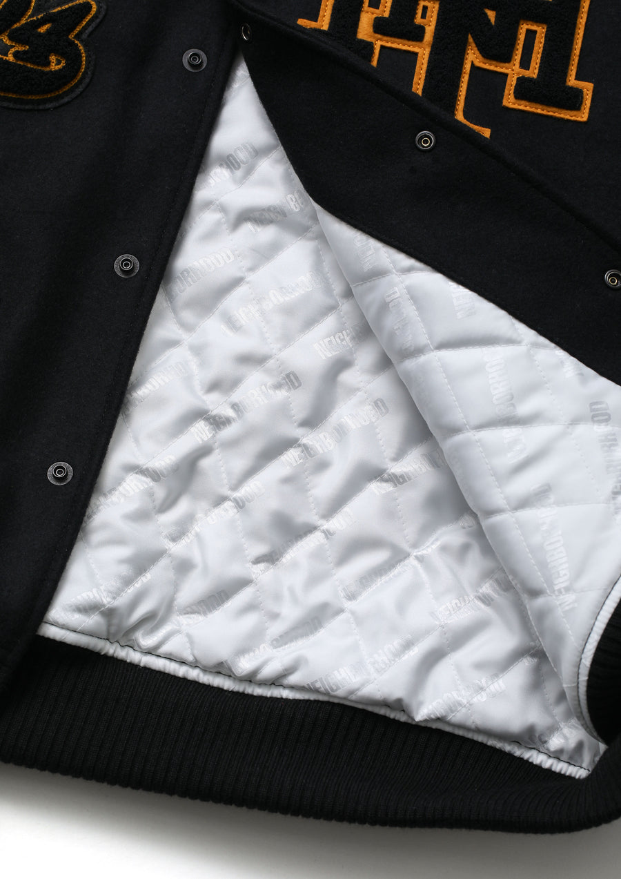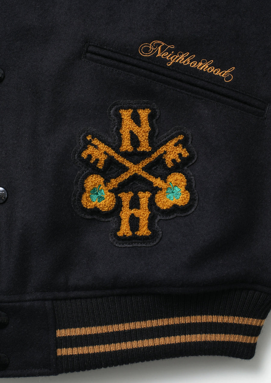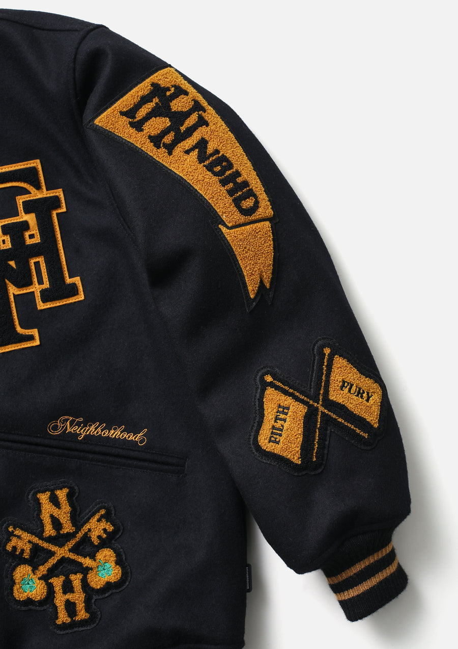 A stadium jacket featuring a heavy Melton wool body and sleeves. Logos and motifs are expressed through embroidered details and patches throughout. Finished with original snap buttons, clip tag at the side seam and a diamond-quilted lining made from custom jacquard fabric.