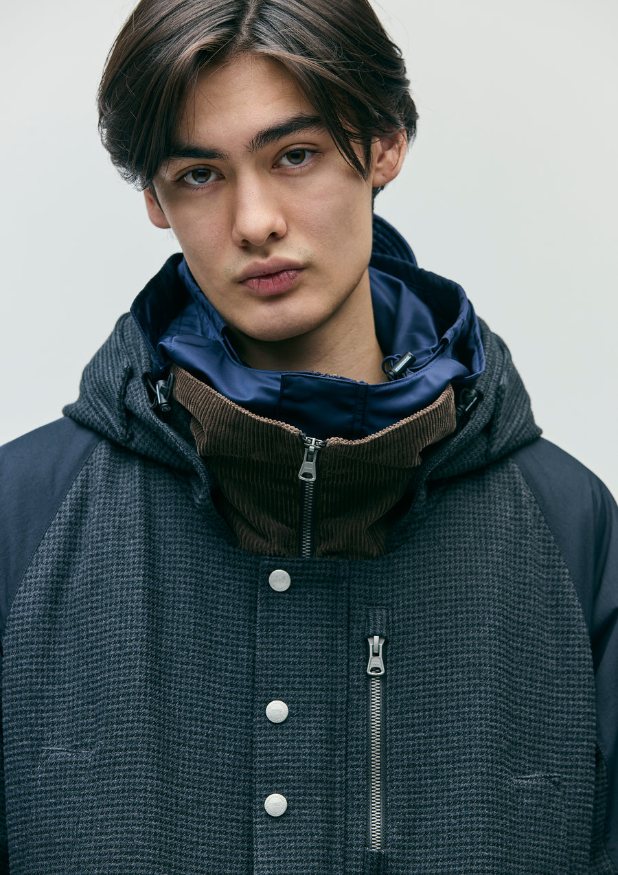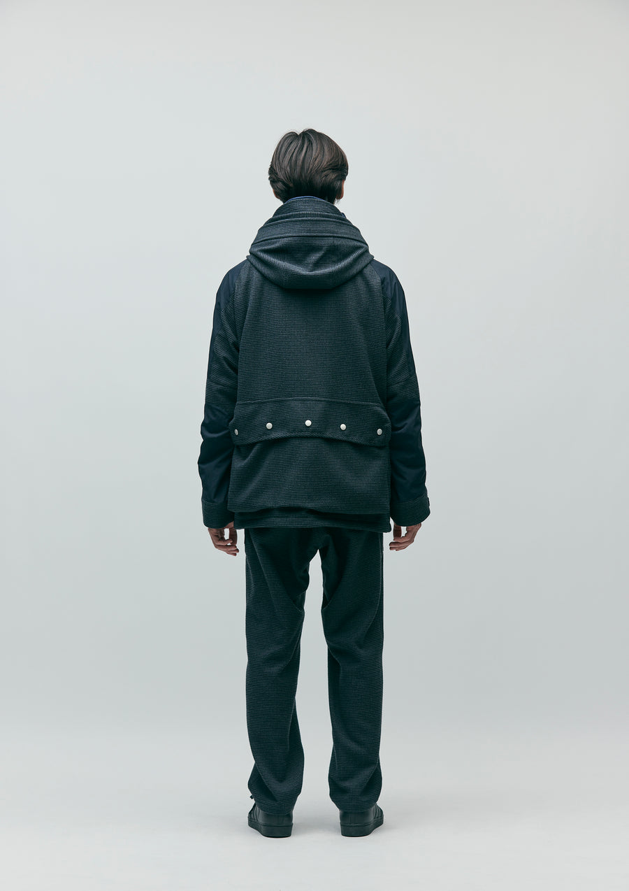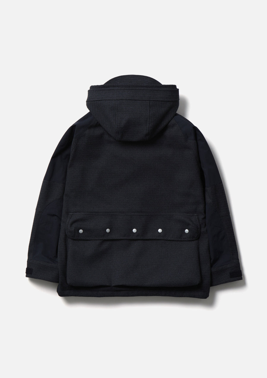 A mountain parka jacket made from an original wool-like houndstooth check fabric blended with SOLOTEX® yarn. The front has a double zipper and snap button closure. The raglan sleeves feature 3D darts. Equipped with gusseted pockets with drainage eyelets and a large flap pocket on the back. The hem includes an adjustable elastic spindle. A brand tag is attached.