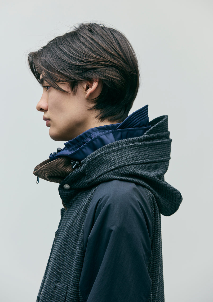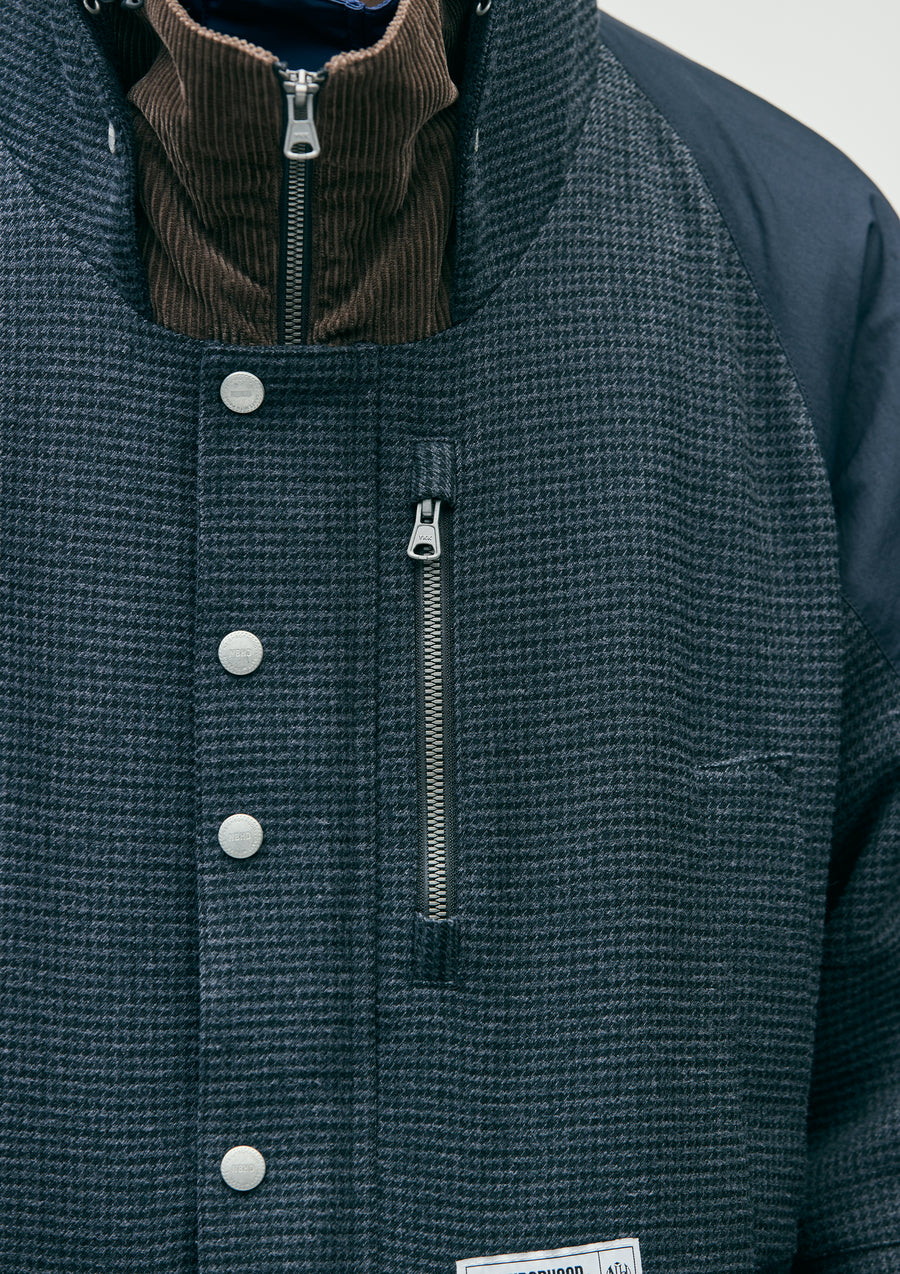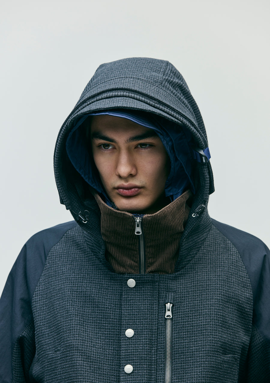 A mountain parka jacket made from an original wool-like houndstooth check fabric blended with SOLOTEX® yarn. The front has a double zipper and snap button closure. The raglan sleeves feature 3D darts. Equipped with gusseted pockets with drainage eyelets and a large flap pocket on the back. The hem includes an adjustable elastic spindle. A brand tag is attached.