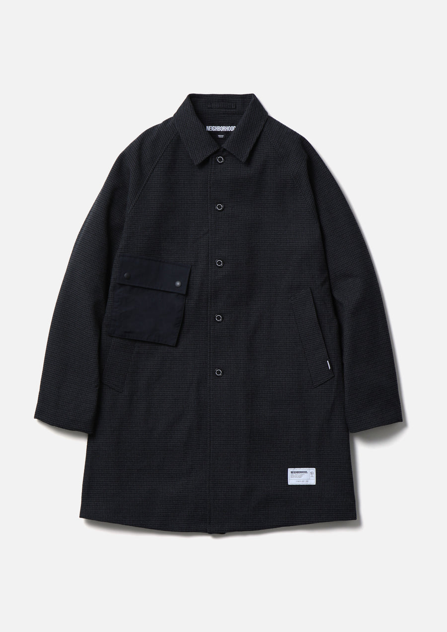 A bal collar coat made from an original wool-like houndstooth check fabric blended with SOLOTEX® yarn. The raglan sleeves have a nylon taffeta underarm panel. Features large gusseted box pockets and a unique plancer-closure pocket on the back. Zipper slits on both sides. A brand tag is attached.