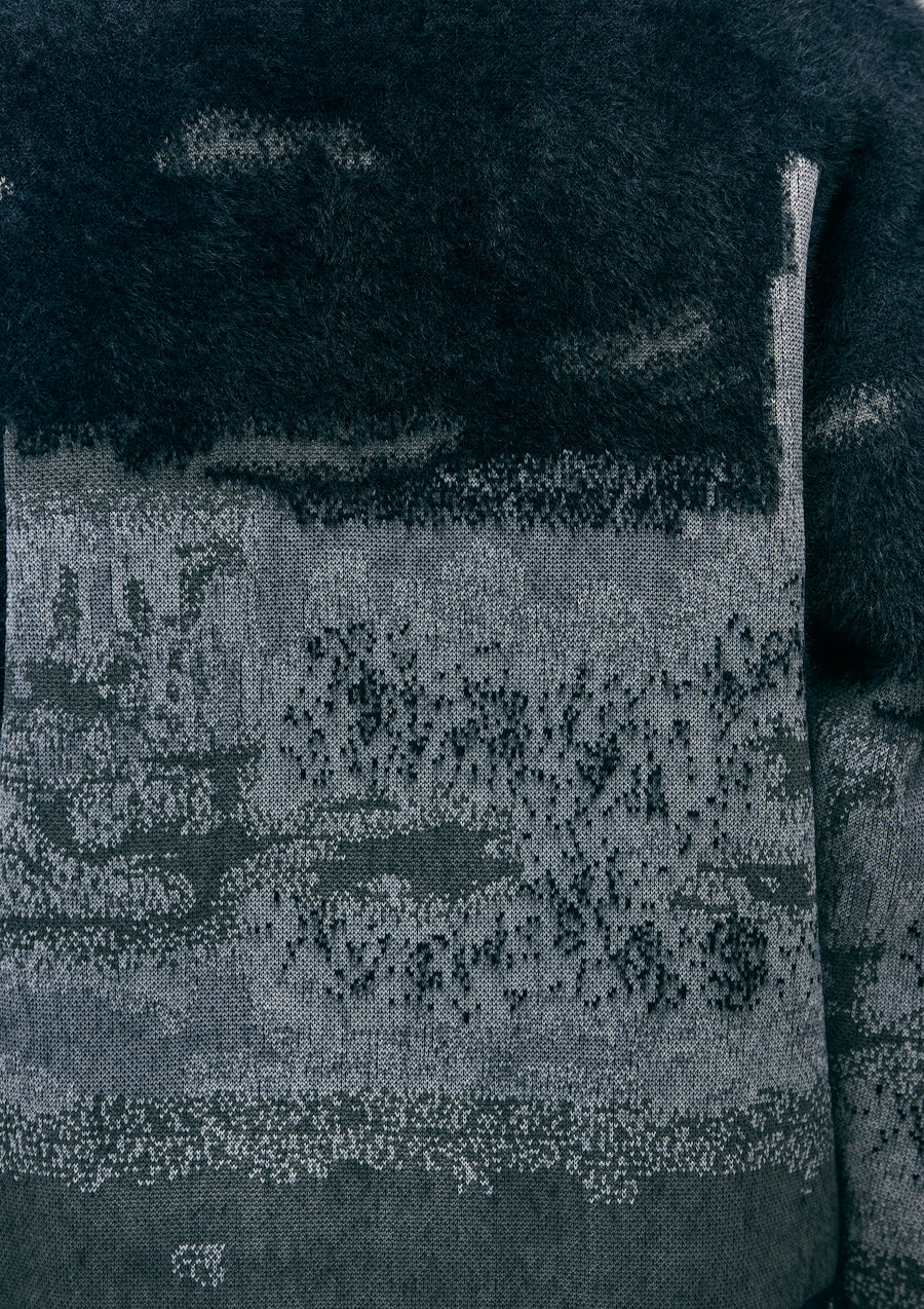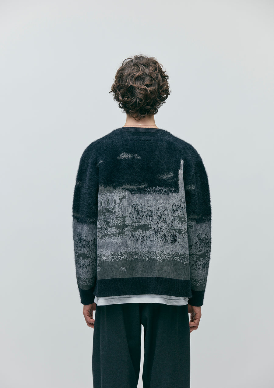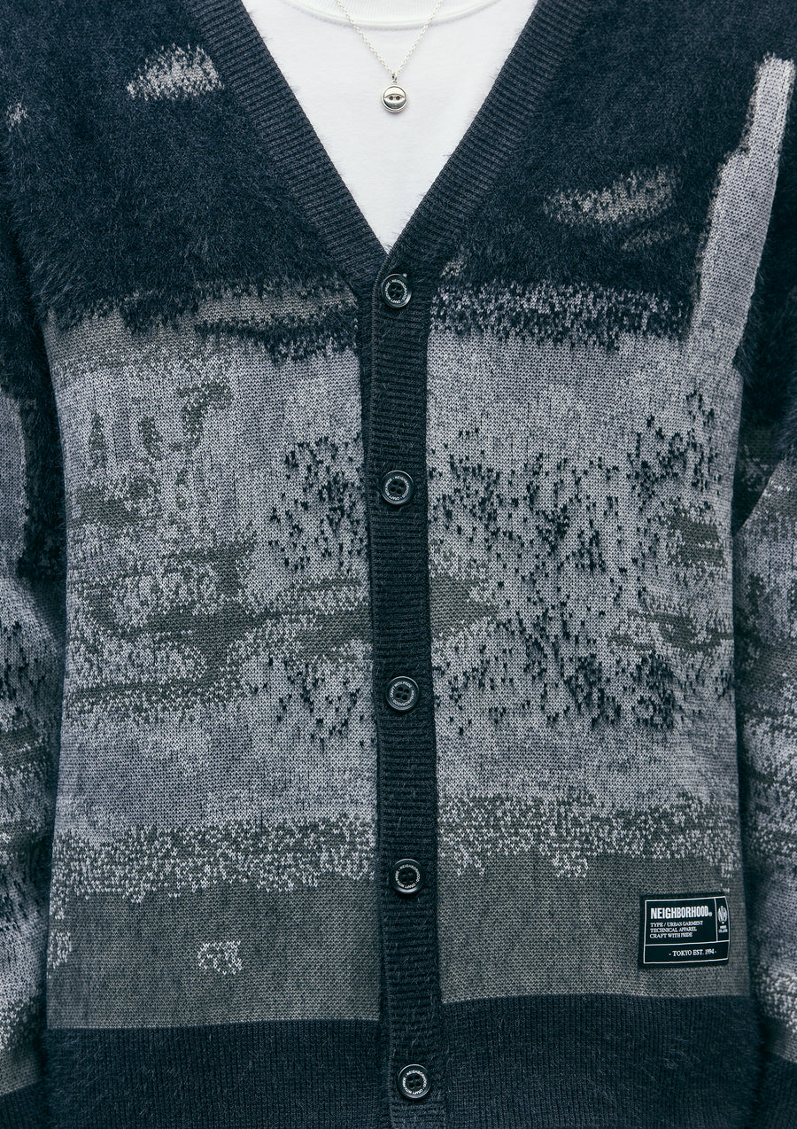 A knit cardigan made from a SOLOTEX® blend, featuring a jacquard-knit landscape pattern. Designed with original buttons and finished with a brand tag on the left hem.