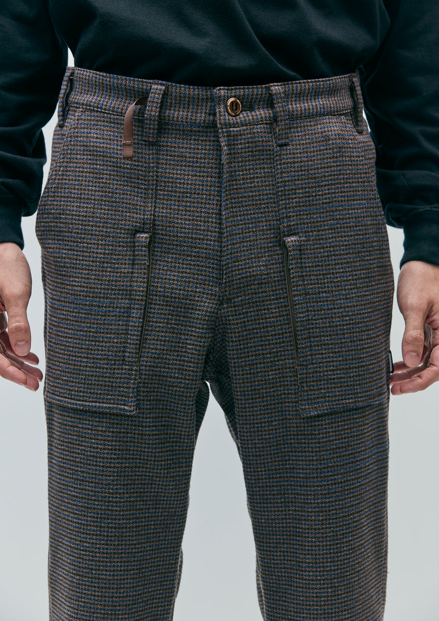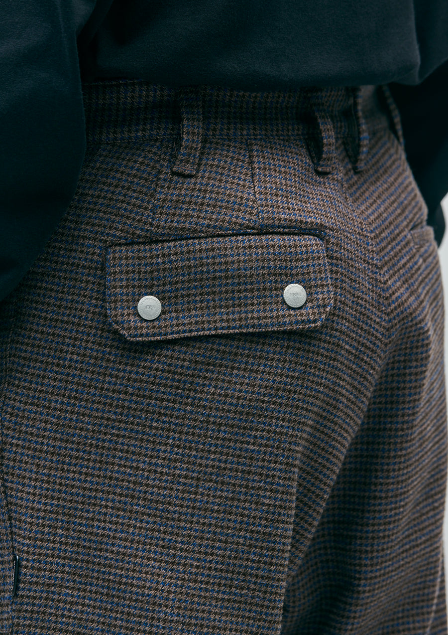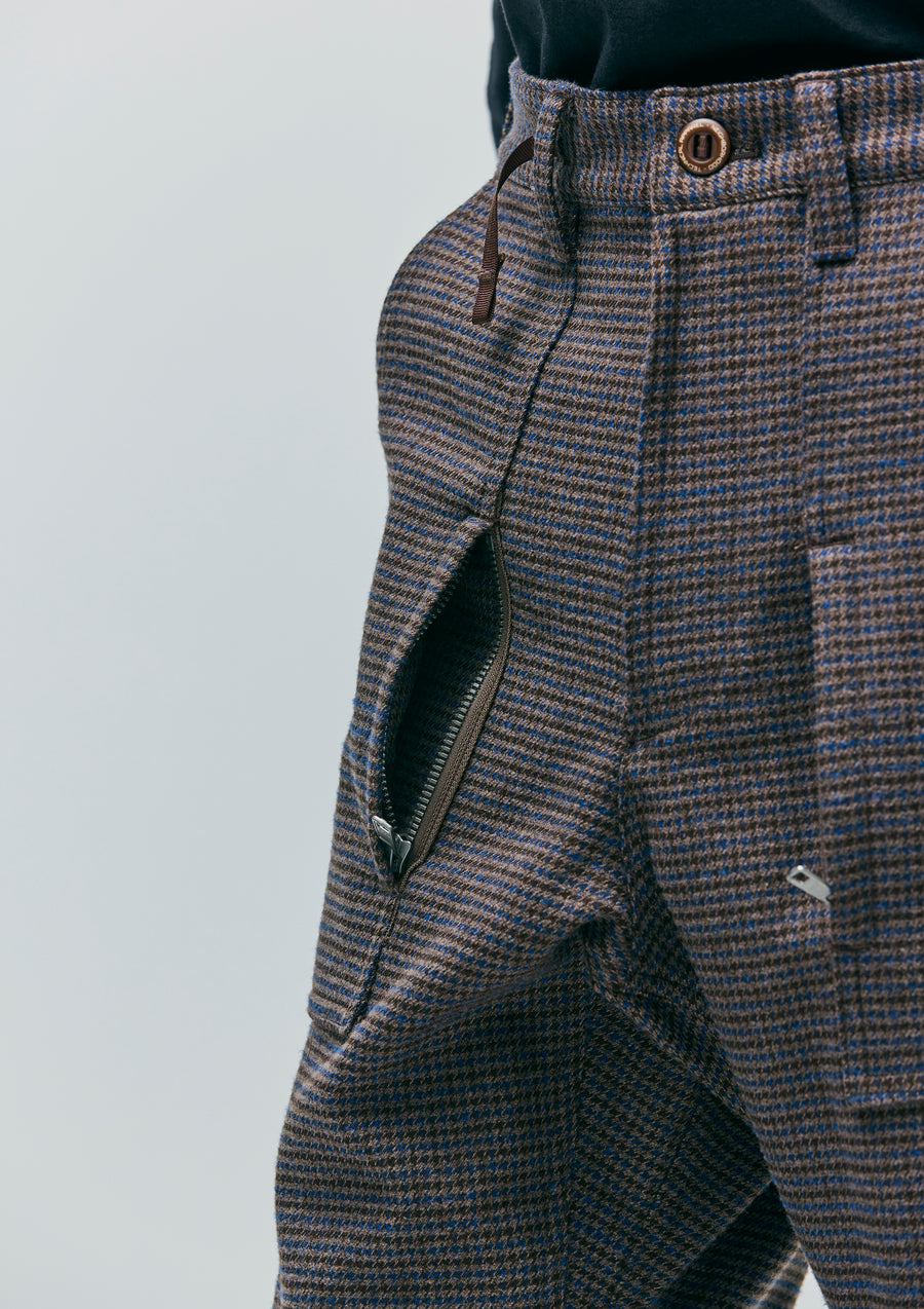 A pair of baker pants made from SOLOTEX® blended glen check fabric. Functional details include zippered side pockets, flap back pockets, and adjustable parachute buttons. Equipped with an original front zipper and a brand tag on the side seam. Features a gusseted crotch for a clean silhouette.
