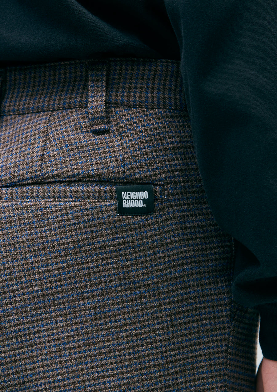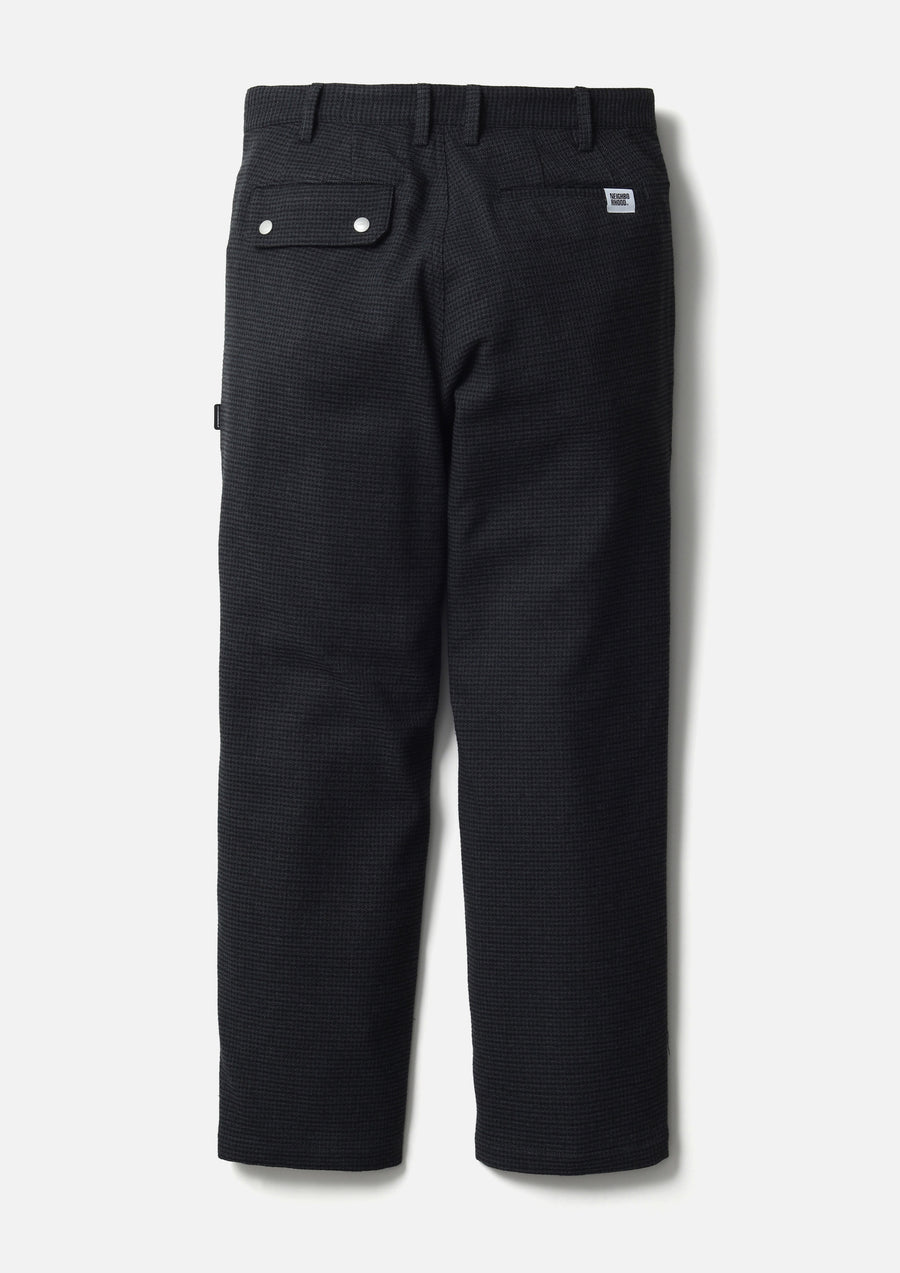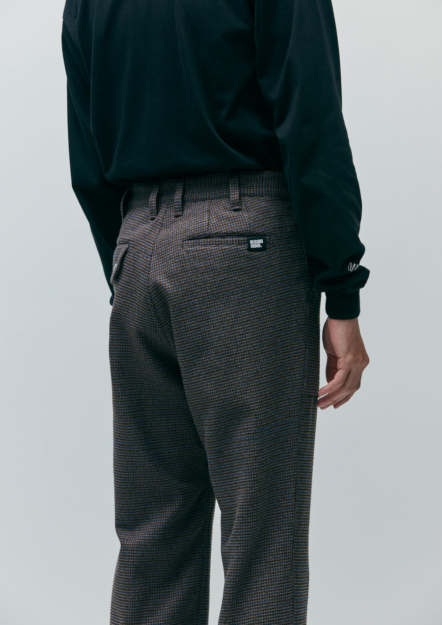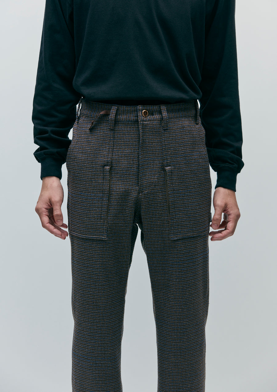 A pair of baker pants made from SOLOTEX® blended glen check fabric. Functional details include zippered side pockets, flap back pockets, and adjustable parachute buttons. Equipped with an original front zipper and a brand tag on the side seam. Features a gusseted crotch for a clean silhouette.