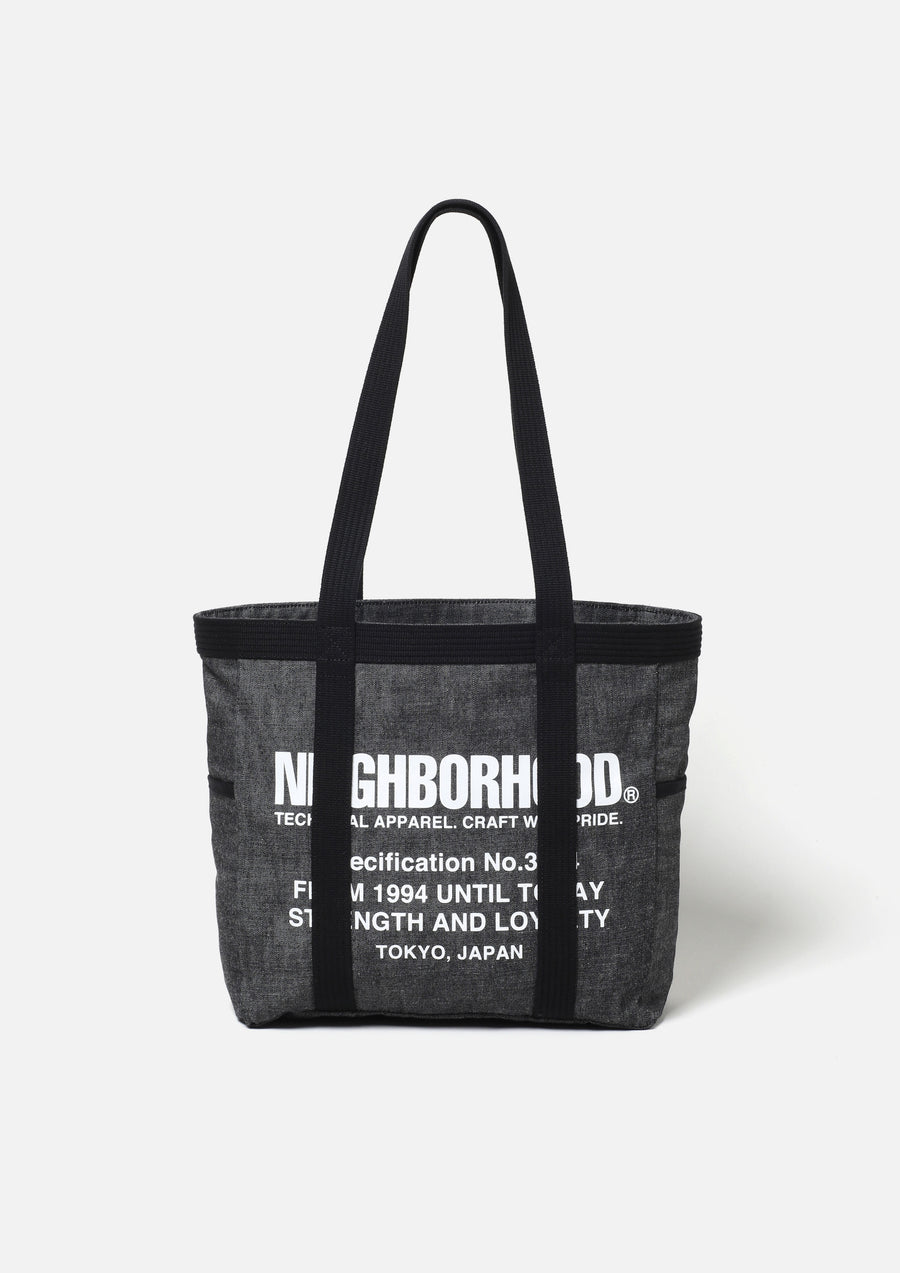 A tote bag made from original 11oz denim fabric. Designed with long handles for shoulder carrying. Features color-coordinated cord-woven handles. Includes an inner pocket. Printed logo on the front.
