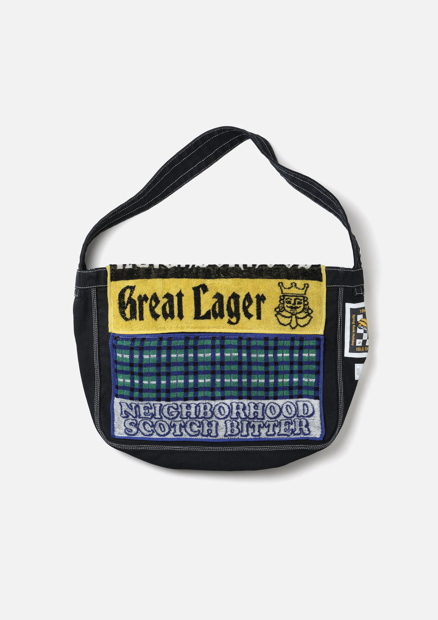 A newspaper bag made from No. 8 canvas with high durability, treated with bio-stone wash processing. One side is decorated with an original pub towel, and a scooter motif patch is placed on the side. Comes with a dedicated name tag for custom-crafted items.