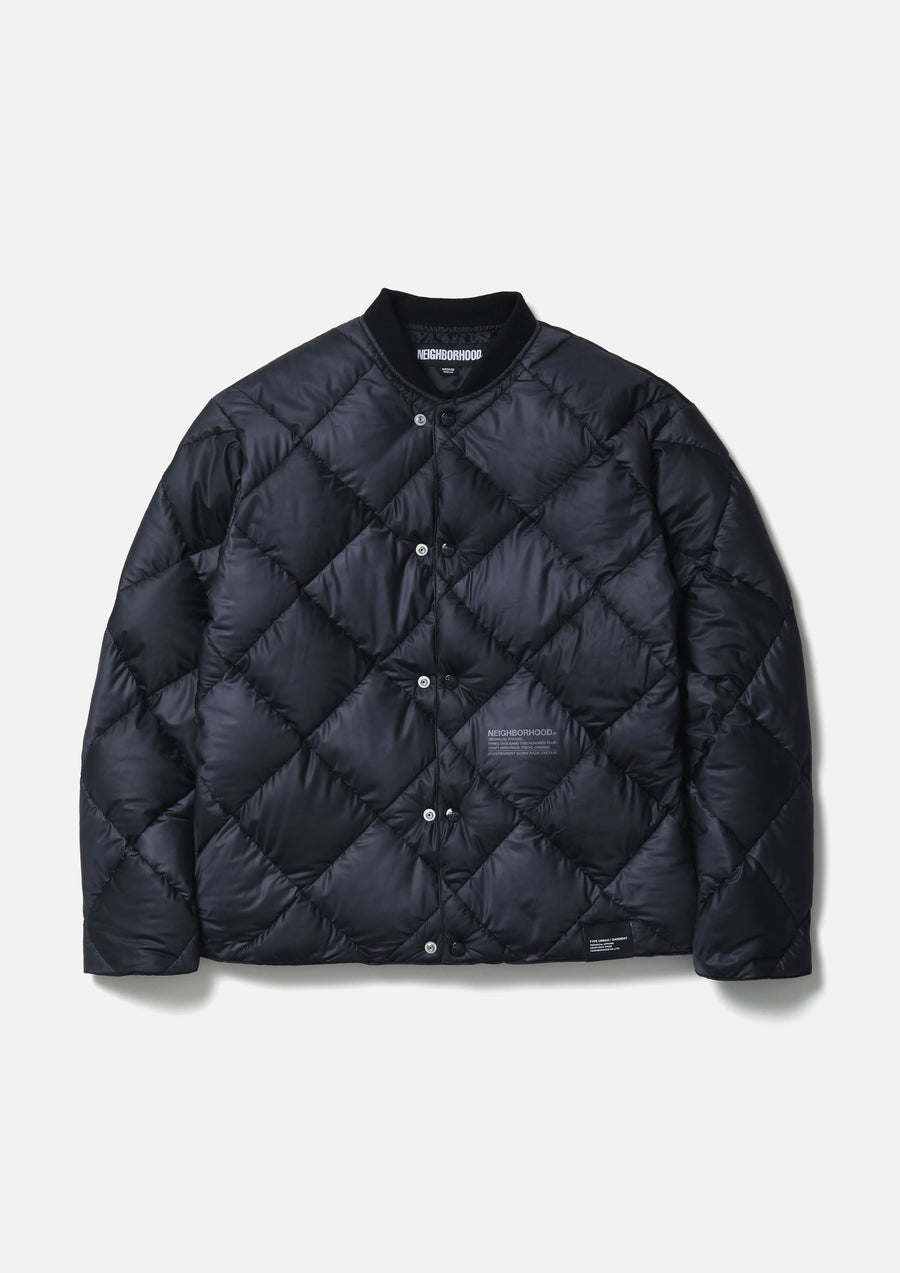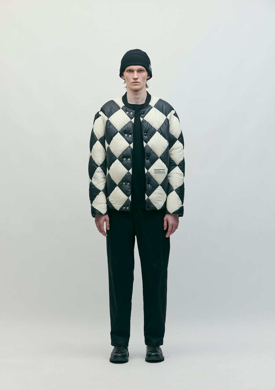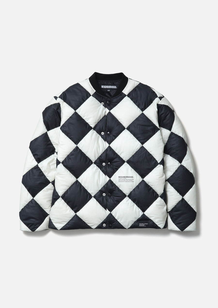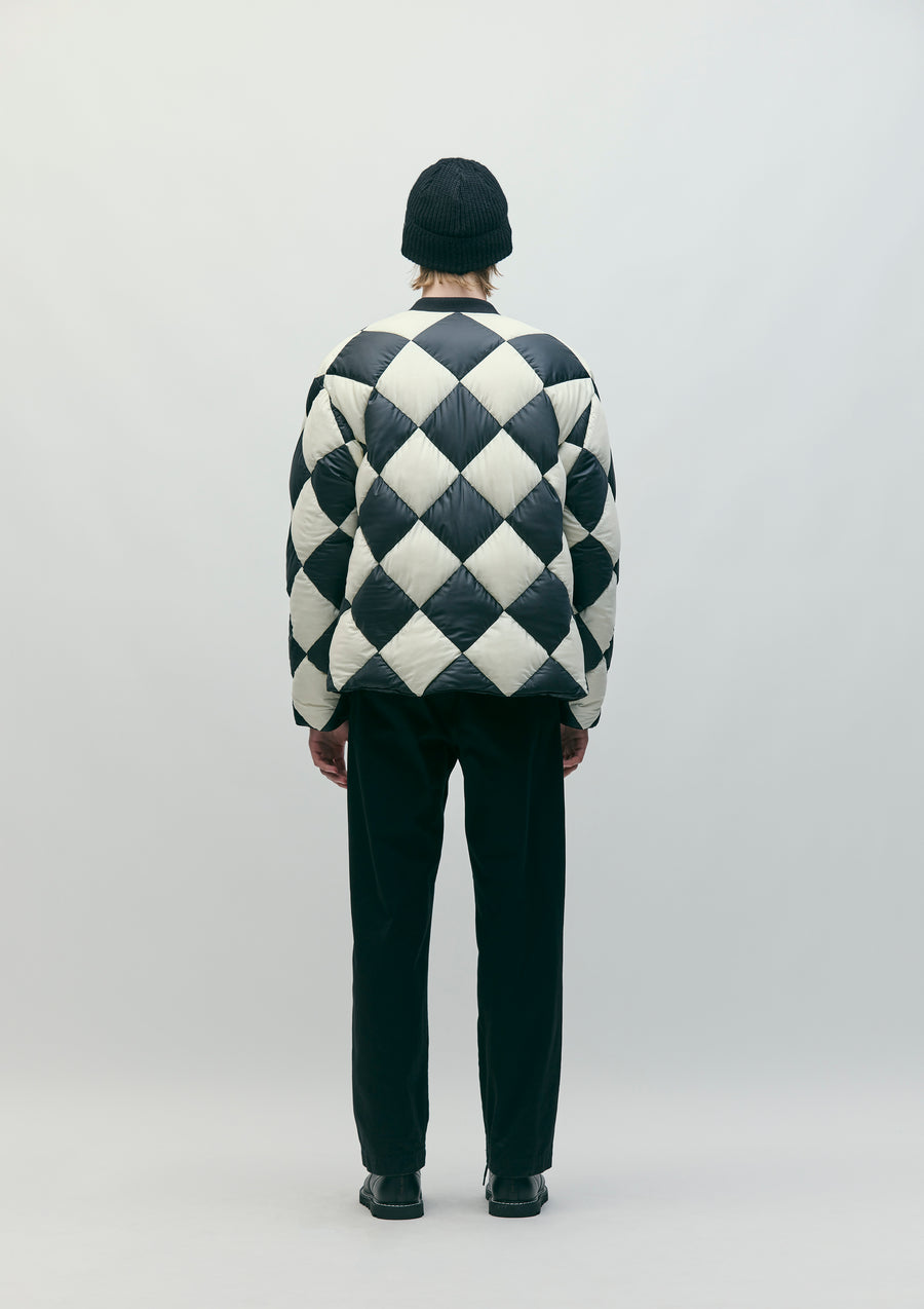 A checker down jacket made from high-density woven fabric, offering water repellency and anti-static properties while maintaining a soft texture. The checker pattern is constructed by filling each square with down and stitching them together. The front features two rows of adjustable snap buttons. The logo is printed on the body. A brand tag is attached to the side seam.